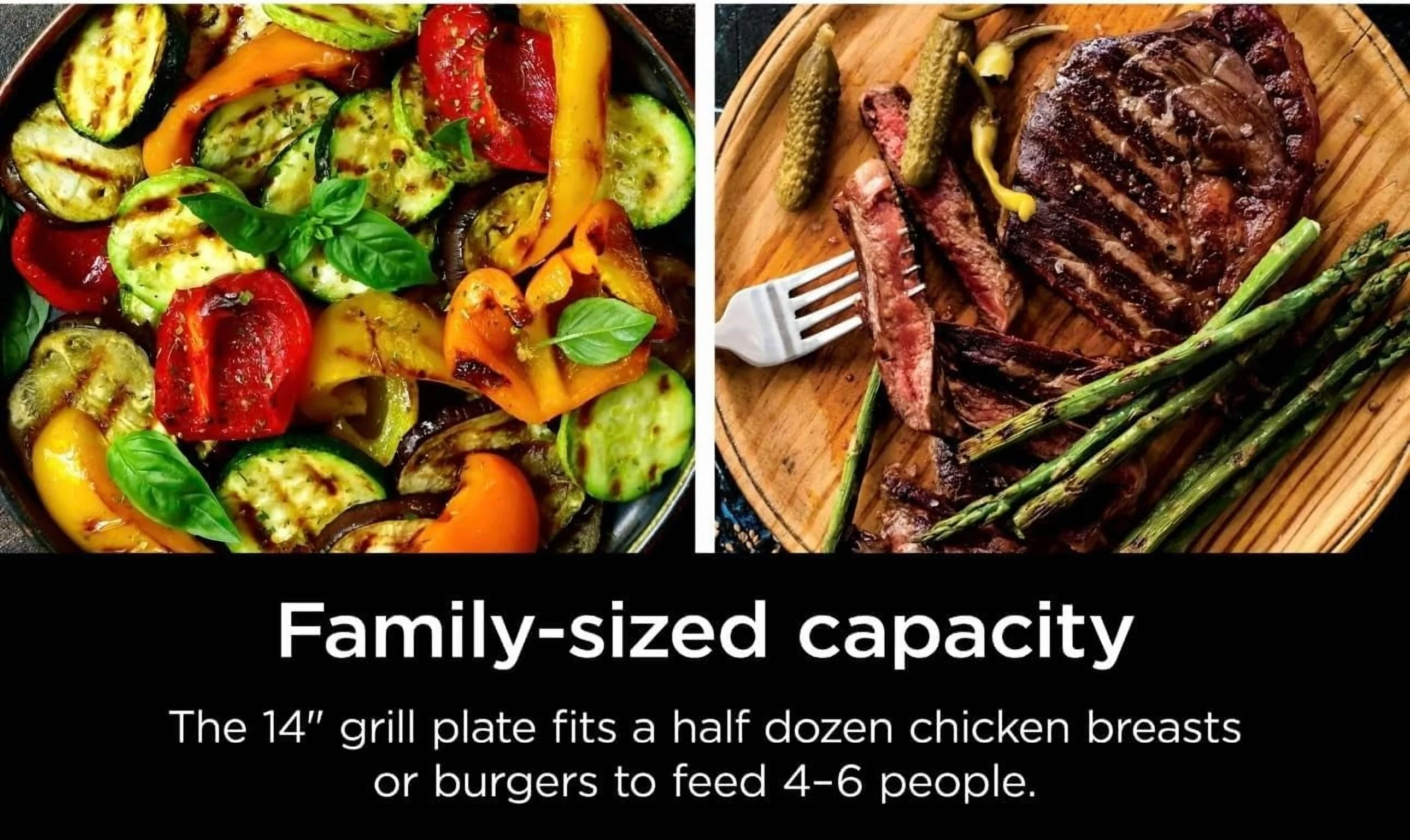 - FAMILY-SIZED CAPACITY: The 14 grill plate fits a half dozen burgers and chicken breasts to feed a family of 4-6 people