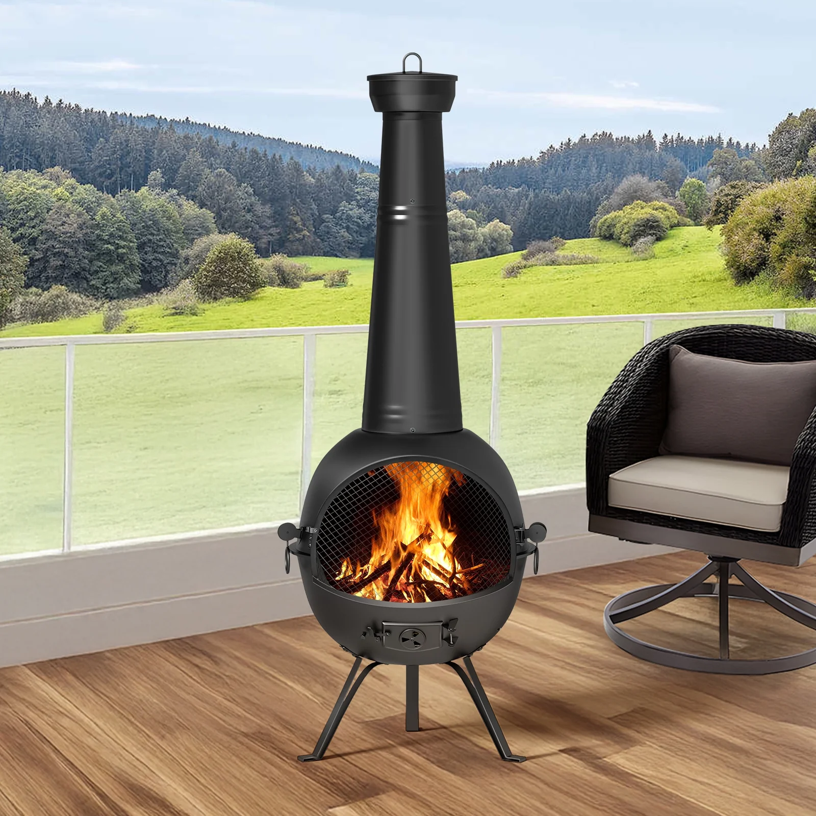 - KEY FEATURES:��Durable Construction��Made from high-quality solid cast iron, this chiminea is built to last, featuring a high-temperature paint finish that resists rust and ensures long-term durability.��Tall Smoke Pipes with Cover��The 26-inch tall smoke pipes help direct smoke and sparks away from your seating area. The protective cover prevents rainwater damage and reduces rust.��Adjustable Air Vent��The air vent allows you to control airflow, helping regulate fire intensity and burn time for a customized outdoor experience.��User-Friendly Design��With a specially designed extended door handle, adding firewood is easy and safe, even when the fire is burning, preventing burns to your hands.��Complete with Protective Cover��The chiminea includes a protective cover to keep it safe from the elements when not in use, extending its lifespan.��Perfect for Outdoor Spaces��Ideal for patios, decks, or backyards, this chiminea creates a cozy atmosphere while providing efficient heat for cooler evenings.