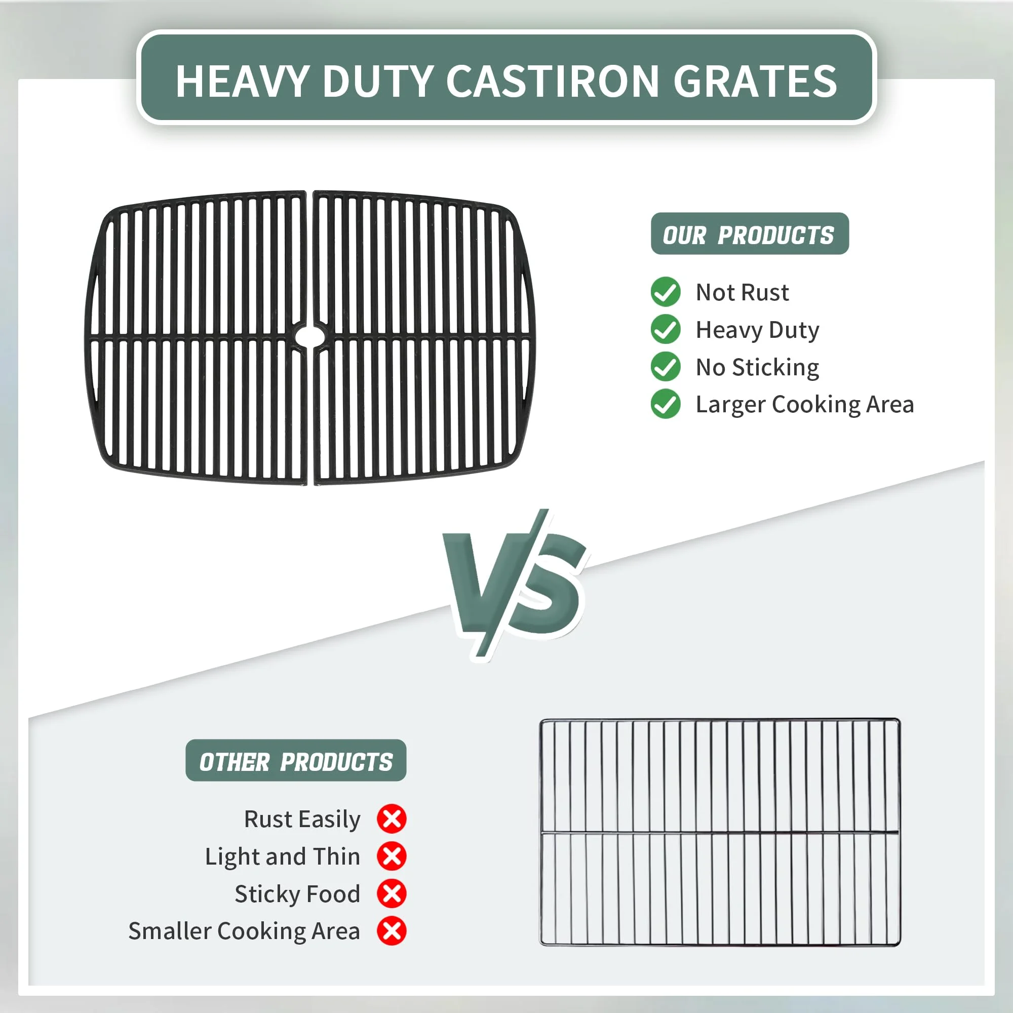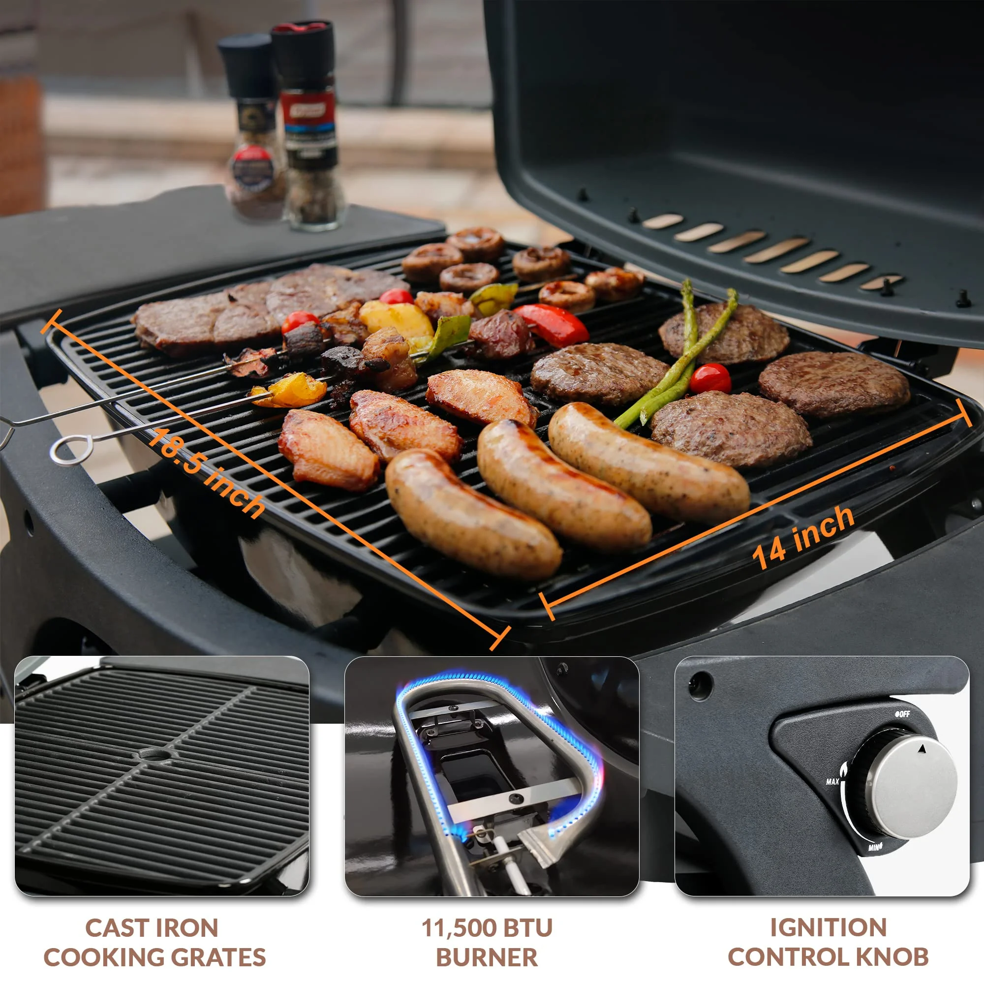 - COOKING SYSTEM - This propane gas grill Includes powerful U-shaped stainless steel burners, total output 11500 BTU, two cast iron grates are perfect to cook meats, seafood, or veggies on the 266 sq in cooking space, hose and regulator included