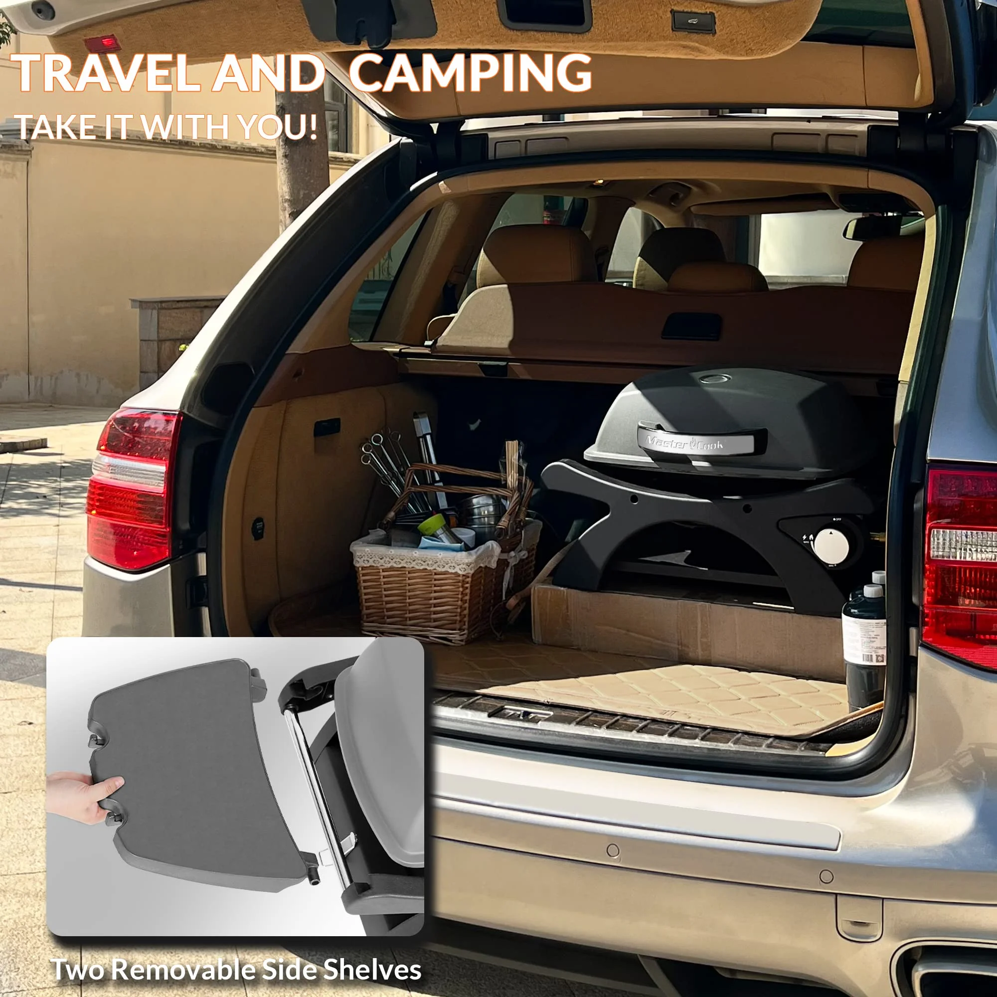- FEATURES - Two removable side shelves keep utensils and sauces handy can hold up to 4.4 lbs, built-in temperature gauge for ideal roasting and creates even heat, helps the food well-done at all time
