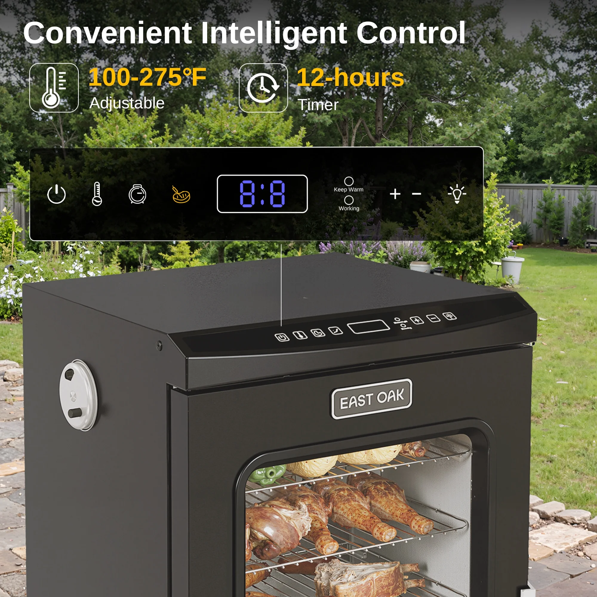 Visual glass door : directly observe the food in the smoker.