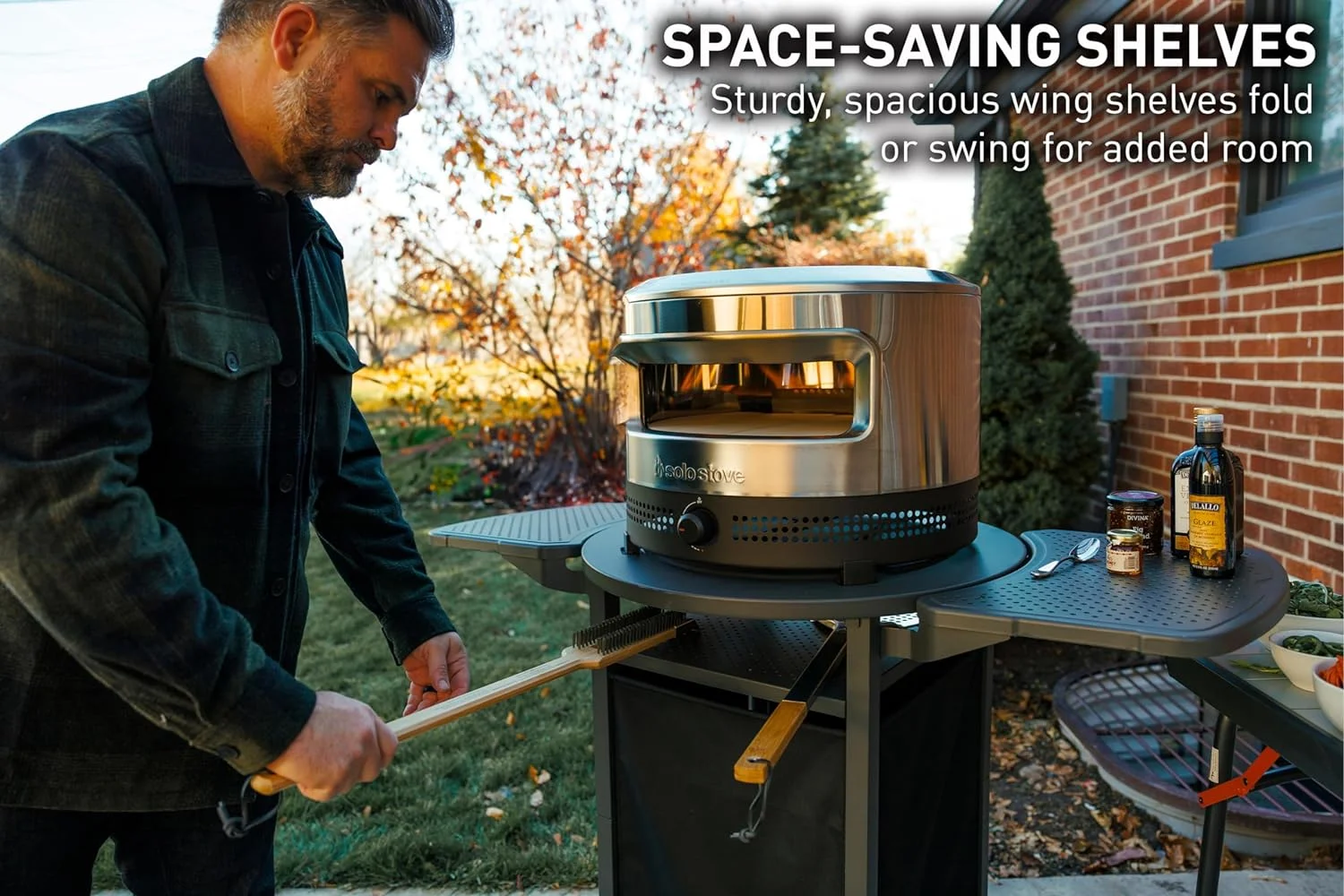 - SPACE-SAVING SHELVES: Strong, roomy wing shelves can be folded down for convenient storage when not in use, and easily swing into place to provide extra space for tools and toppings.