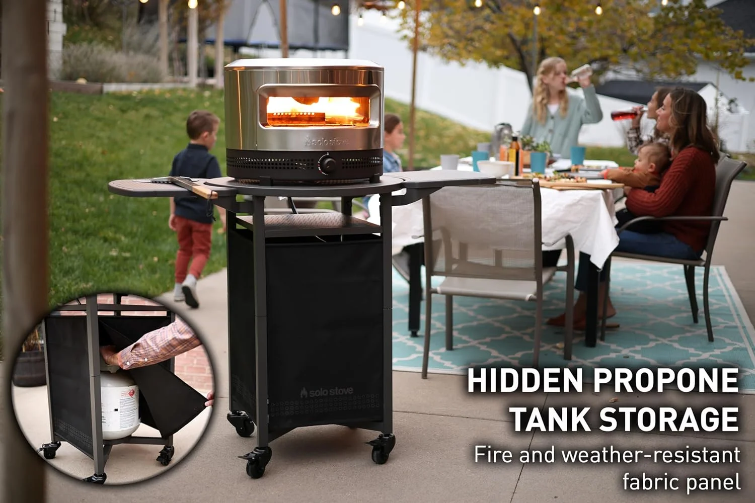 - HIDDEN PROPONE TANK STORAGE: Keep your propane tank mobile and easily accessible behind a stylish, discrete, magnet-secured fabric panel that��s fire- and weather-resistant.