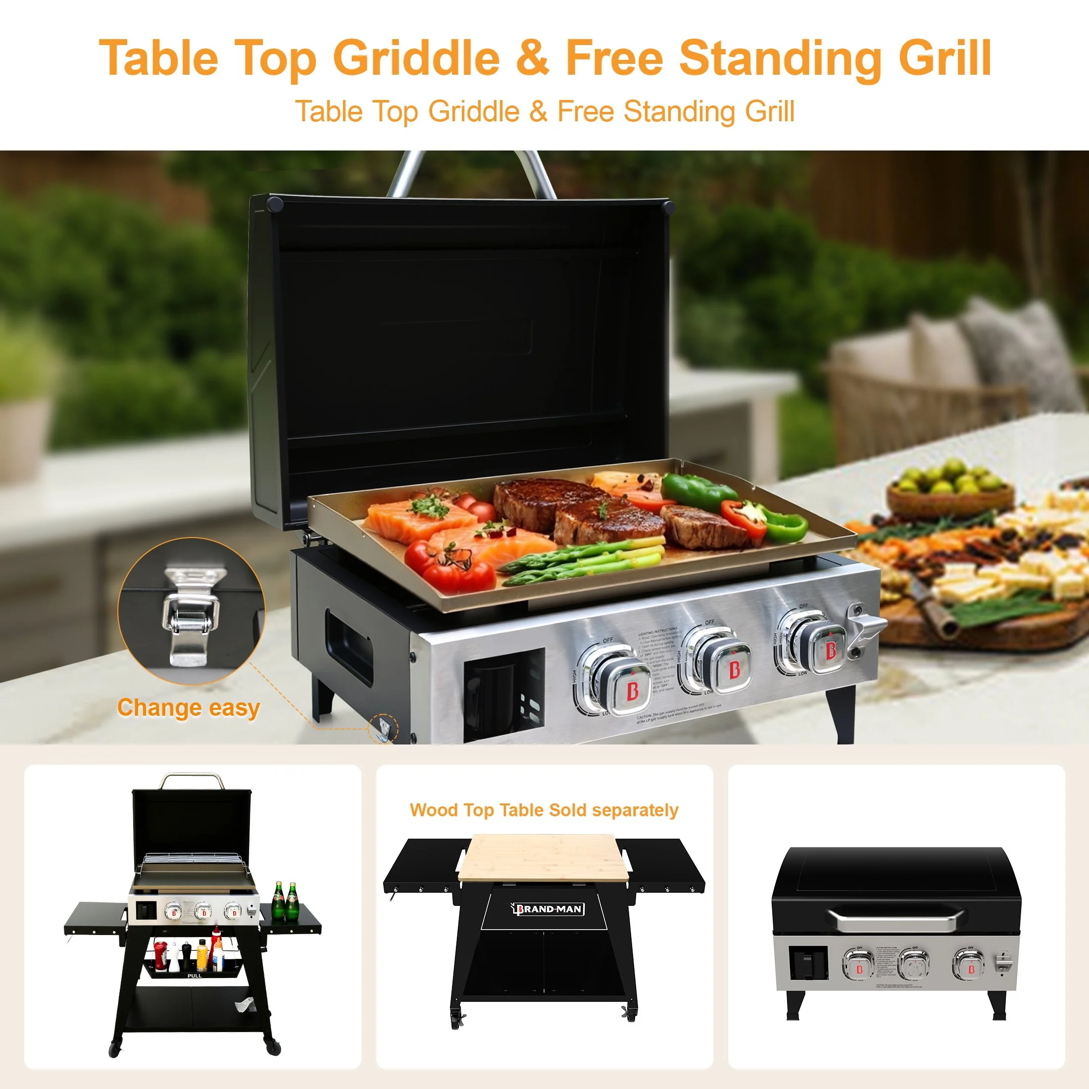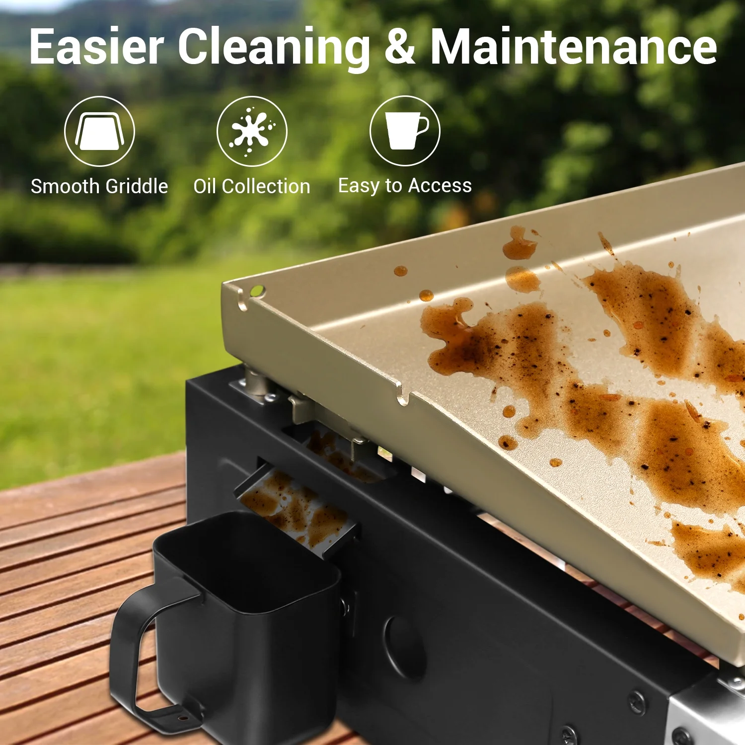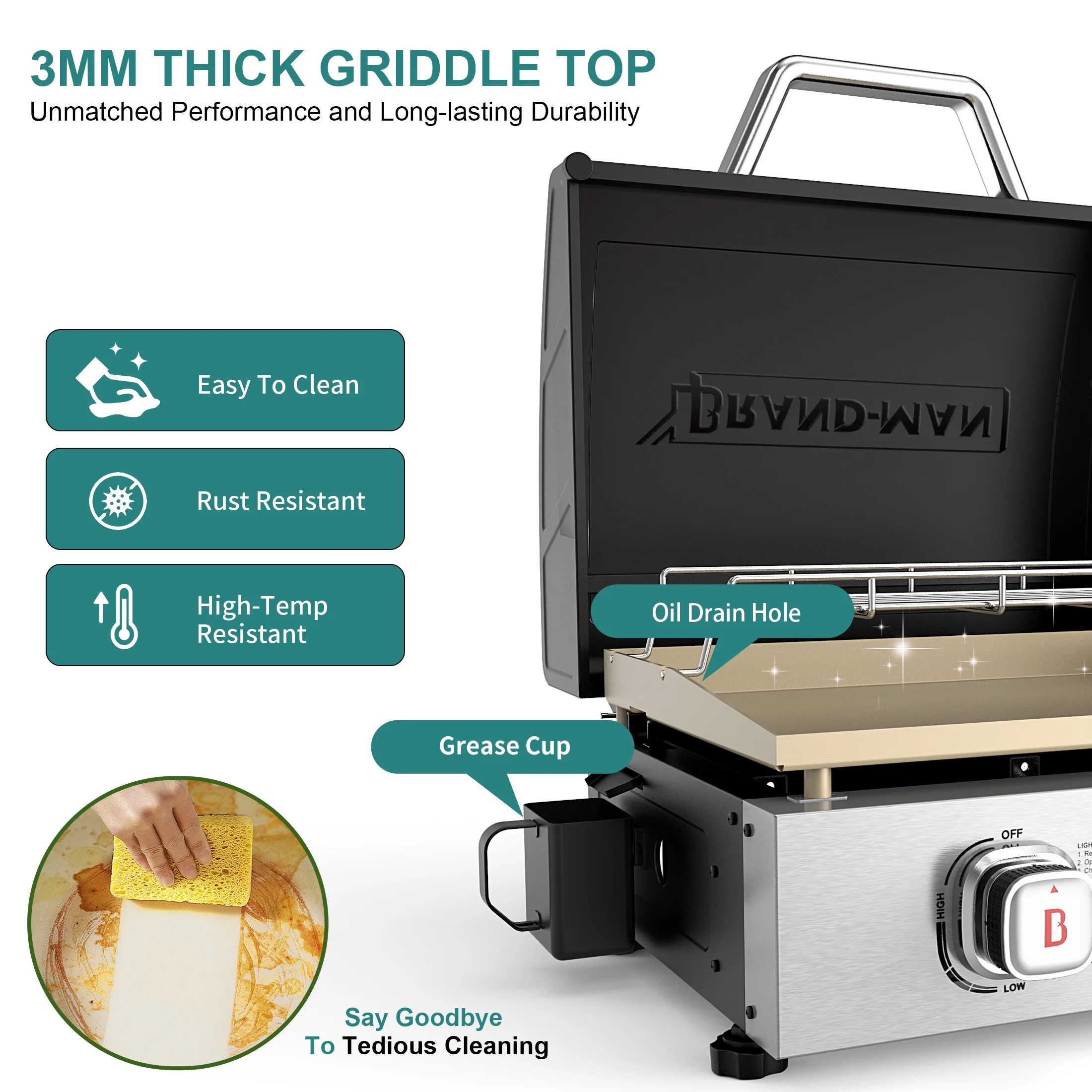 - Easy-Clean BRAND-MAN Design: Slide-out grease cup collects drippings, and the flat griddle surface wipes clean quickly with a paper towel, simplifying cleanup after use.