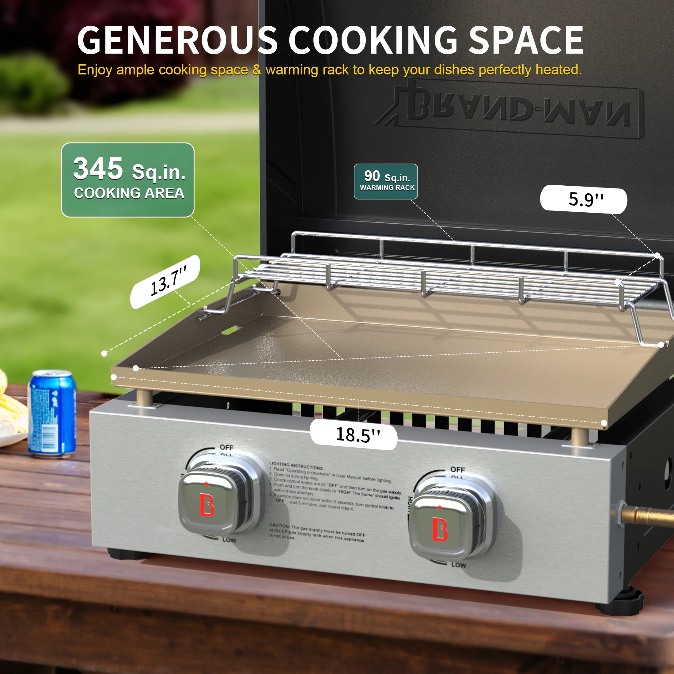 - Spacious Tabletop Griddle: Provides 345 sq. in. of cooking space and a 15.4 x 5.9 in. warming rack, ideal for preparing multiple dishes and keeping food warm during outdoor cooking.