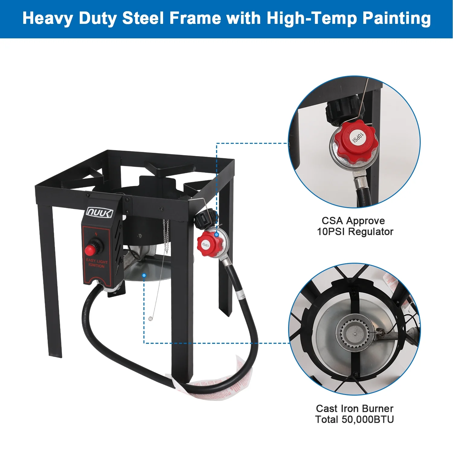 Strong burner performance: Equipped with a heavy-duty cast iron burner with a heat output of 50,000 BTU, it can quickly boil oil and water. The CSA-certified 10 PSI regulator and hose provide a stable and consistent airflow, and the BTU needed for each perfect cooking can be obtained by adjusting the regulator.