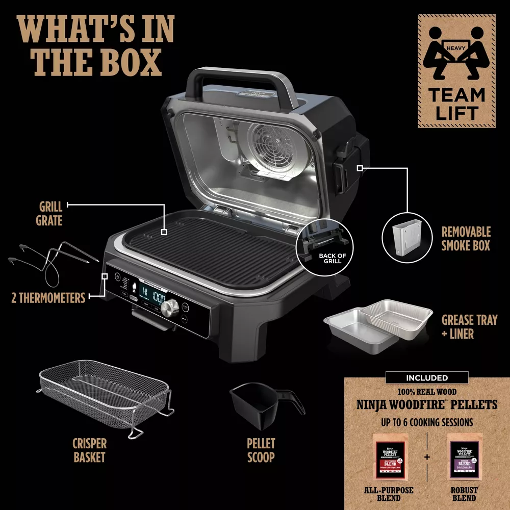Enjoy your cookout with the fully connected Ninja Woodfire Pro Connect Premium XL Outdoor Grill & Smoker. With Ninja ProConnect, monitor and control the cooking of 2 different proteins, get real-time notifications to your phone, and even access recipes and cooking charts, all from the palm of your hand. Master Grill, BBQ Smoke, and Air Fry with 100% authentic smoky flavor you can taste.