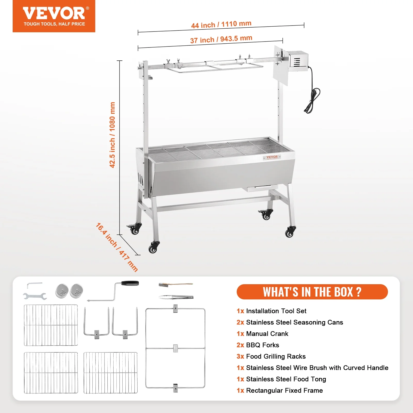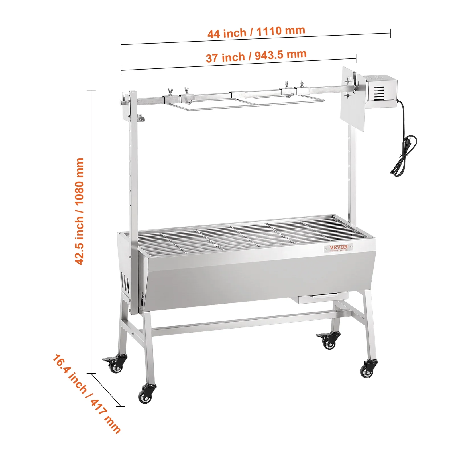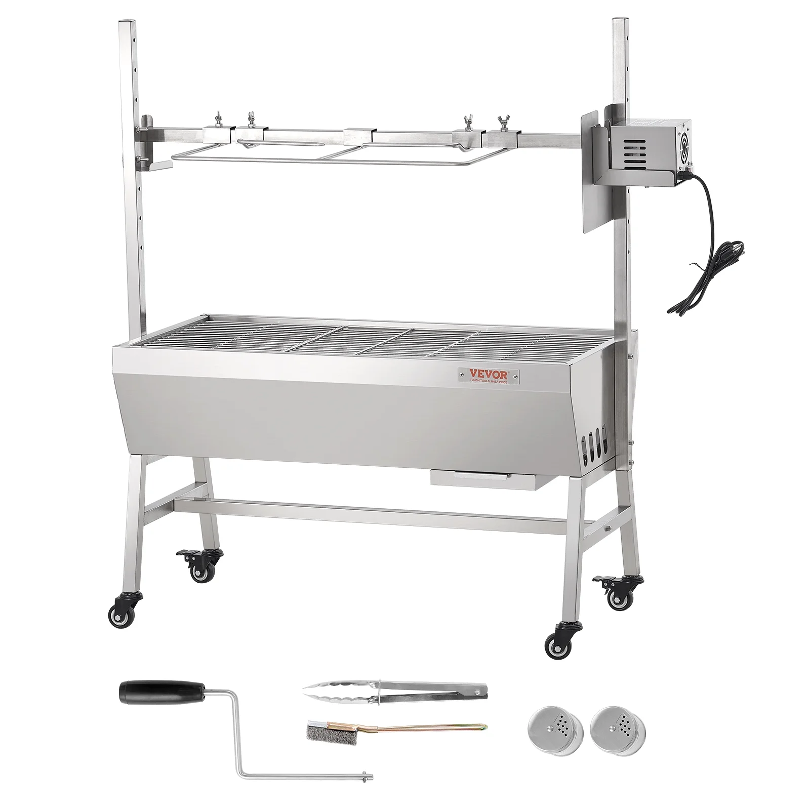 VEVOR Upgrade Rotisserie Grill, 35 in 90 lb Capacity, BBQ Whole Pig Lamb Goat Charcoal Spit Grill, Electric 42W Motor Stainless Steel Rotisserie Roaster with Lockable Wheels, for Camping Outdoor