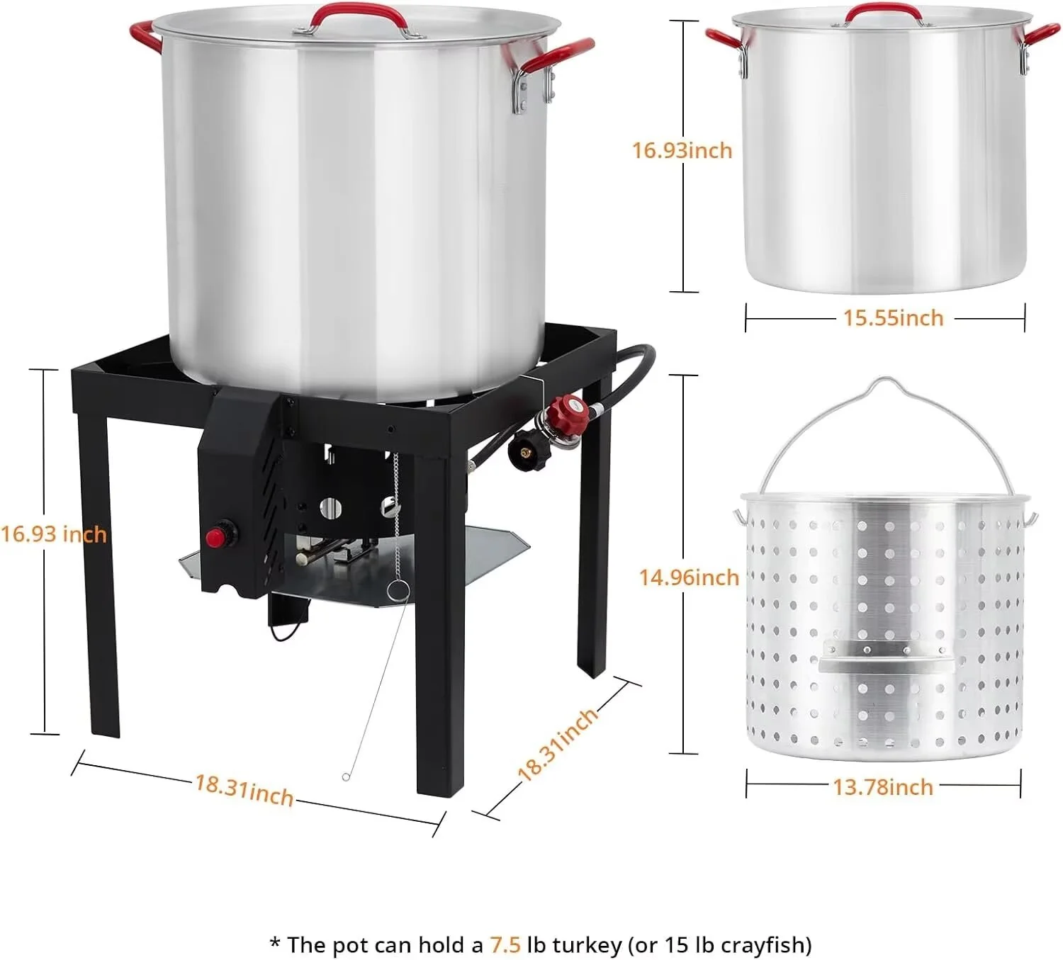 - Complete Cooking Set: This comprehensive kit includes everything you need for a successful seafood boil: 1 x 60Qt Aluminum Pot with Lid; 1 x Gas Stove Burner Stand with Hose and Regulator; 1 x Support Rack; 1 x Steamer Baskets.