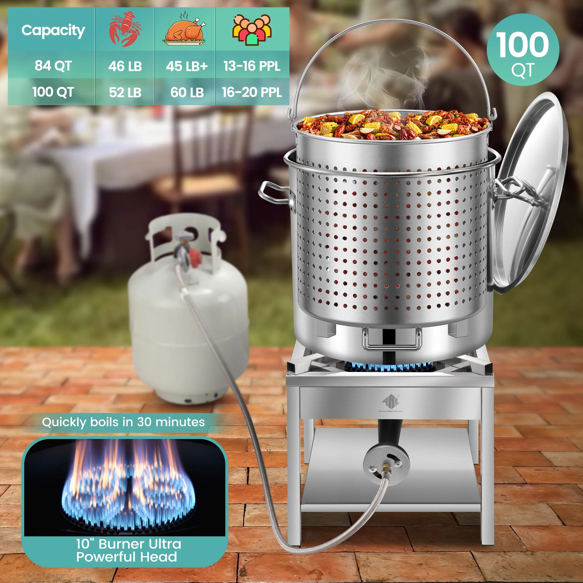 100QT Stainless Steel Seafood Boil Pot with 200, 000BTU Propane Burner, W/Basket for Outdoor Deep Fryer, Large Cooking Pot for Turkey Fryer, Crab, Crawfish, Shrimp, Lobster Boiling Stock Pot