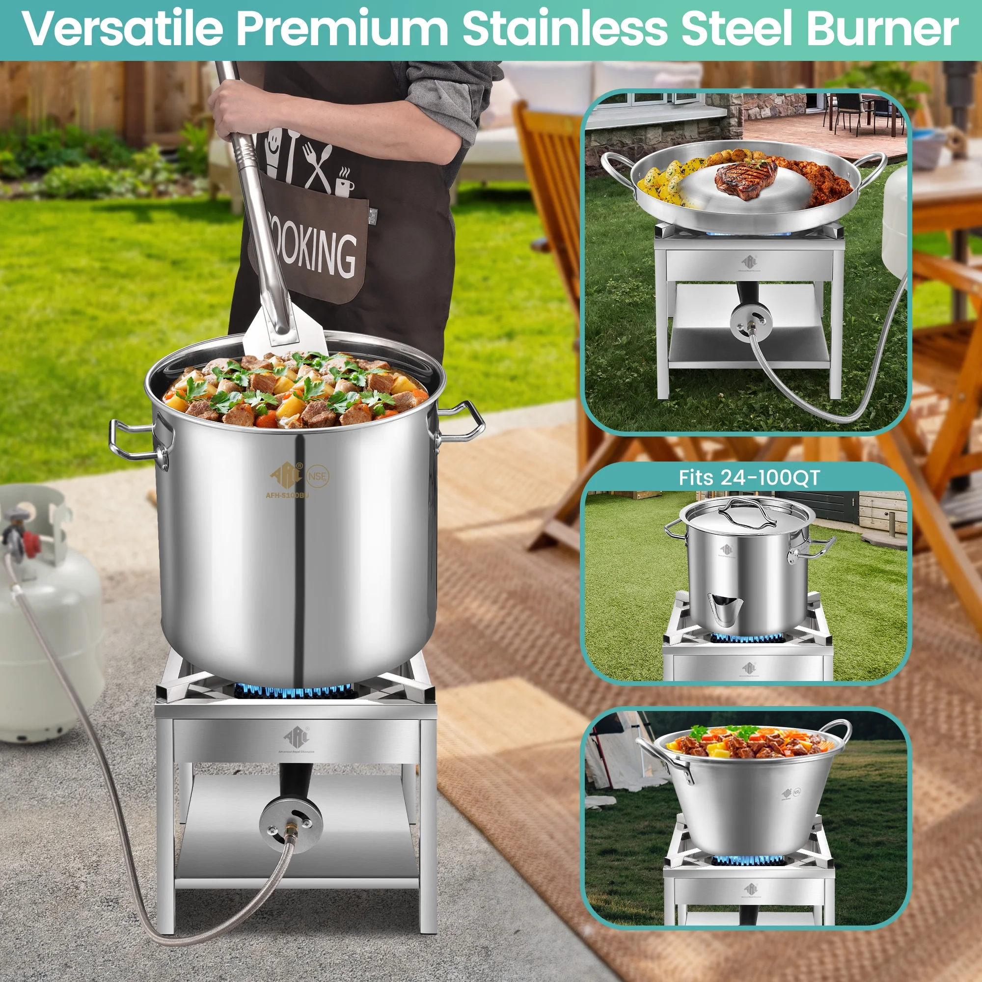 - NON-ASSEMBLY HIGH-PRESSURE BURNER: 200,000BTU Stired fry wok burner with large burner head provides fast and even heading. A pot of seafood can be boiled in 35 minutes. Ultra sturdy form can hold up to 200lb