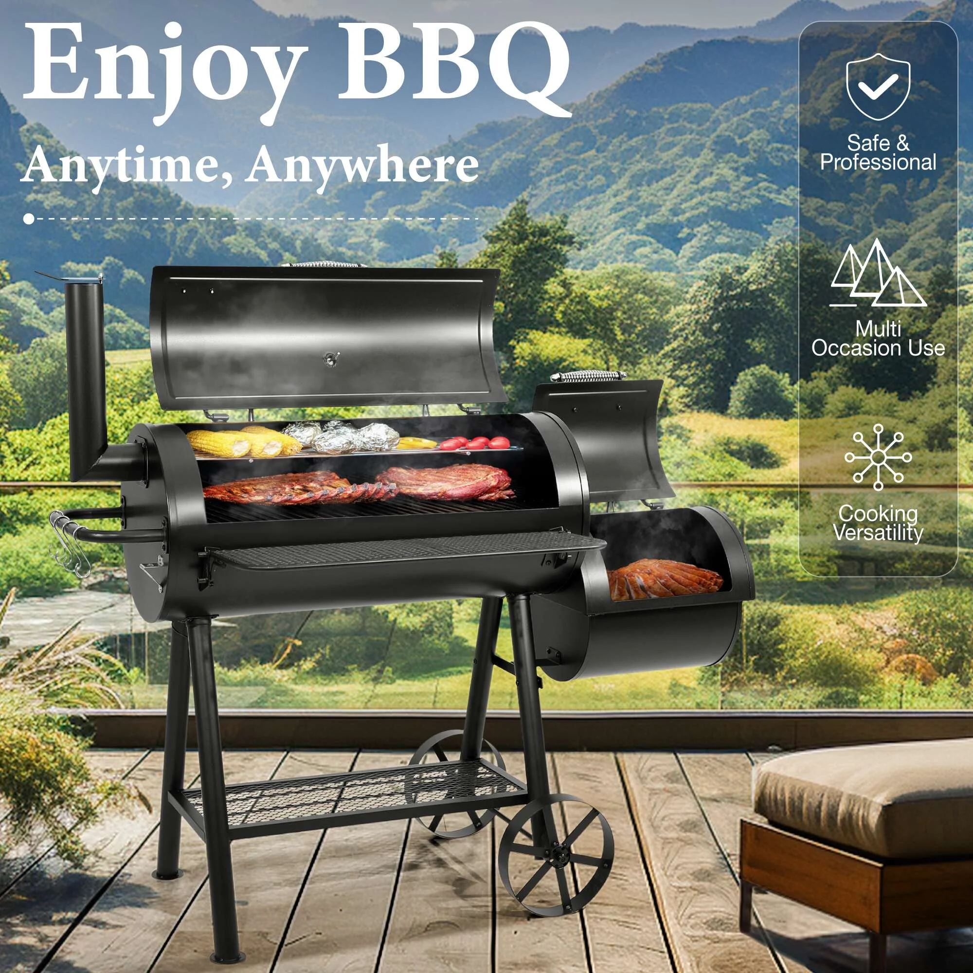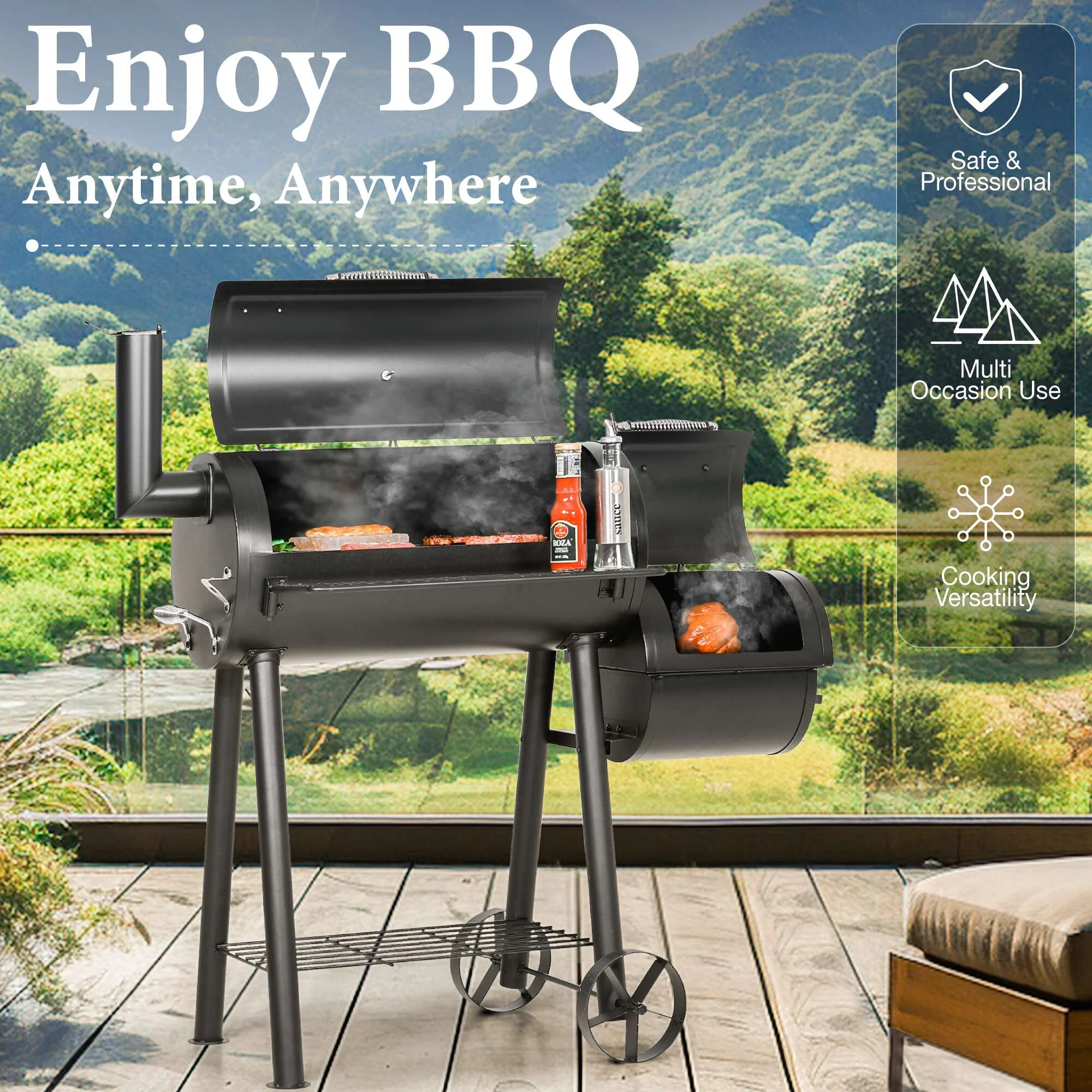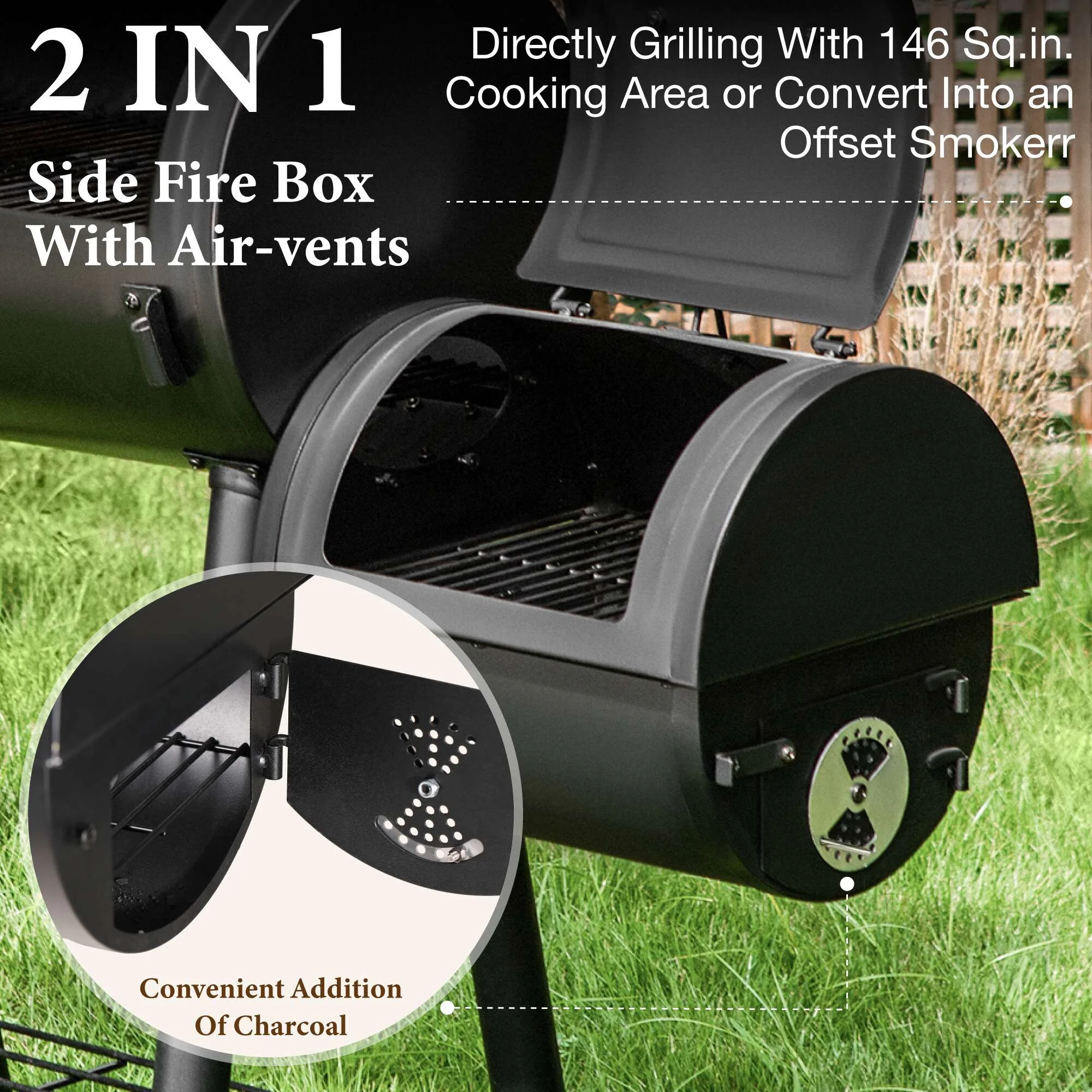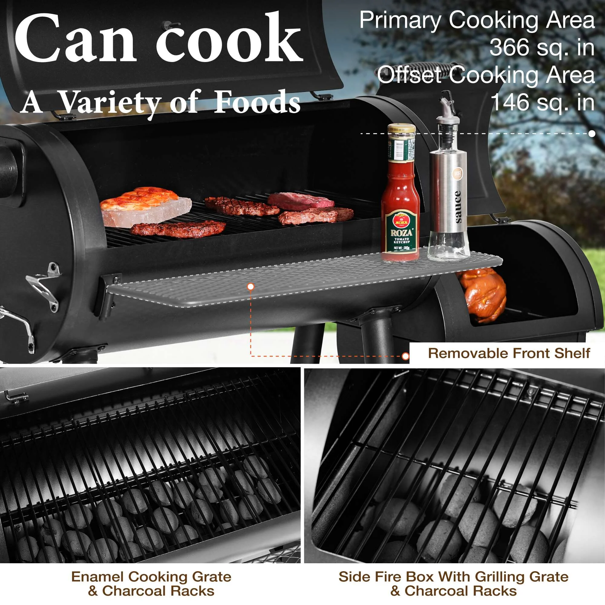 - ��Charcoal Grill��With a firm combination of offset smoker, this charcoal grill delivers excellent performance. Experience grilled and smoked meat at the same time with no hassle.