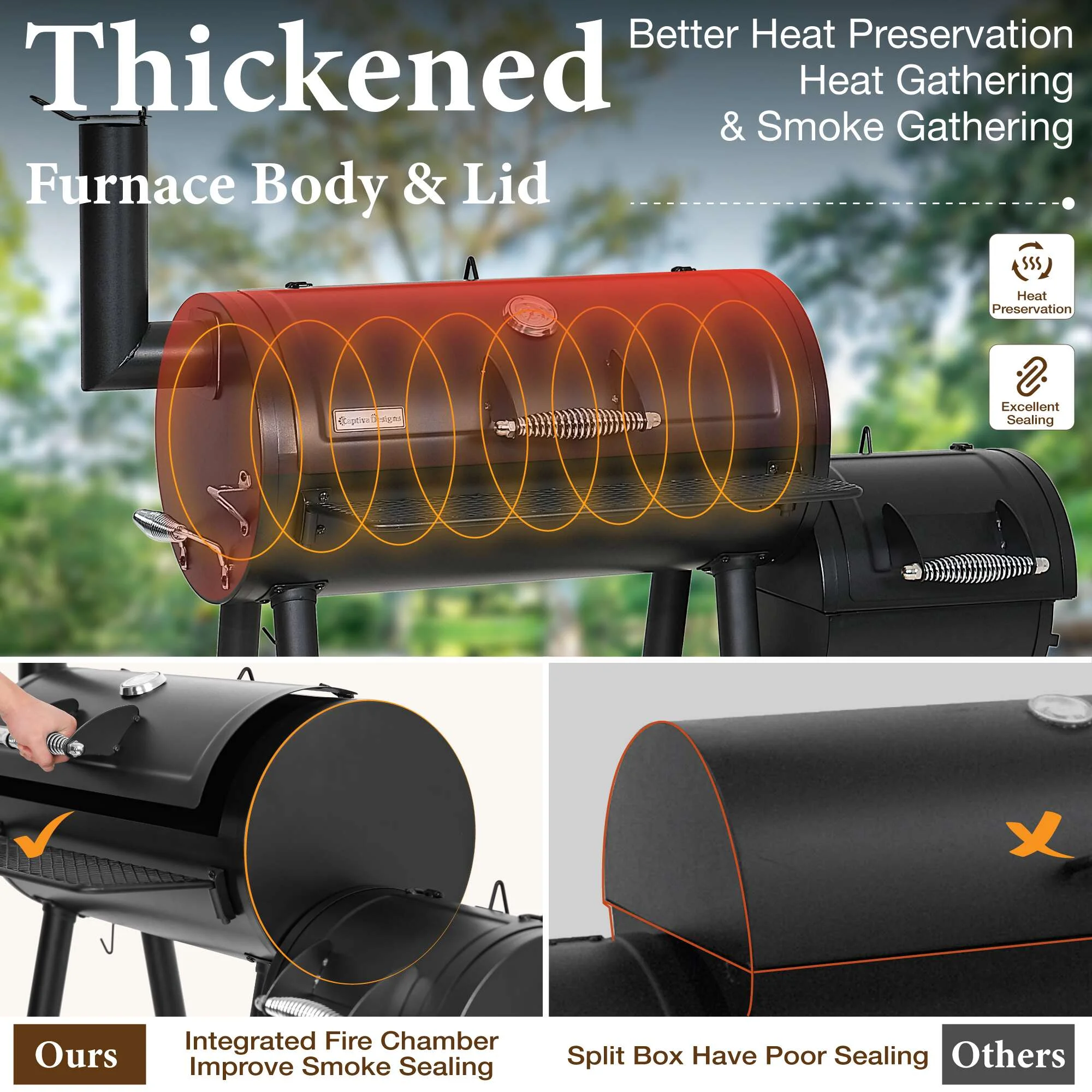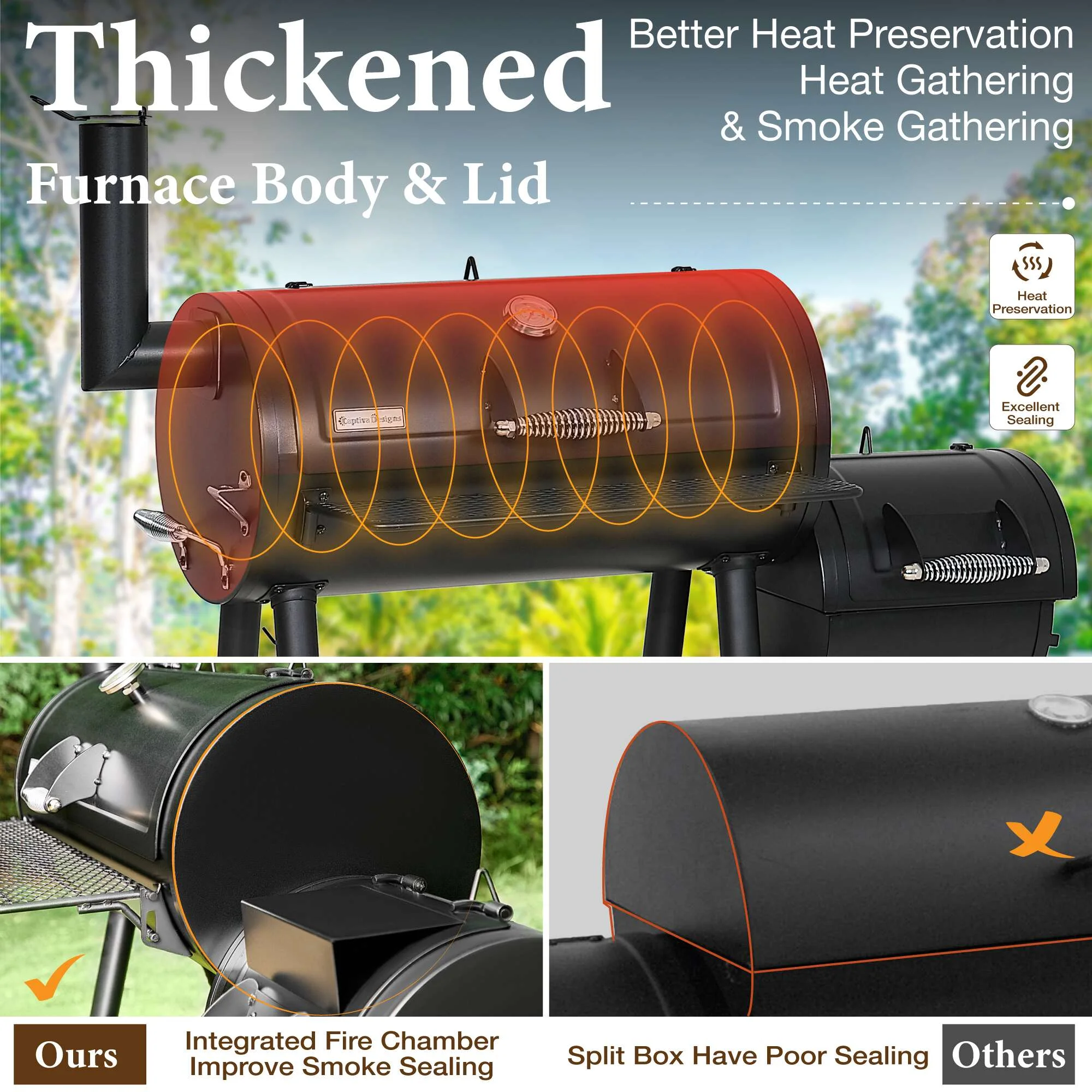 - ��Heavy Duty Smoker��Specially thickened steel is used for our heavy duty smoker. With 1.2mm thick body steel and 3mm lid, it has a total weight of 117 lbs. Therefore, the heavy-duty smoker has good heat preservation effect, and also more stable and safer.