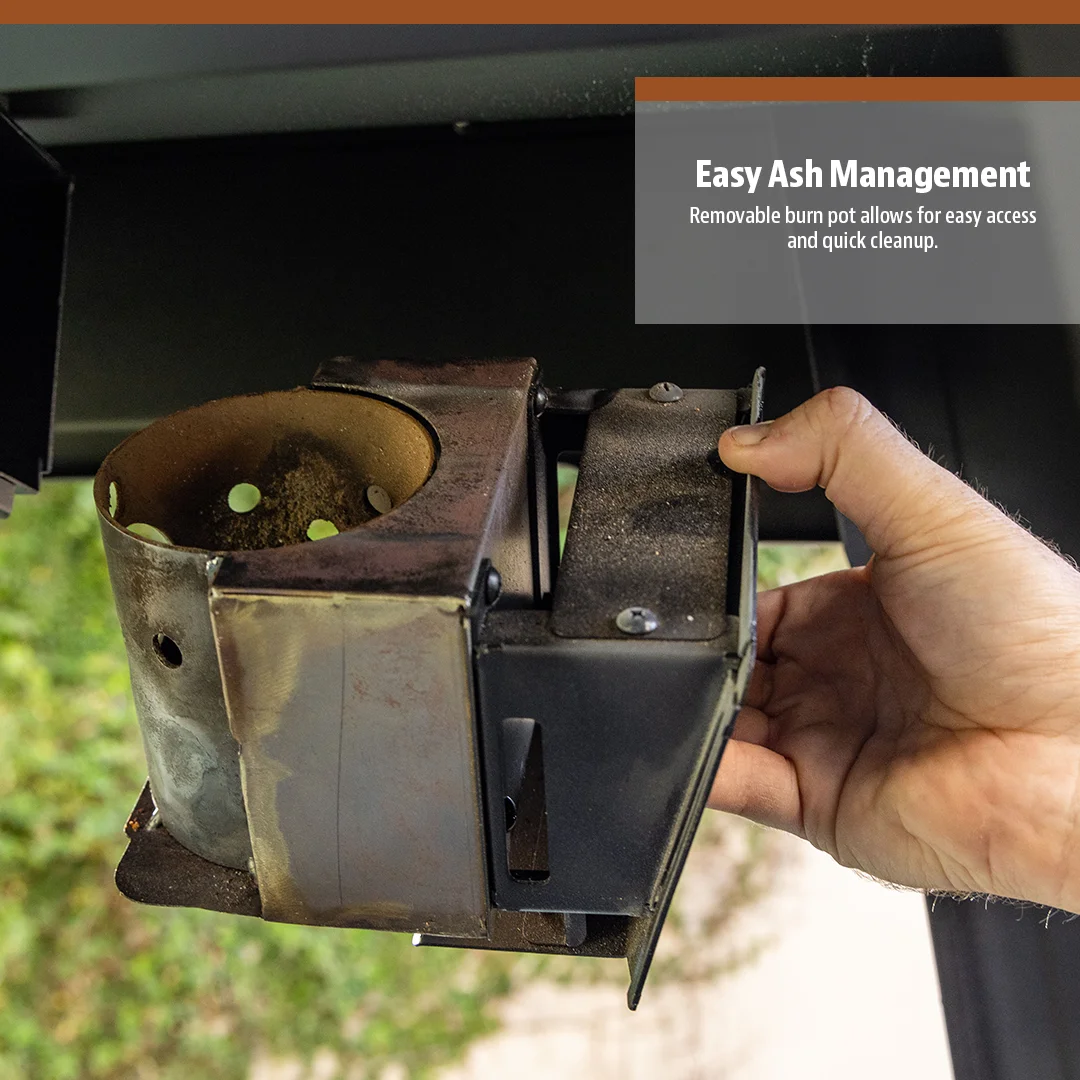- The undermount, removable burn pot allows for easy access and quick clean up