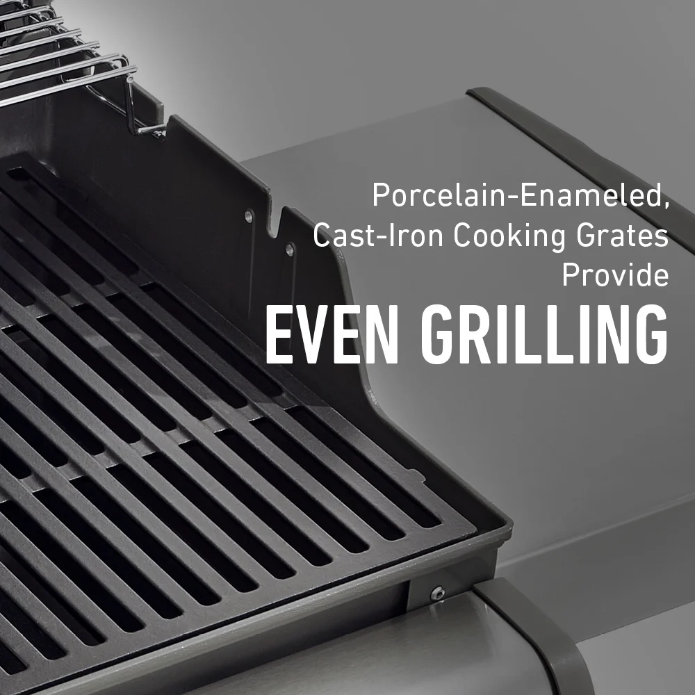 Porcelain-enameled, cast-iron cooking grates retain even heat for the best tasting food. The porcelain-enamel coating is easy to clean and built to last.