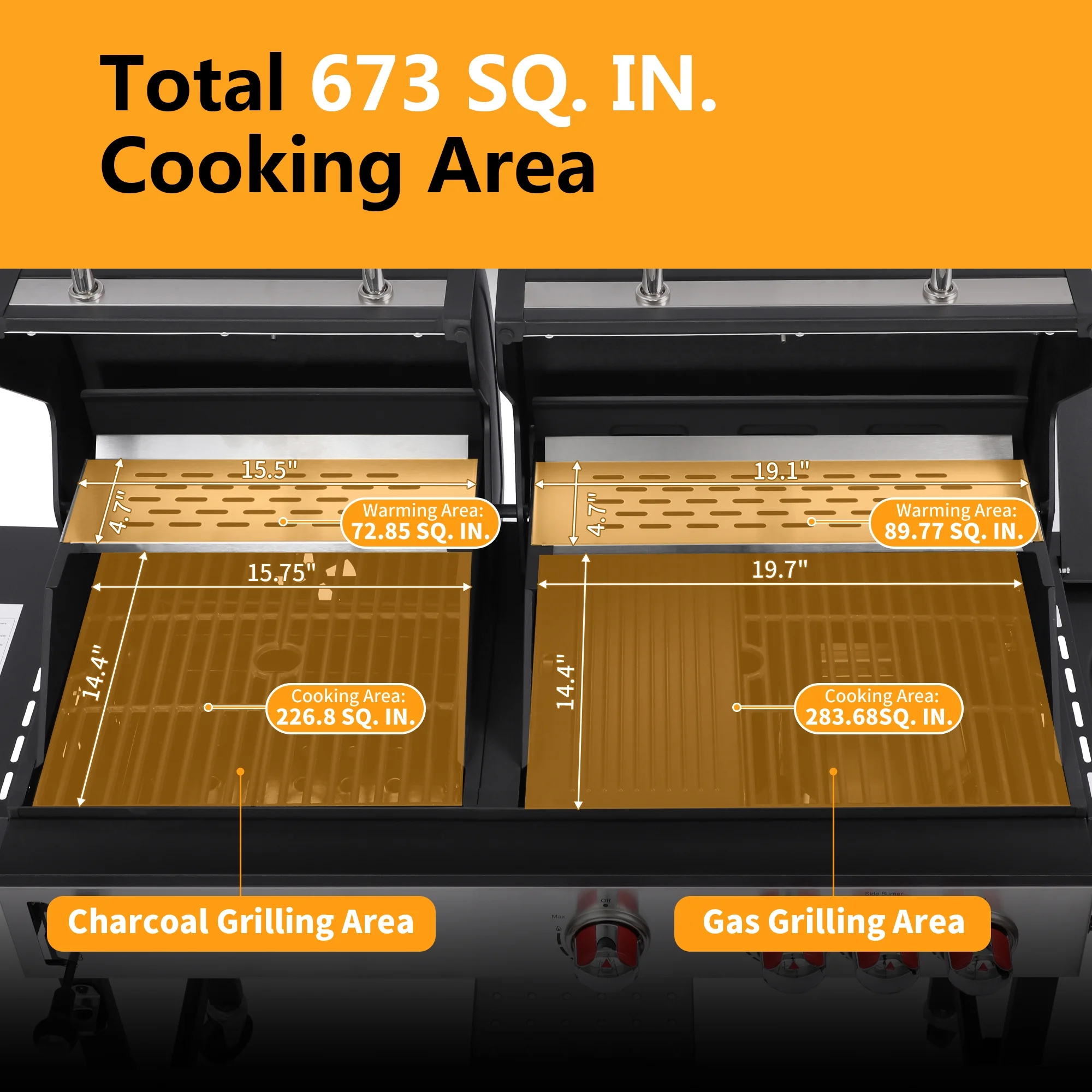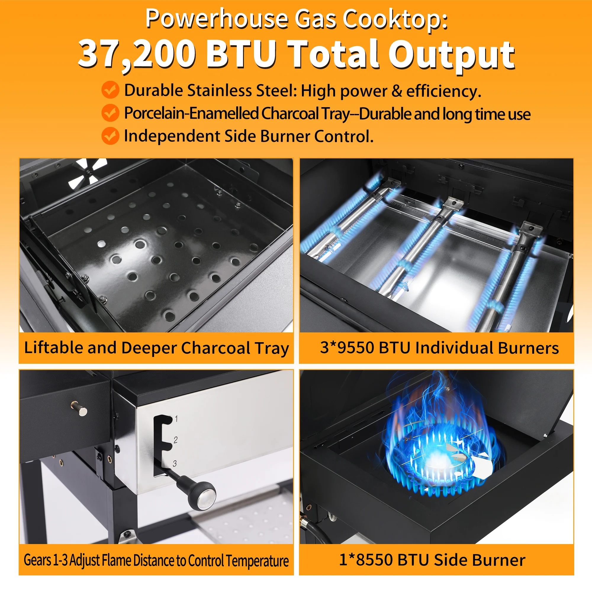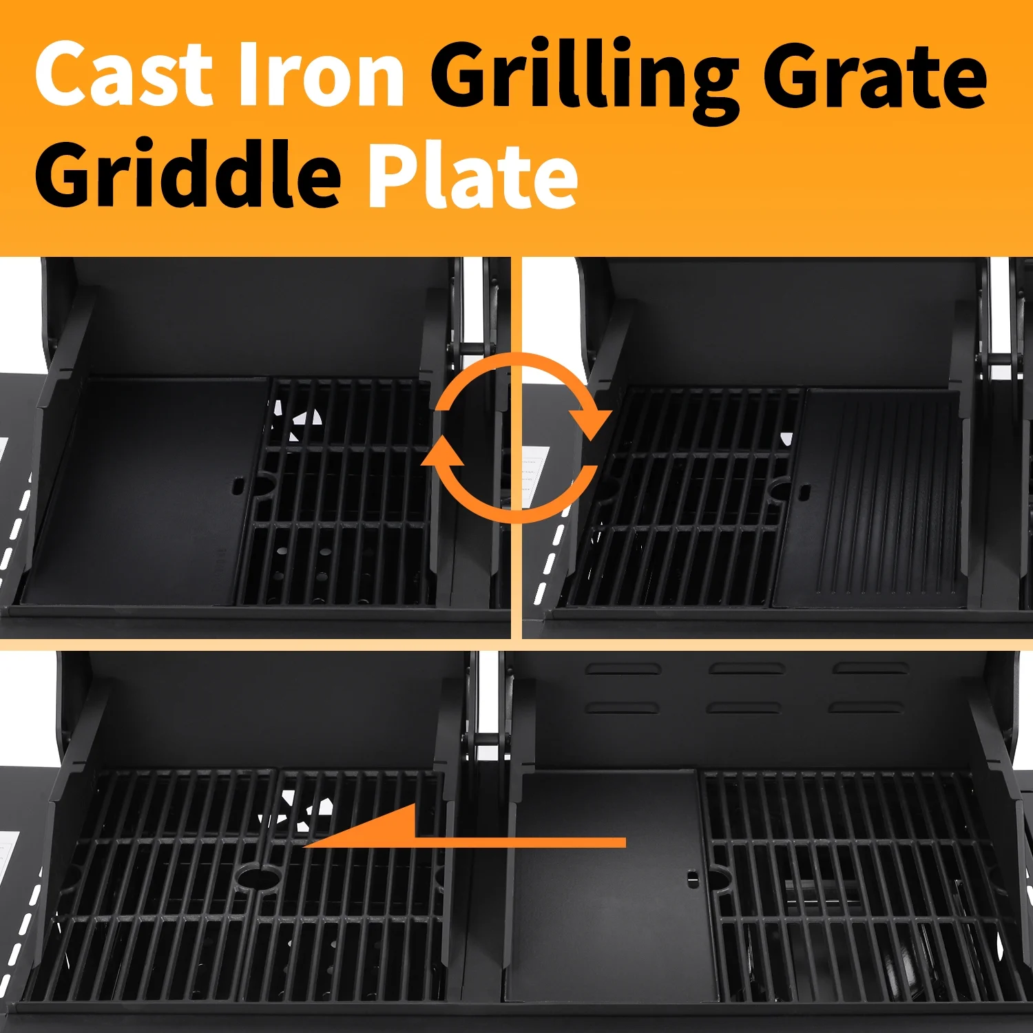 3 Burner Gas & Charcoal Combo Grill with Side Burner, Outdoor BBQ Propane Grill, 673 Sq. In. Cast Iron Grates & Reversible Griddle, 37200 BTU Stainless Steel Lid for Backyard Cooking