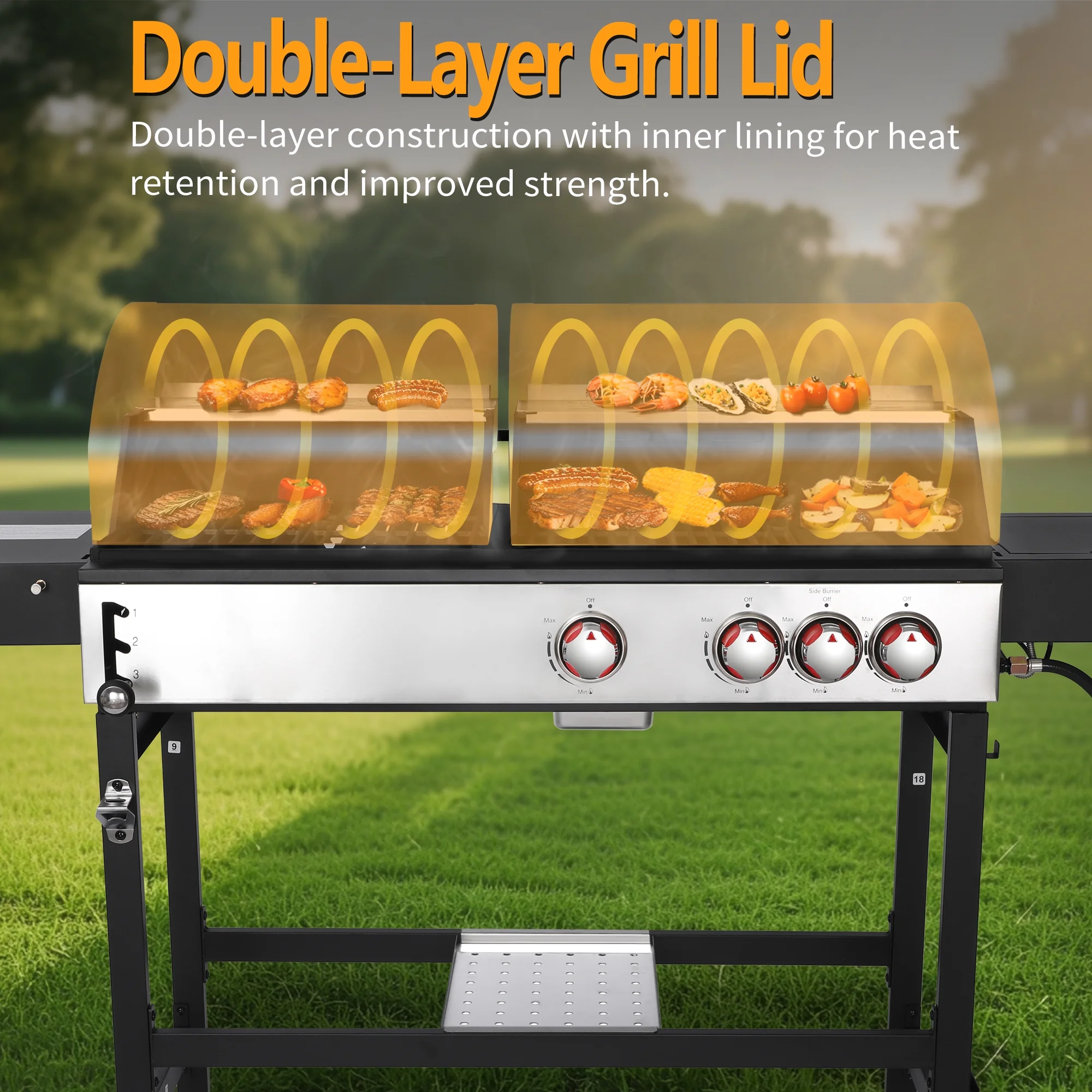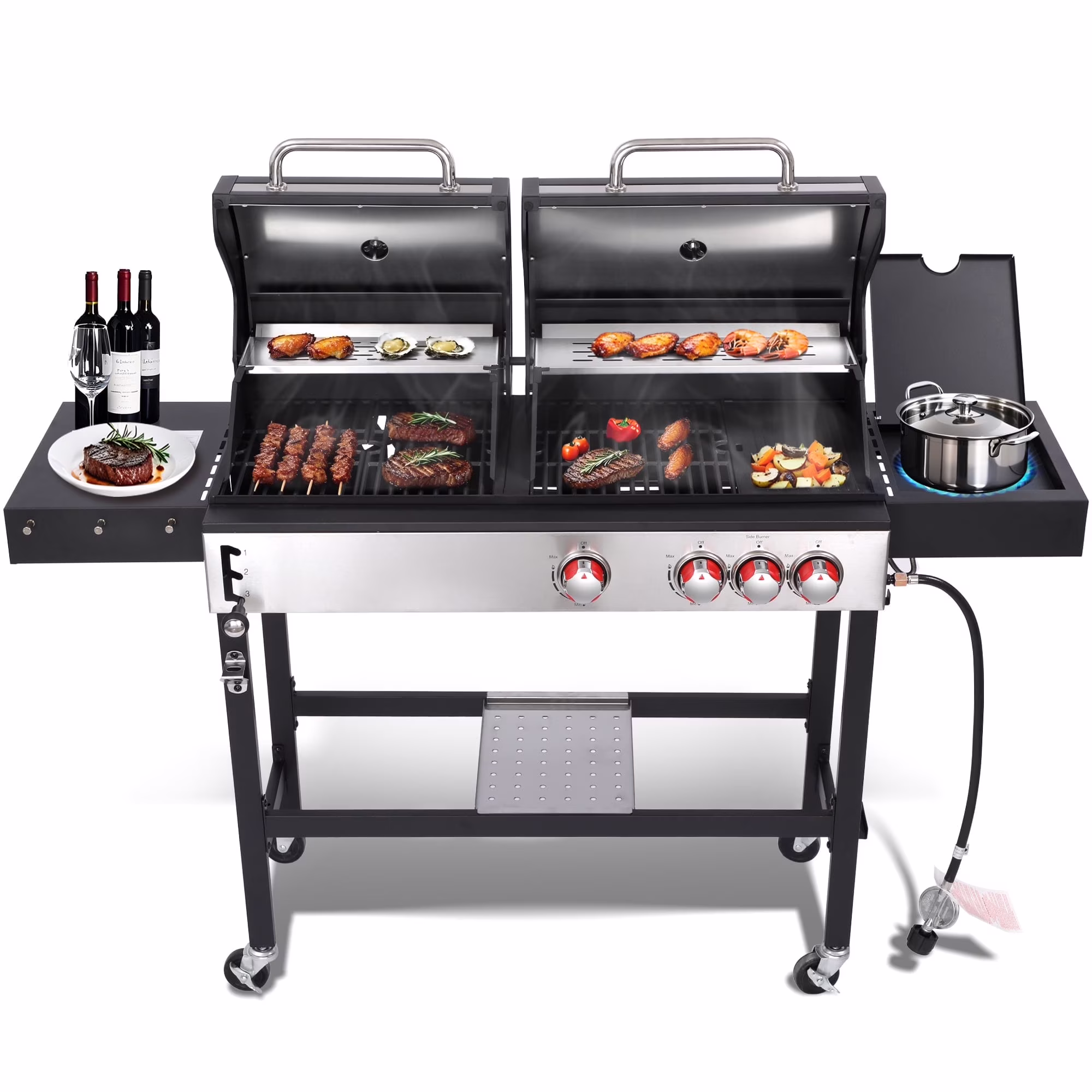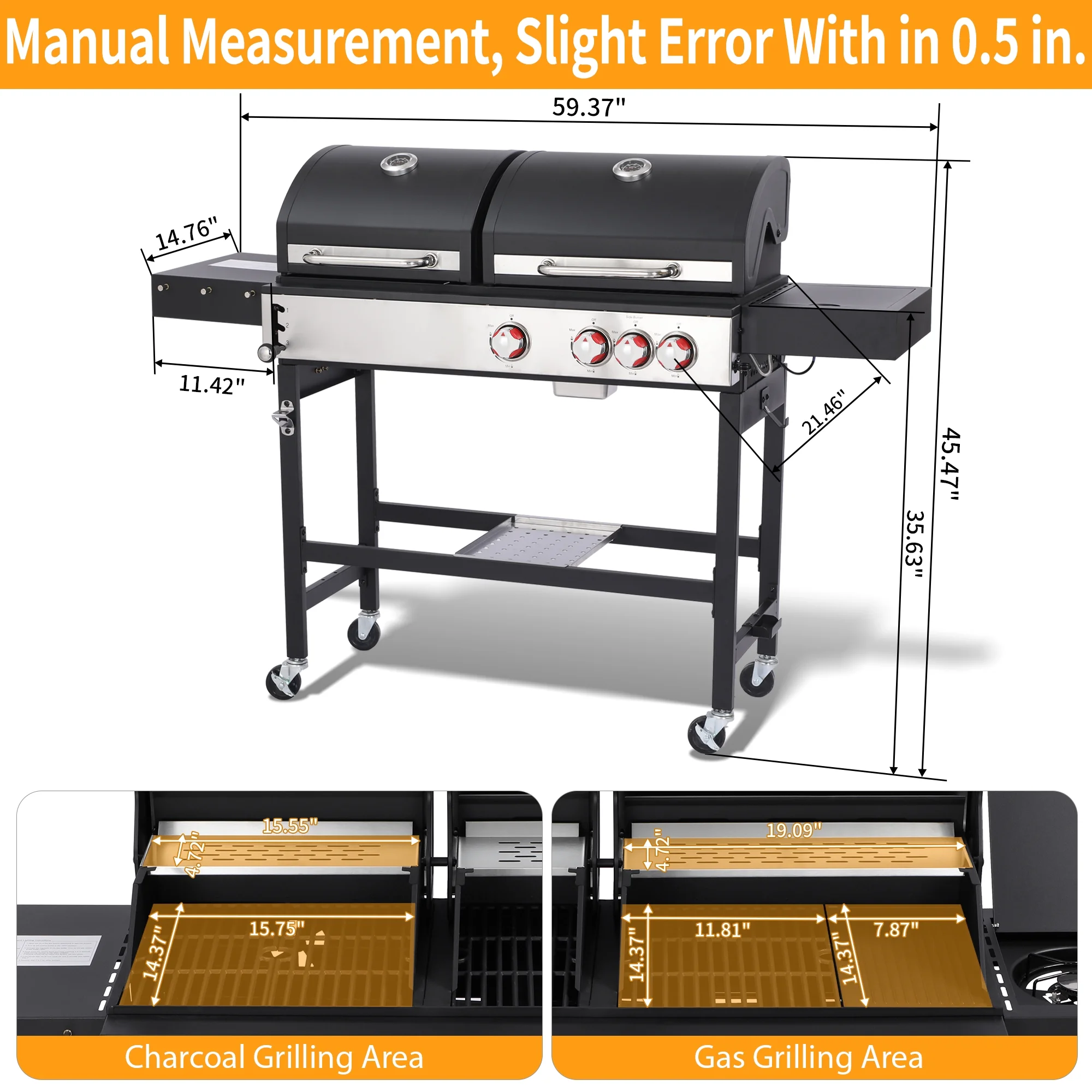 3 Burner Gas & Charcoal Combo Grill with Side Burner, Outdoor BBQ Propane Grill, 673 Sq. In. Cast Iron Grates & Reversible Griddle, 37200 BTU Stainless Steel Lid for Backyard Cooking