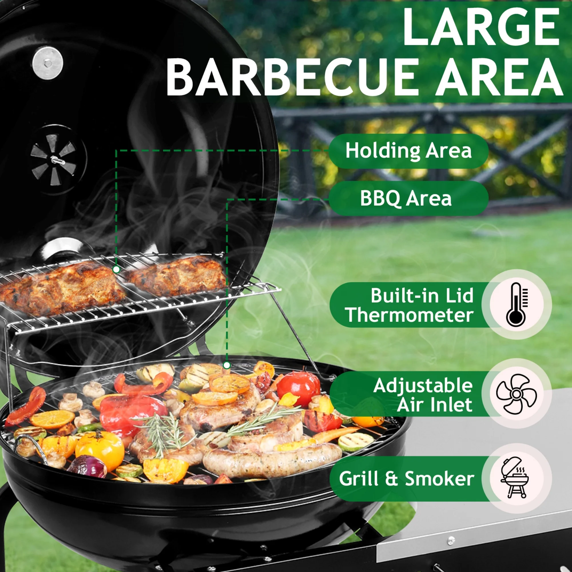 �� Fine-tune the flames using dual vents and track progress with the top-mounted thermometer for consistent results.
