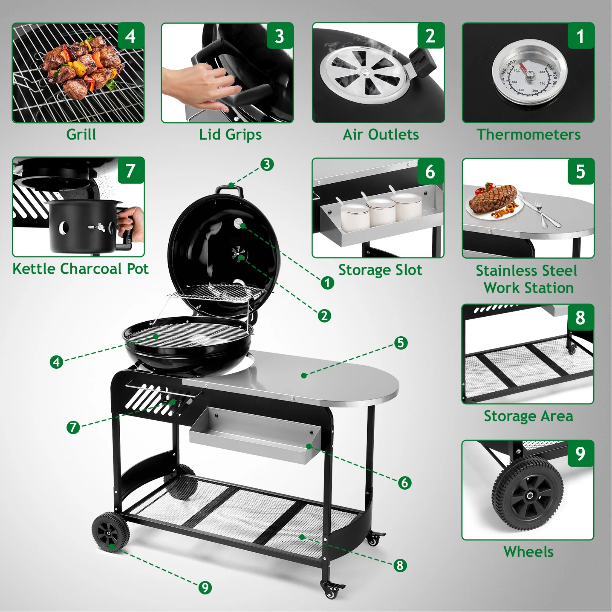 • ?Mobile & Organized Design �C Equipped with sturdy wheels, a convenient side table, and a bottom storage shelf, ensuring your grilling essentials are always at hand