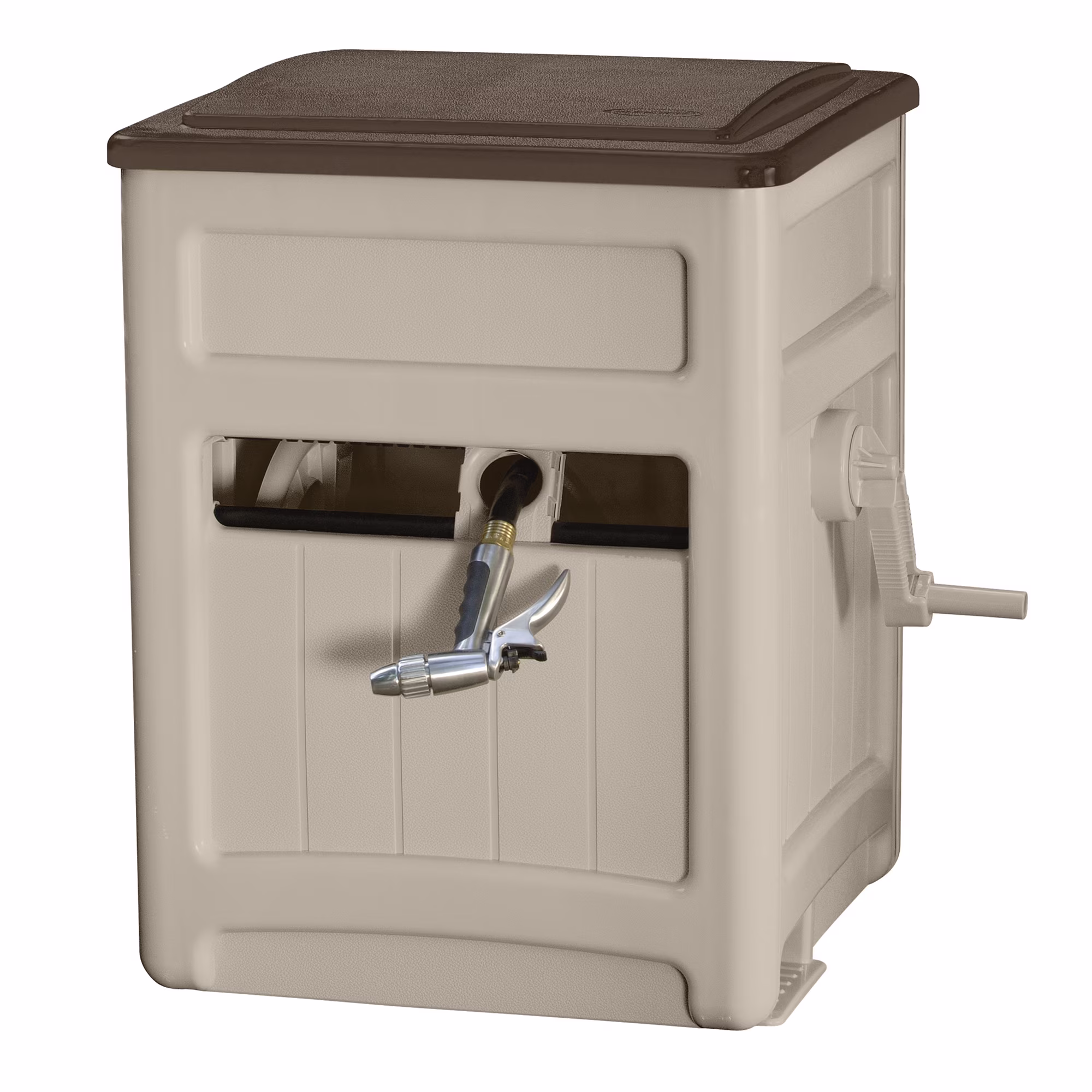 - Hideaway outdoor hose reel cart is constructed of durable, long-lasting resin