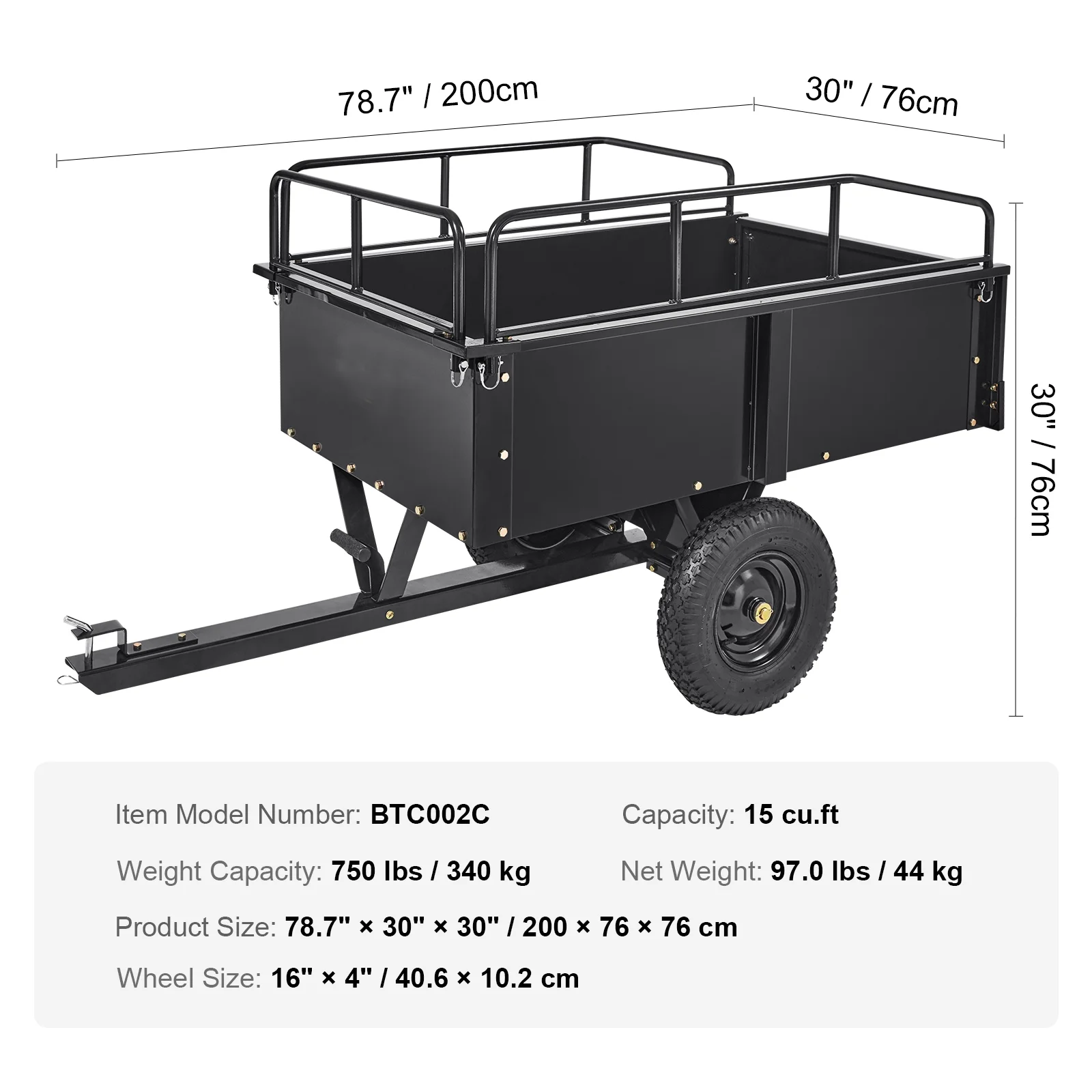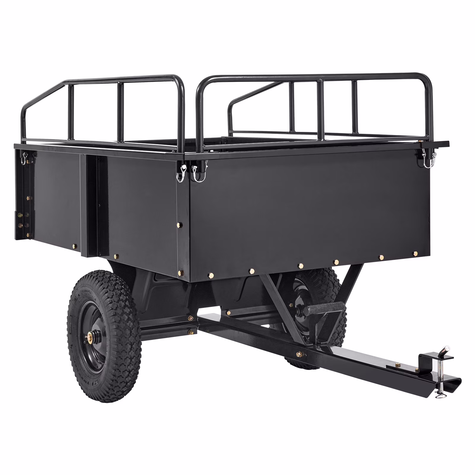 - High Capacity Trailer: Our ATV dump cart has added railings on three sides and can hold 15 cubic feet of yard waste. Collect more wood, soil, or garbage at once, reducing the need for frequent trips. Handle your yard work in one fell swoop with our high-capacity trailer.