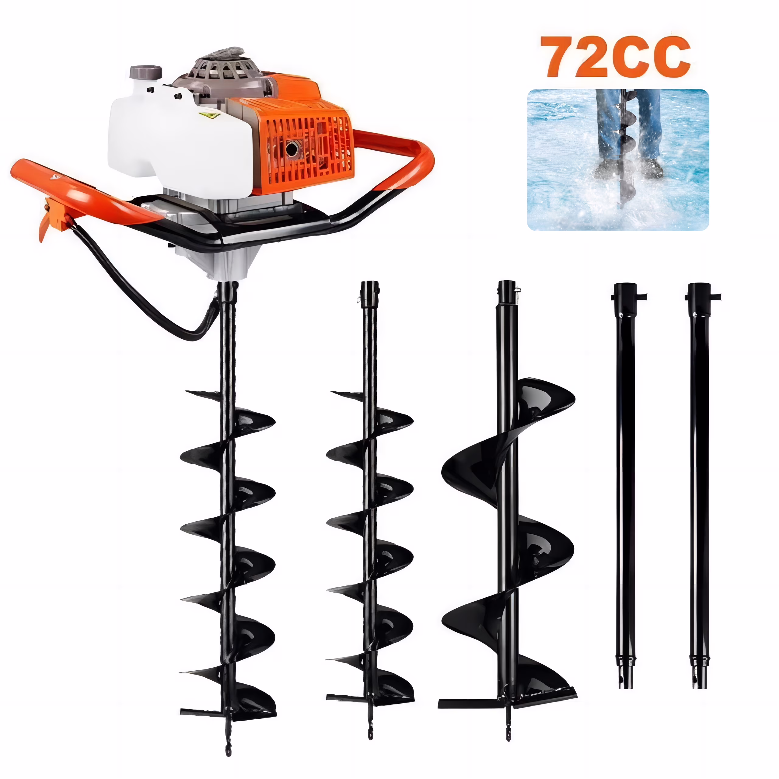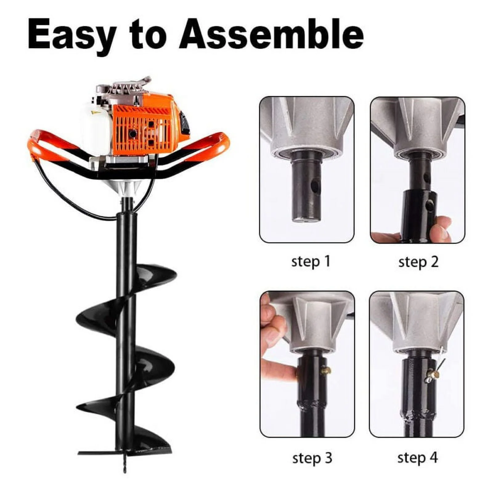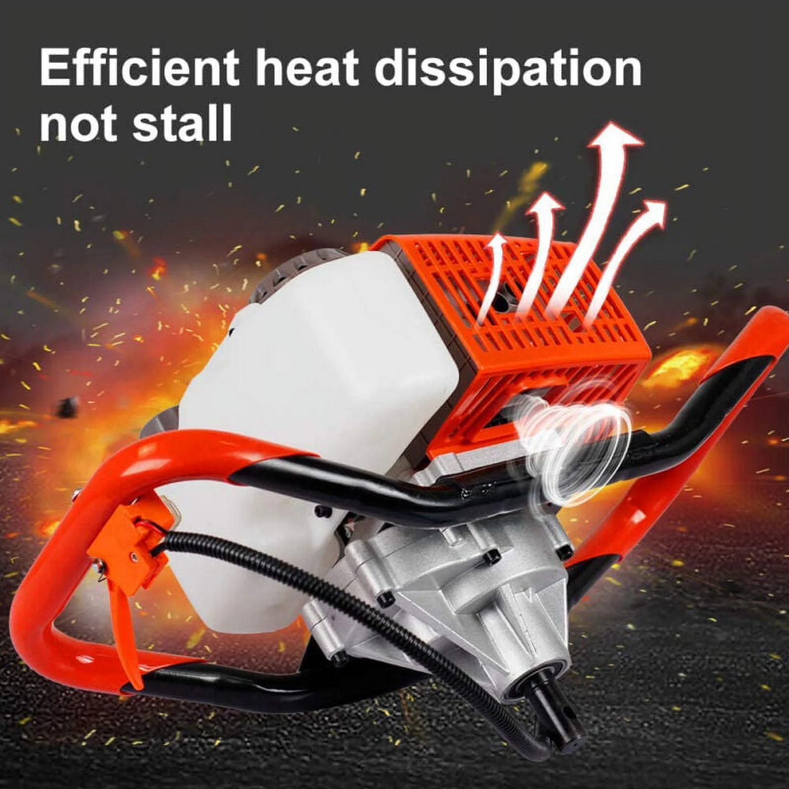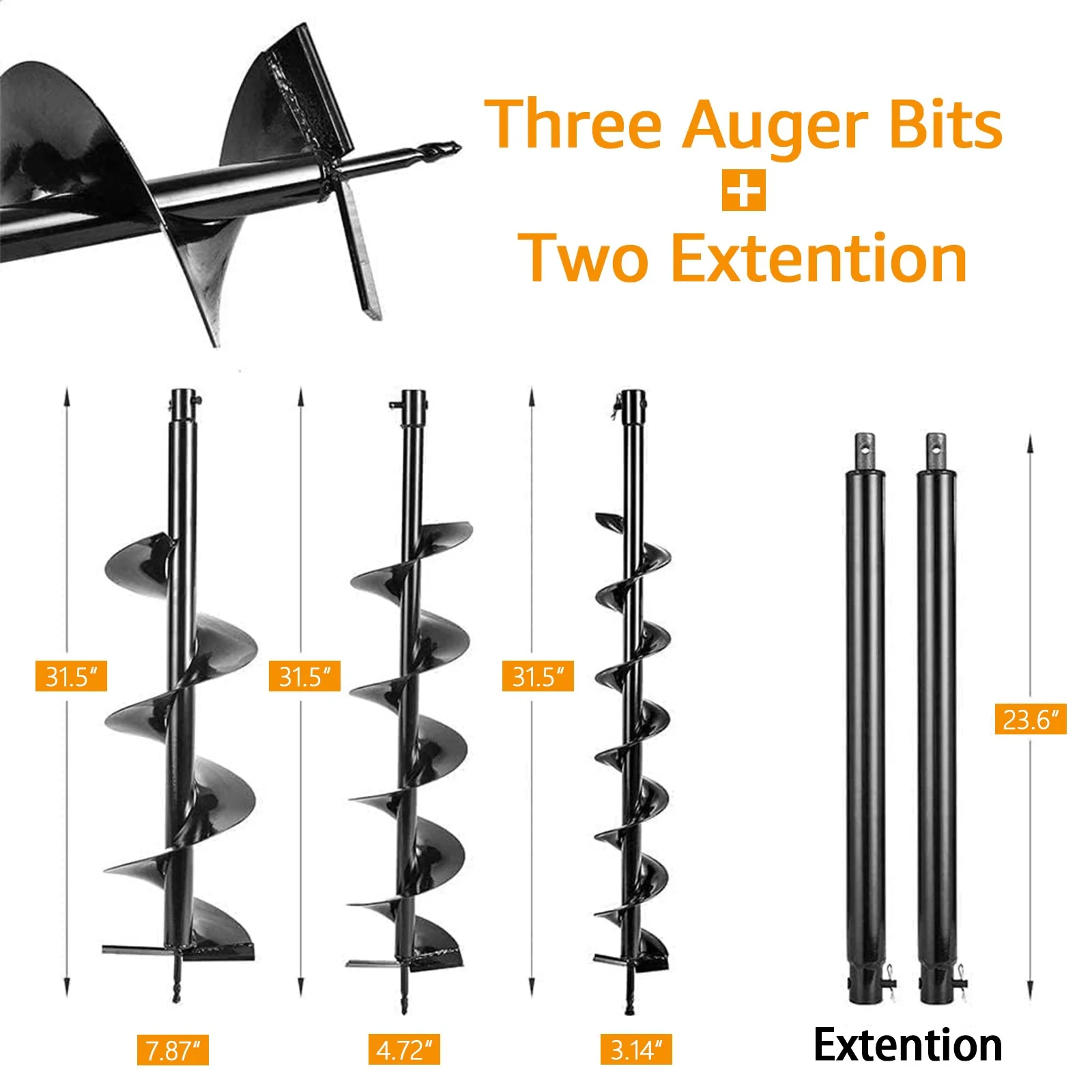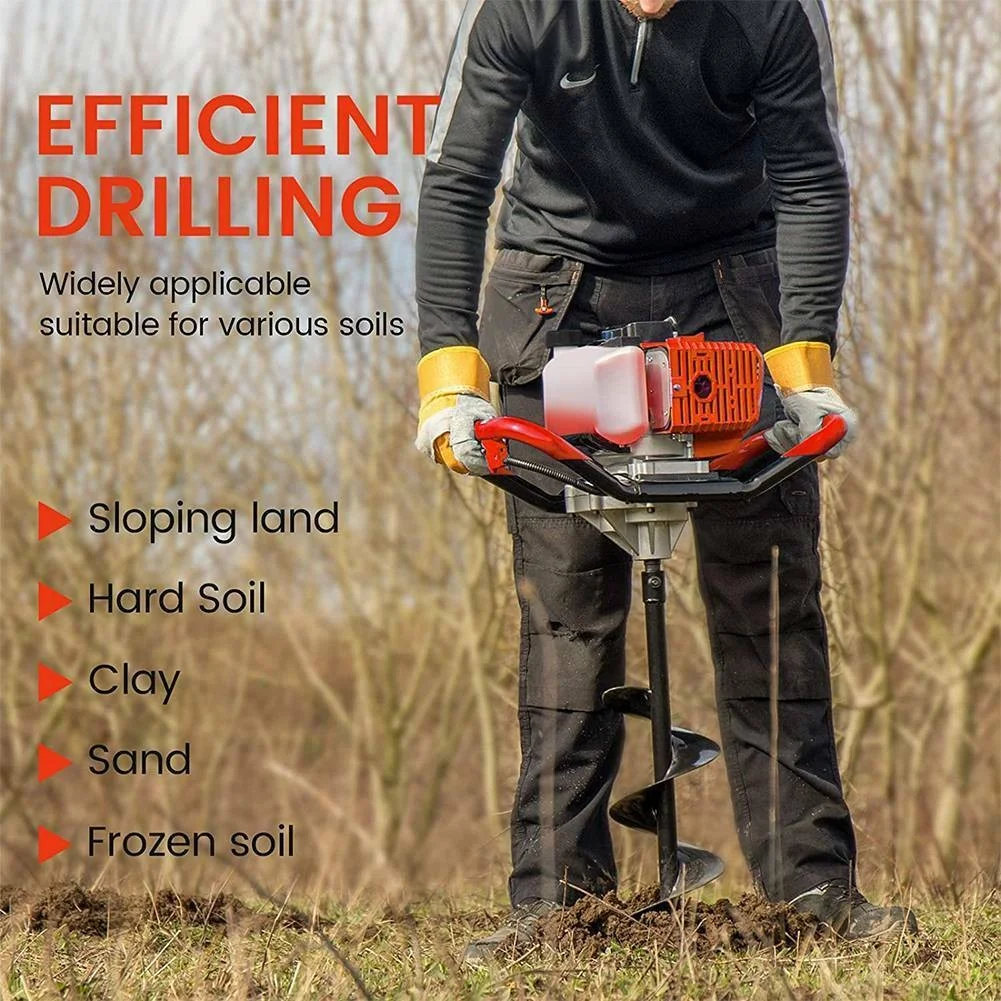 - Powerful Engine: 2-Stroke, Single Cylinder, Air-cooled Gasoline Engine; Engine Displacement: 62CC; Engine Cycles: 2|Multiple Size Drill Bits: Equipped with a 62cc gasoline engine, and the 3" 5" & 8" earth auger drill bits and extension meet your different hole dig requirements.|High-Efficiency: This post hole digger can be operated by one or two people. You can finish the drilling of multiple holes in quick succession with this set.|High Security Performance: Lightweight and easy to use.The design of a separate start switch to control the drill bit for greater safety. Carburetor with pump Easy starting system (cord starter).