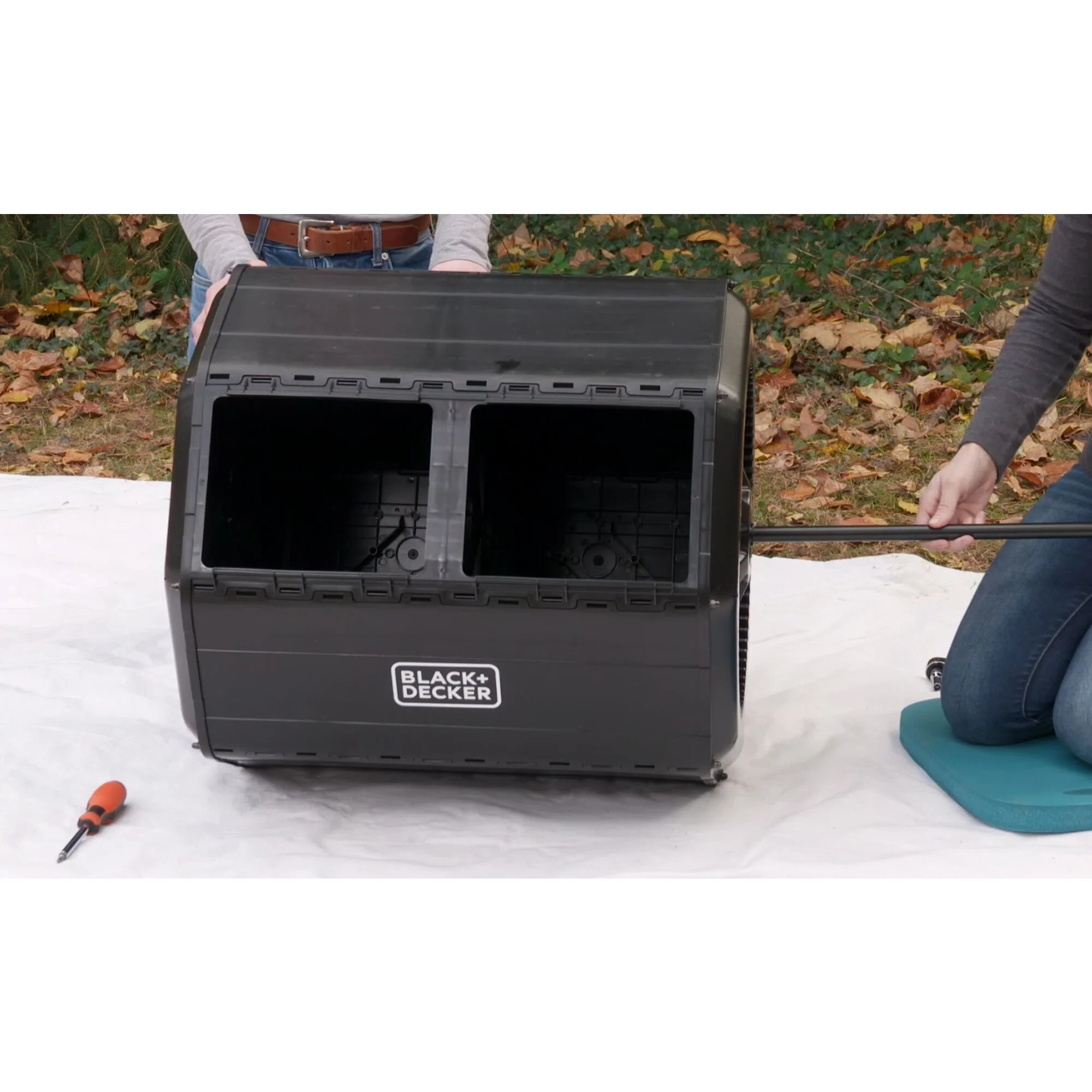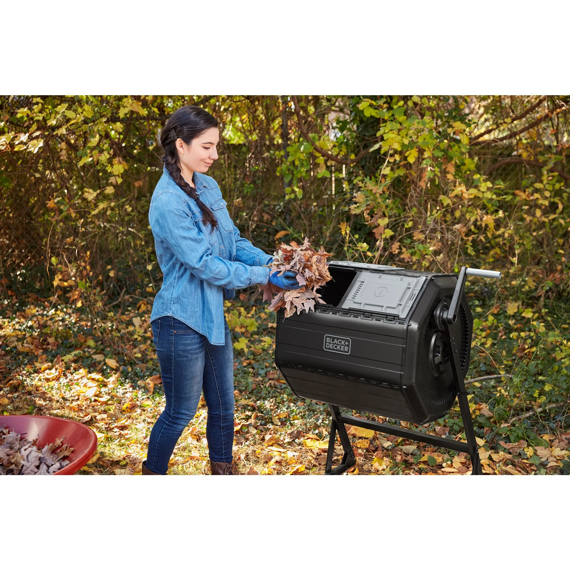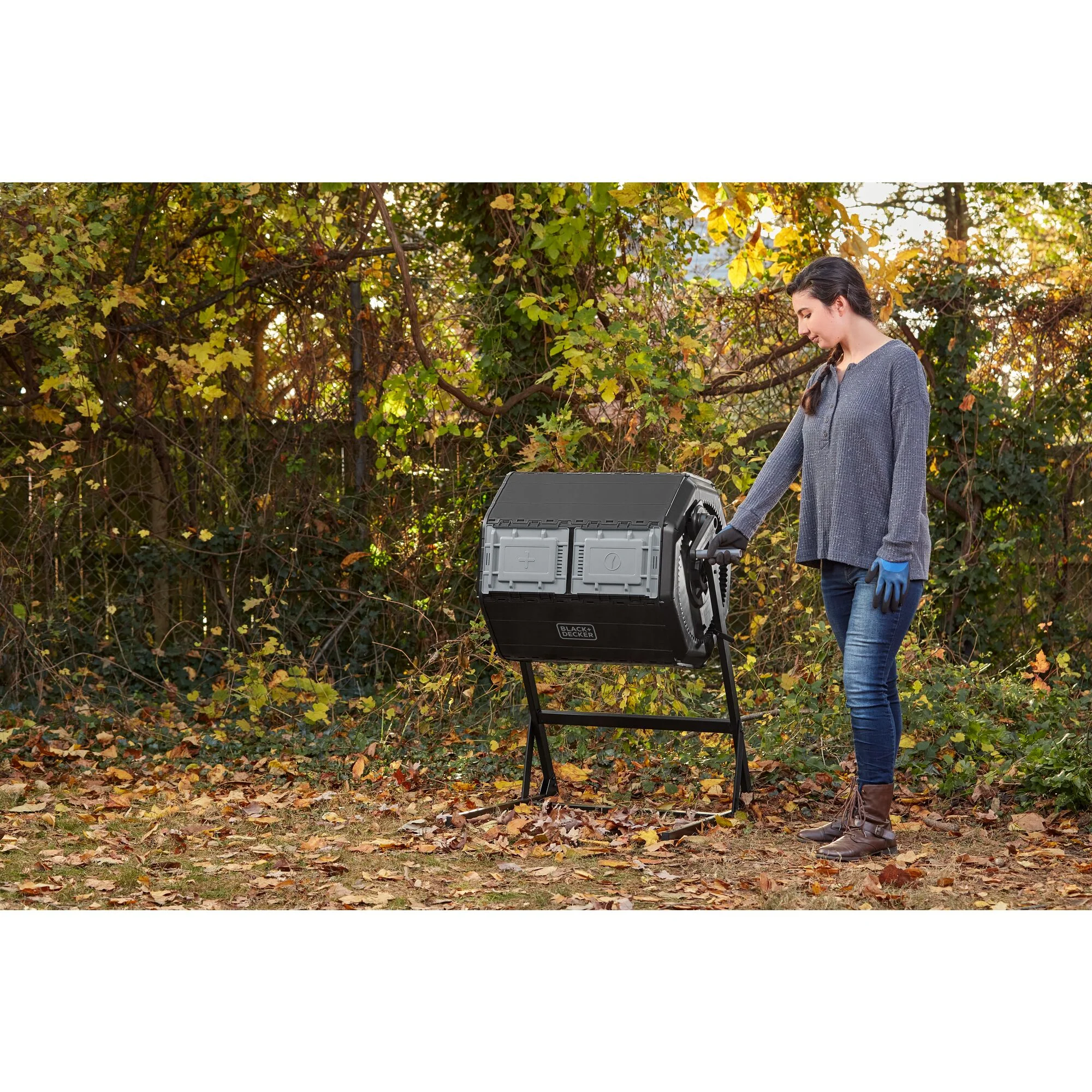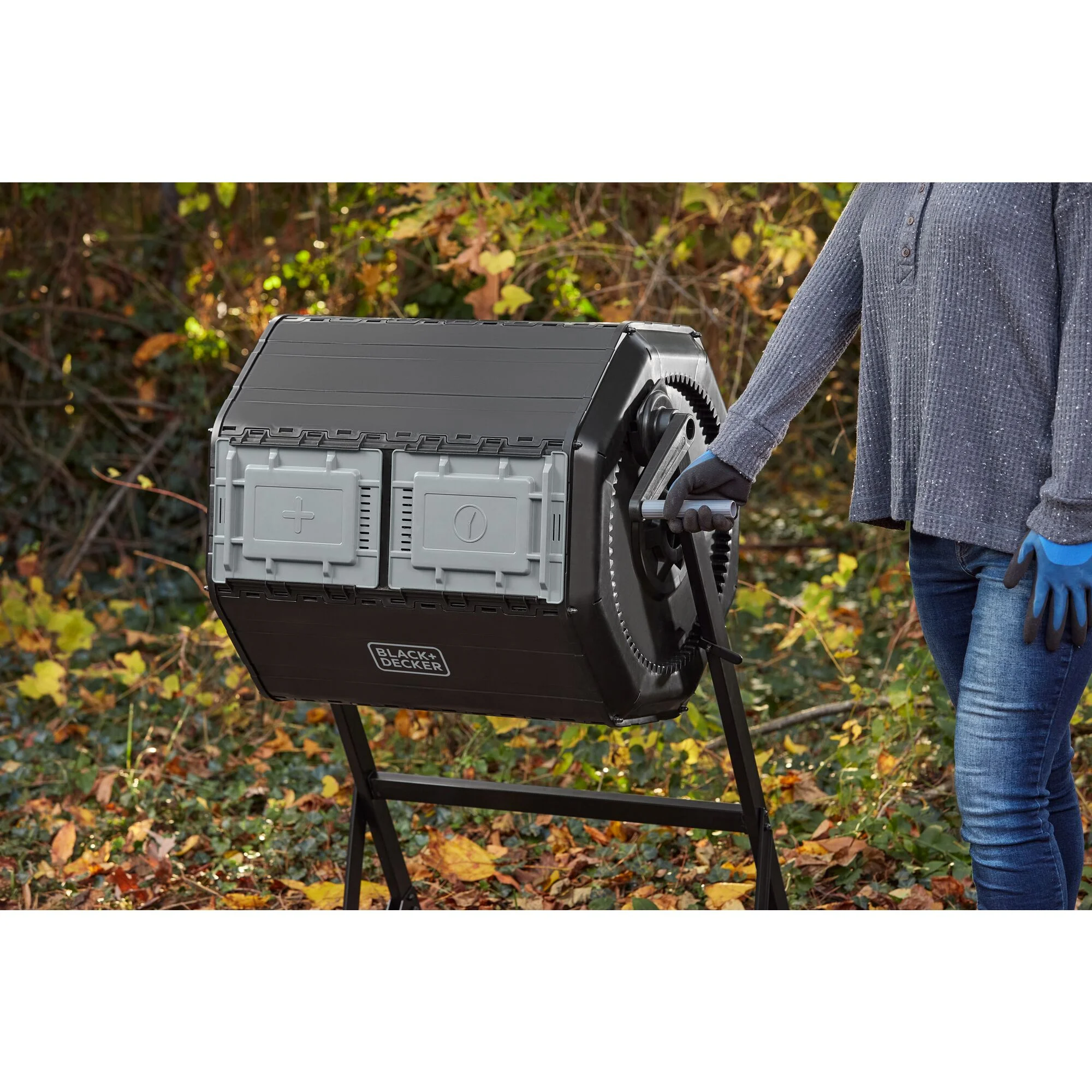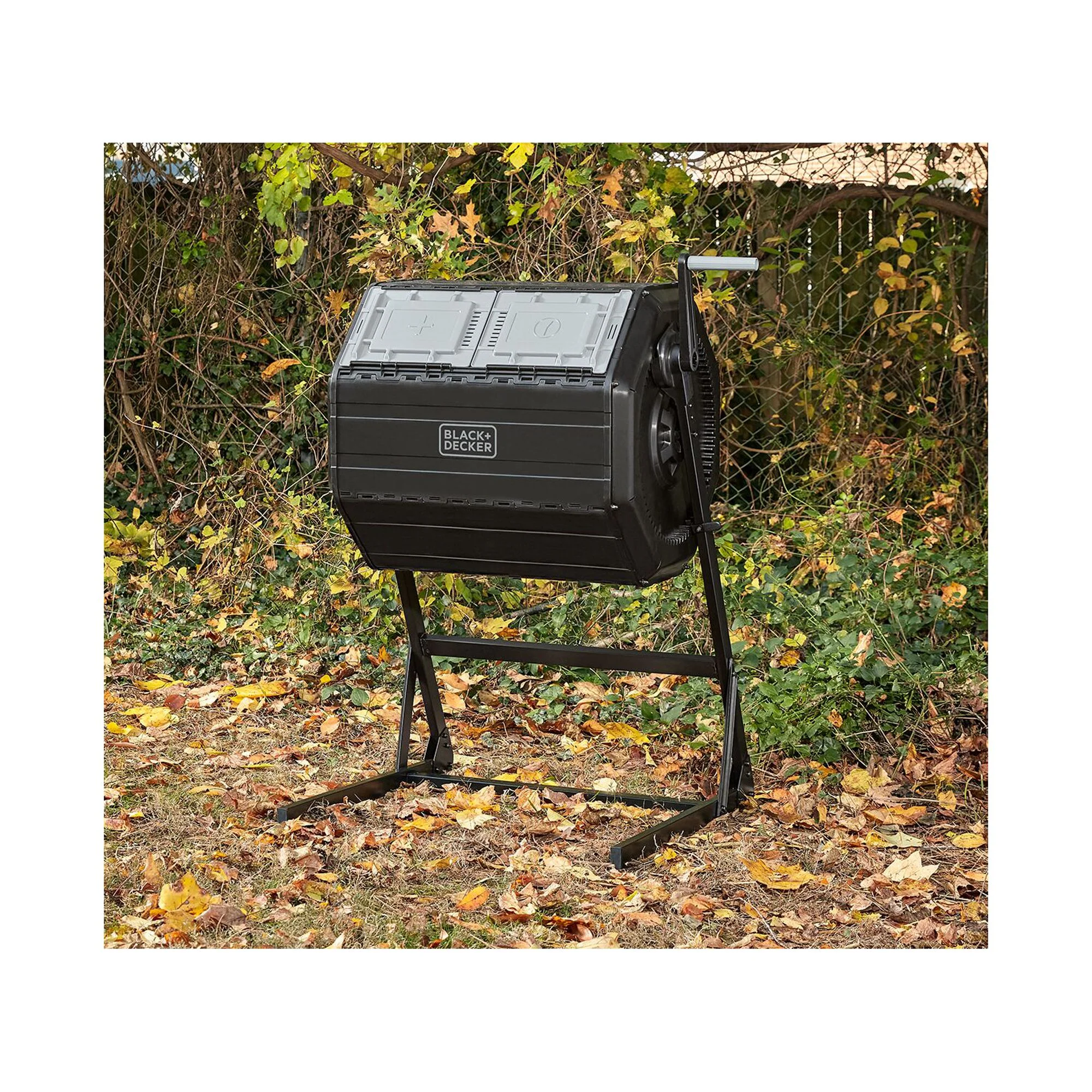 Turn food scraps and yard waste into nutrient-rich compost soil with the BLACK+DECKER Tumbler Composter. Tumble the compost barrel with minimal effort. The built-in, large handle with gear system makes it easy and efficient. Don't get caught without compost. The dual chamber allows you to add compost ingredients to one side while letting the other side cure. Our Tumbler Composter accelerates the decomposition process by aerating the soil with the built-in mixing bars, giving you finished compost soil in weeks in ideal conditions.