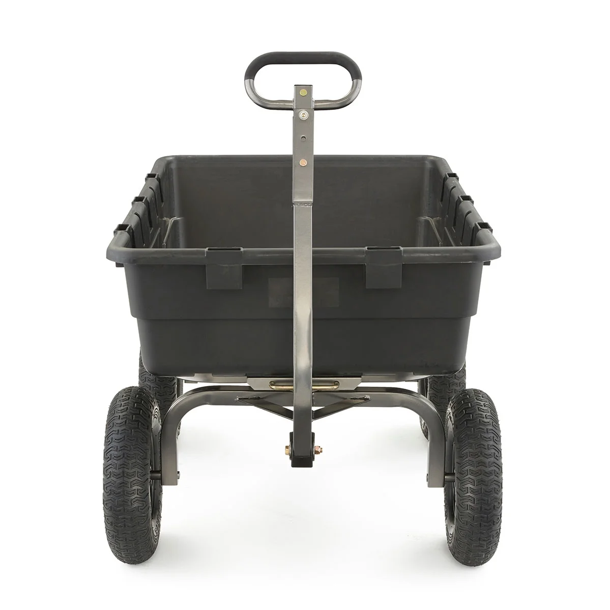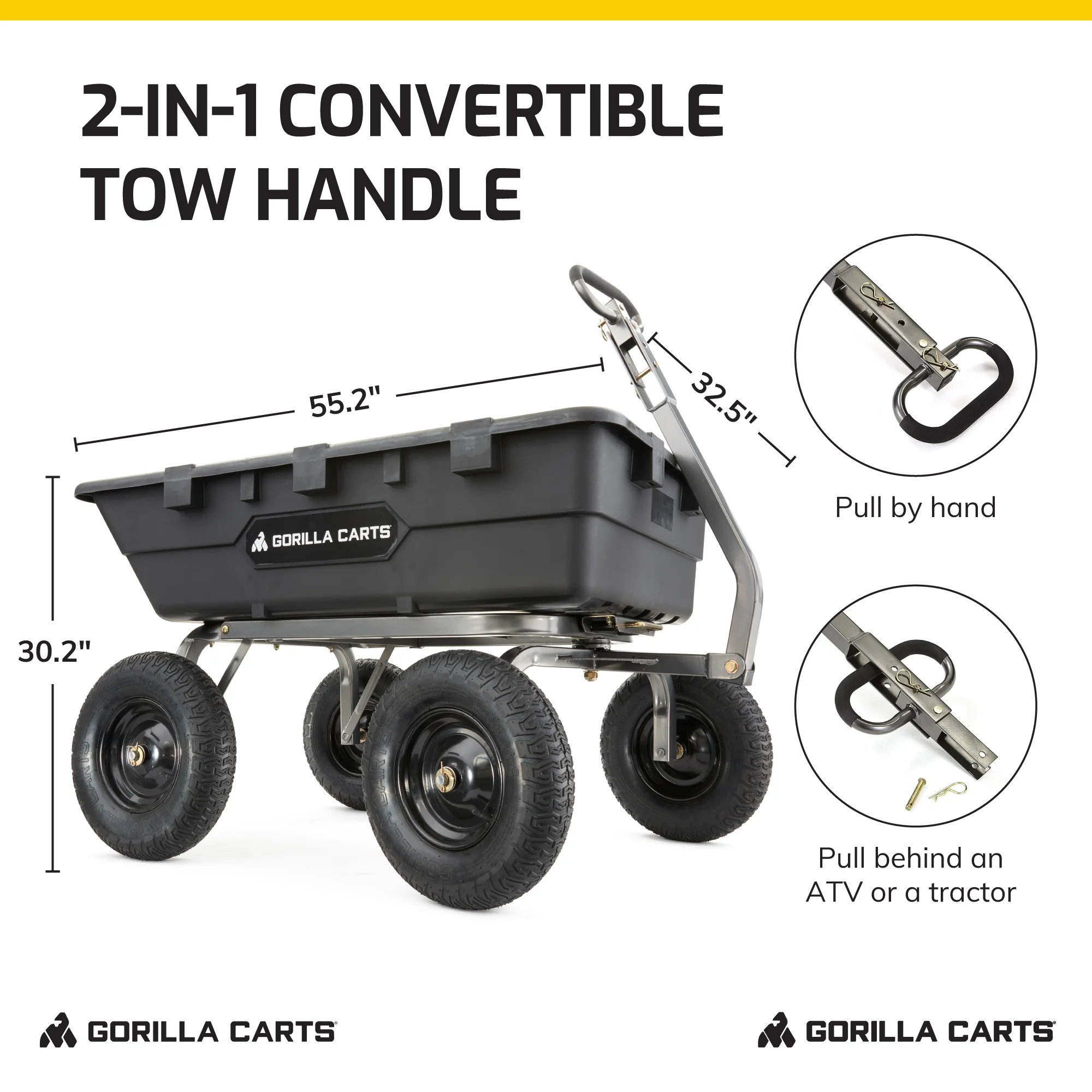 - Pulling handle provides comfortable and convenient manual hauling; Handle can also convert into a hitch for easy towing