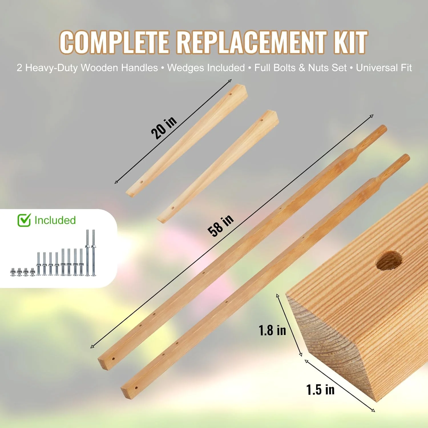 • Complete Replacement Kit �C Includes 2 heavy-duty wooden handles, wedges, and a full set of bolts and nuts for secure assembly. All the parts you need to repair your wheel barrow!