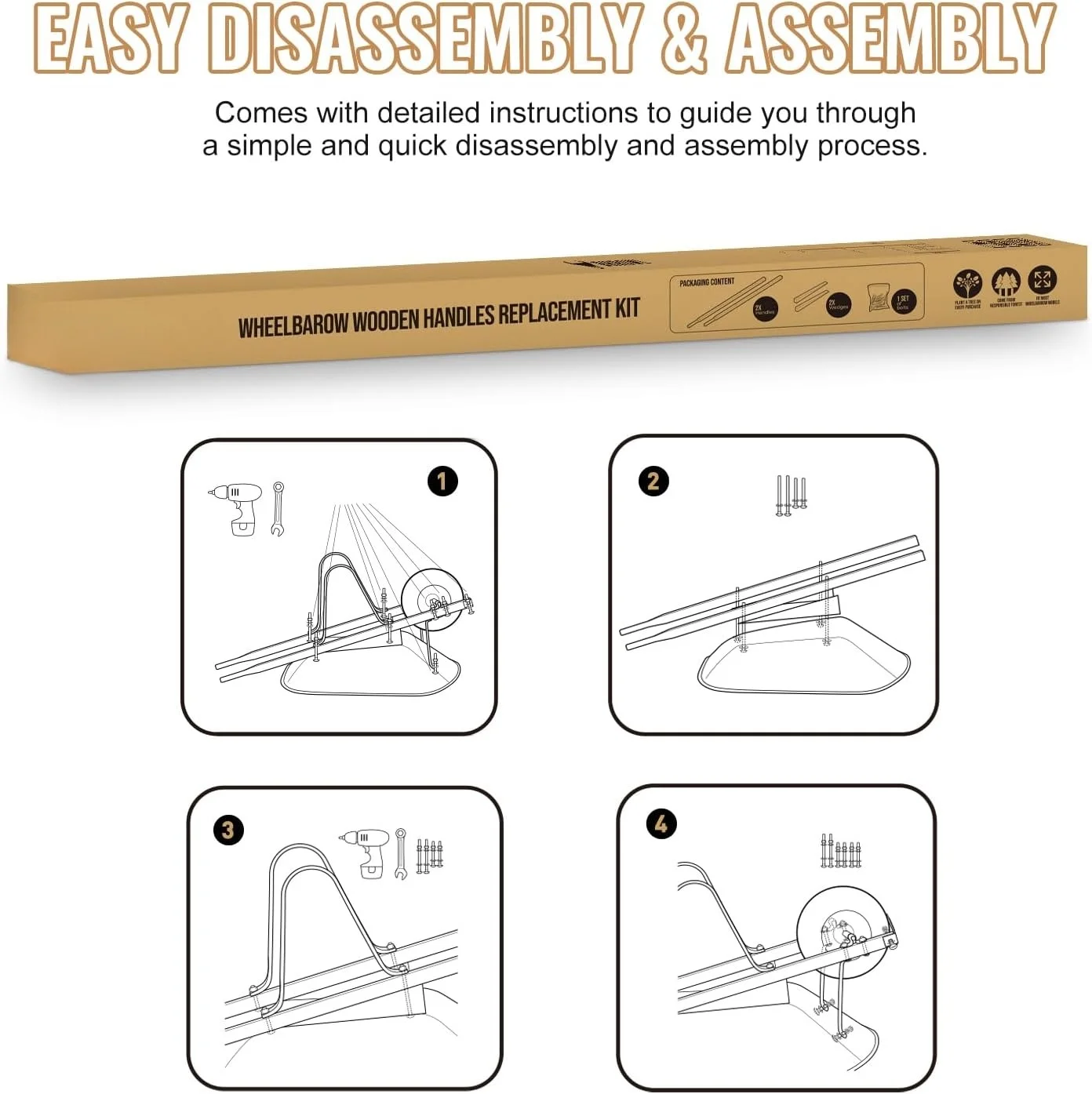 Ready to Give Your Wheelbarrow a Second Life?Don��t toss your old wheelbarrow��revive it with our complete replacement kit and make a choice that��s good for both your tools and the planet. With two 60�� FSC-certified wooden handles, pre-cut leveling wedges, and all the bolts, nuts, and washers you need (even extras for your tray braces), everything��s in the box. No guesswork. No extra trips to the hardware store.