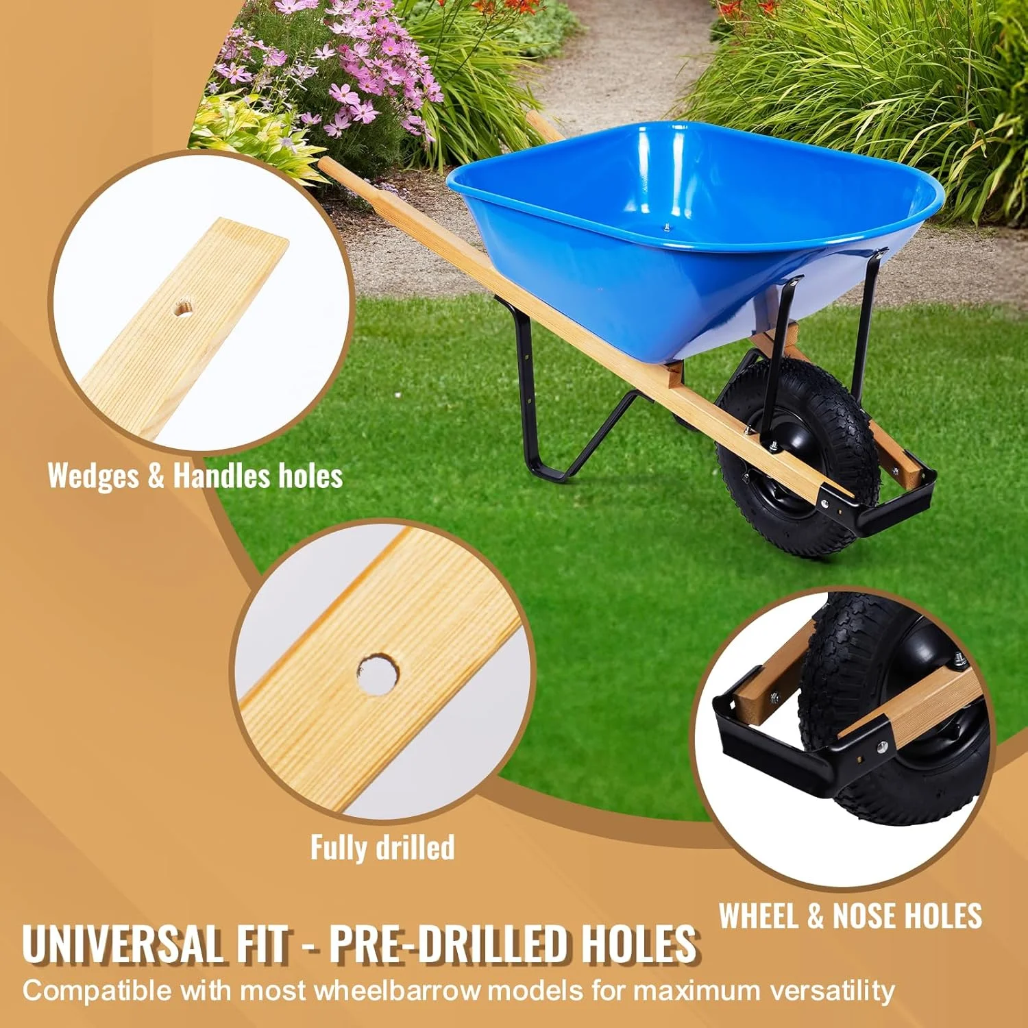 • Pre-Drilled Wooden Handles �C Handles come pre-drilled for a quick and easy installation on most wheelbarrow models.