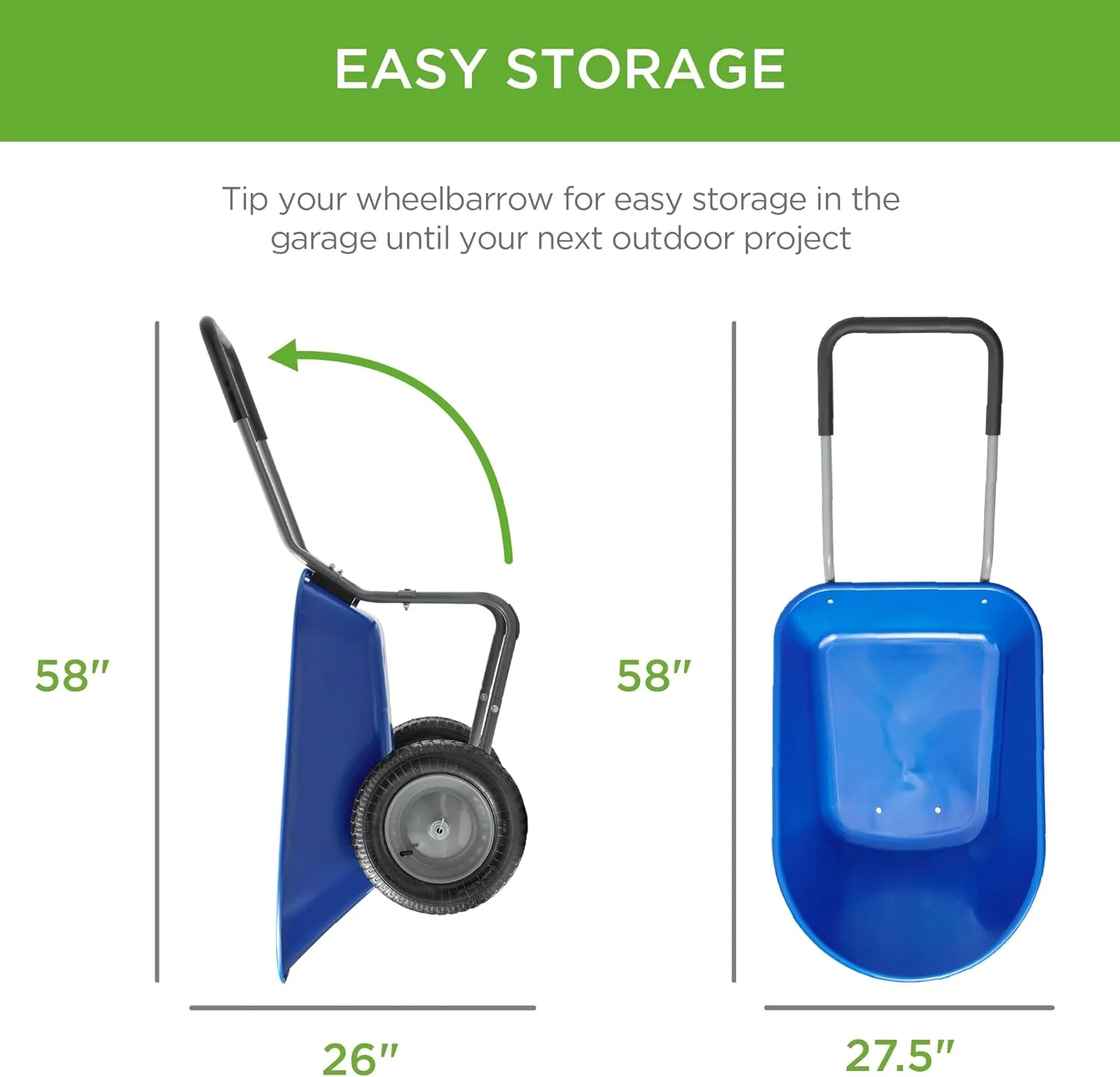 - EASY STORAGE: A compact profile combined with easy tipping action allows you to seamlessly store this wheelbarrow upright in your garage or garden shed; OVERALL DIMENSIONS: 58"(L) x 27.5"(W) x 26"(H); Weight Capacity: 330 lbs.