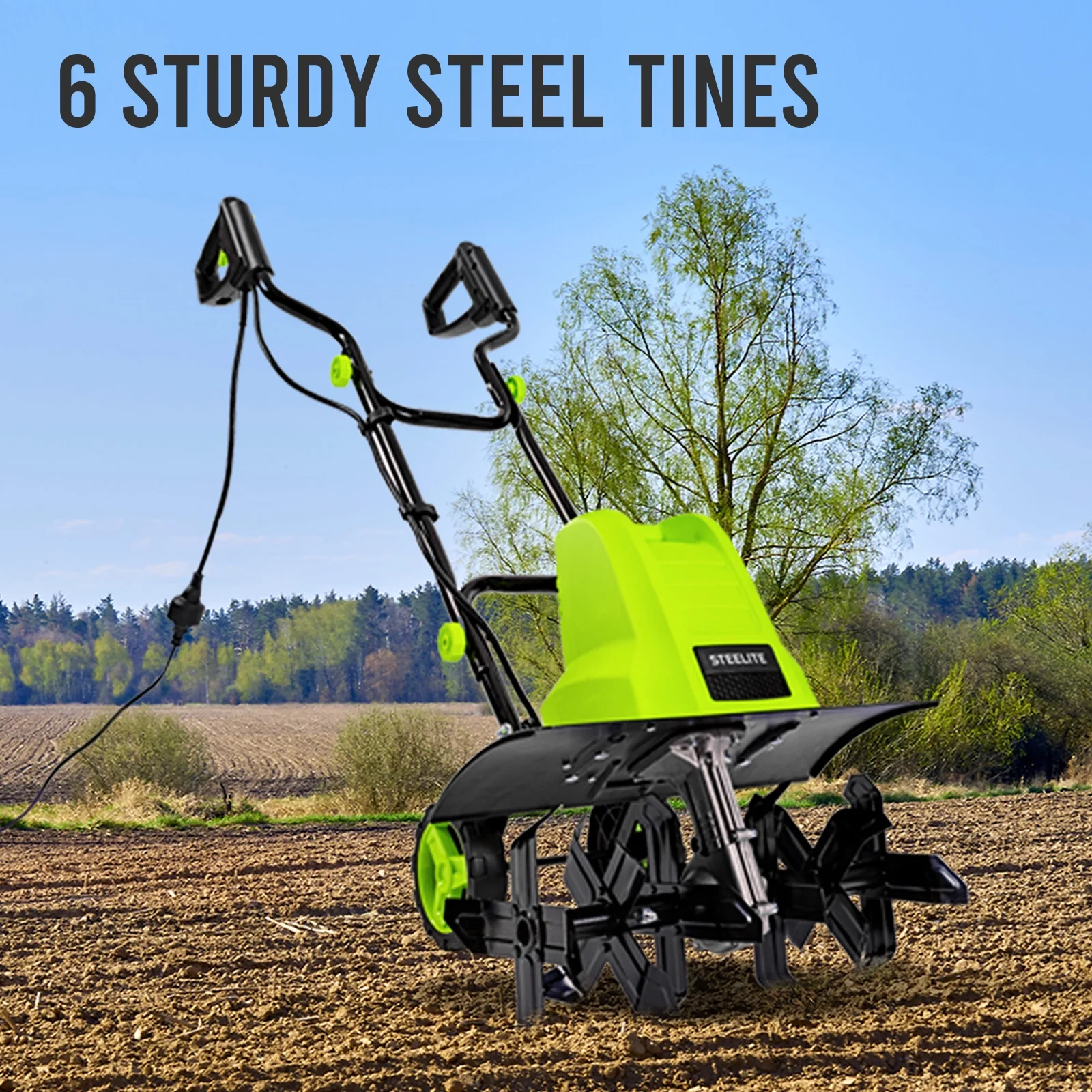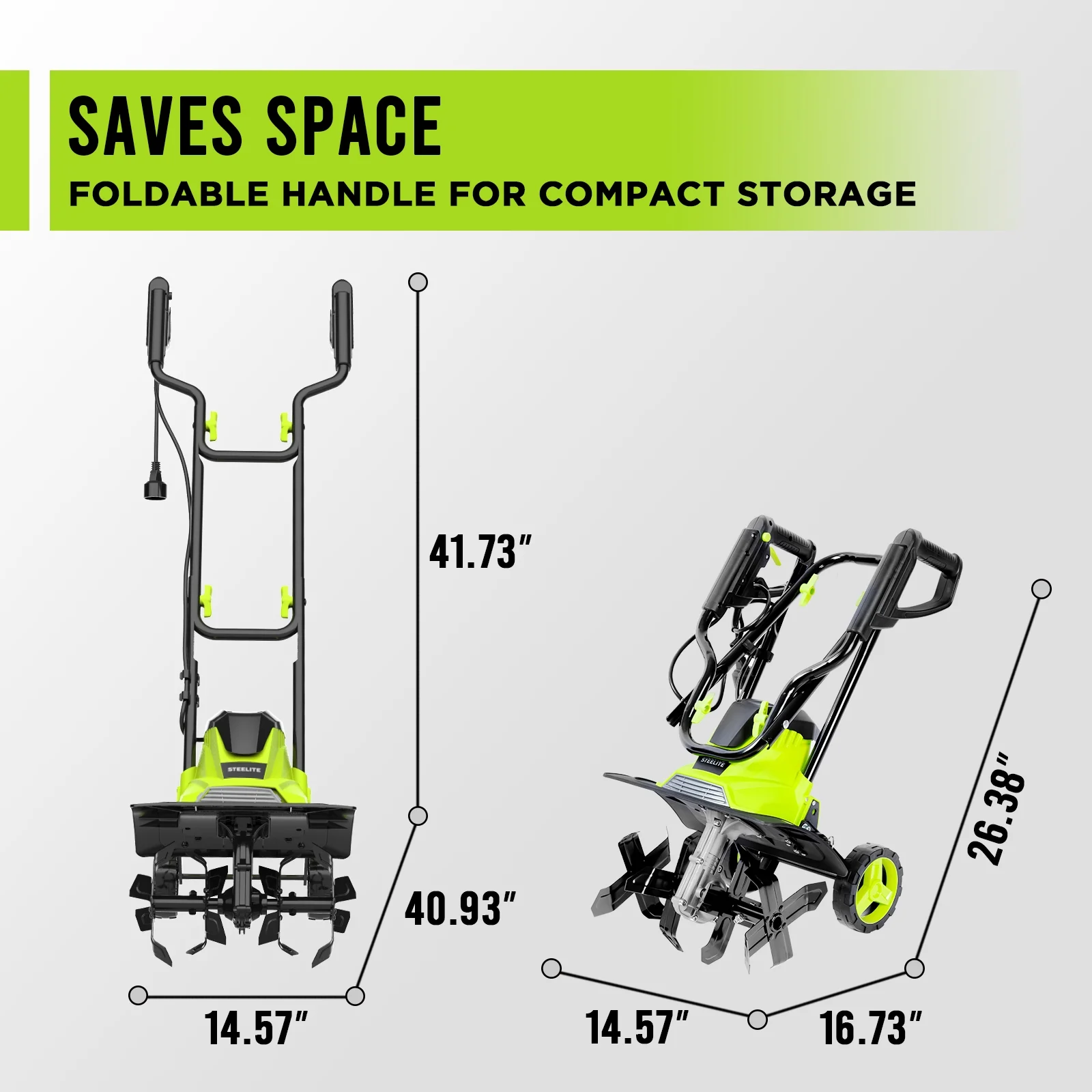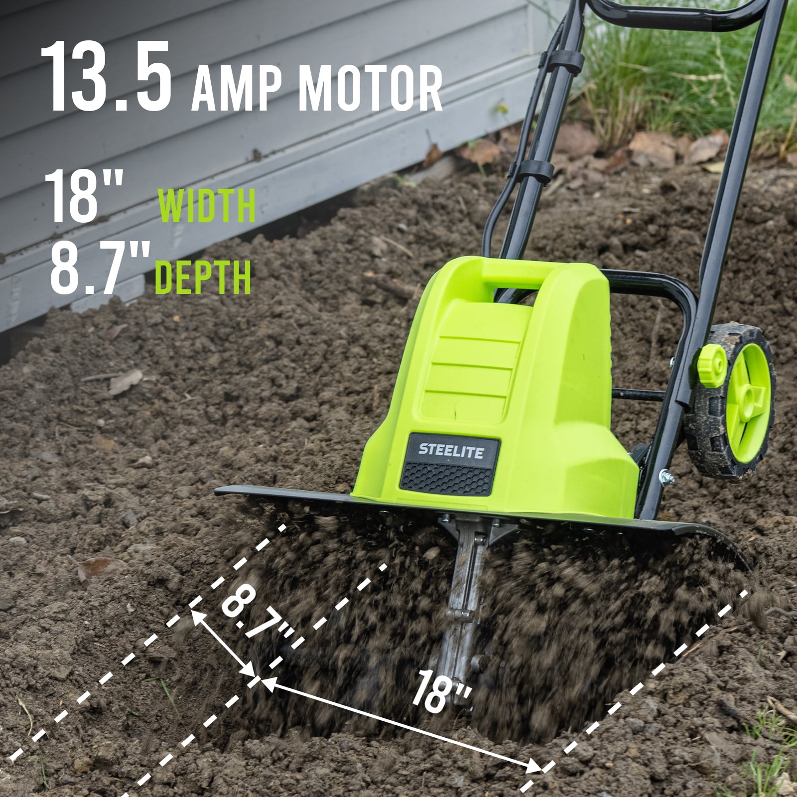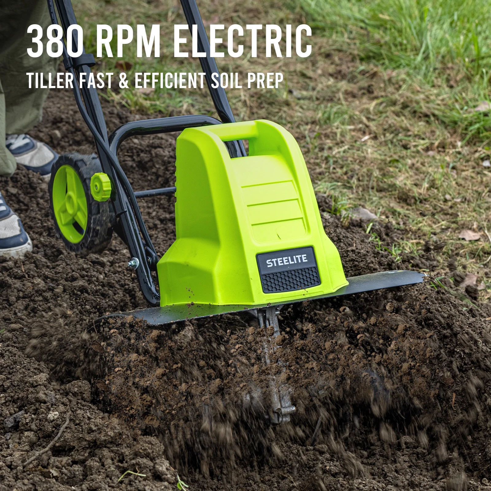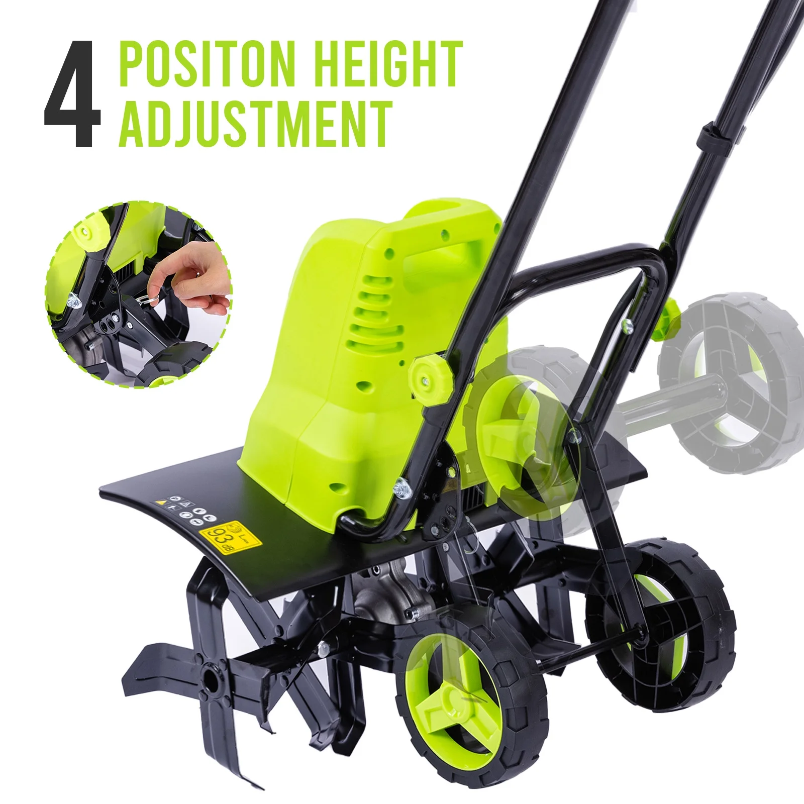 - ??��Electric Tiller with 14" W x 8.7" D��This electric garden tiller boasts a 14" cultivation width and up to 8.7" tilling depth in seconds, it effectively loosens and processes soil, breaking it up for better planting.
