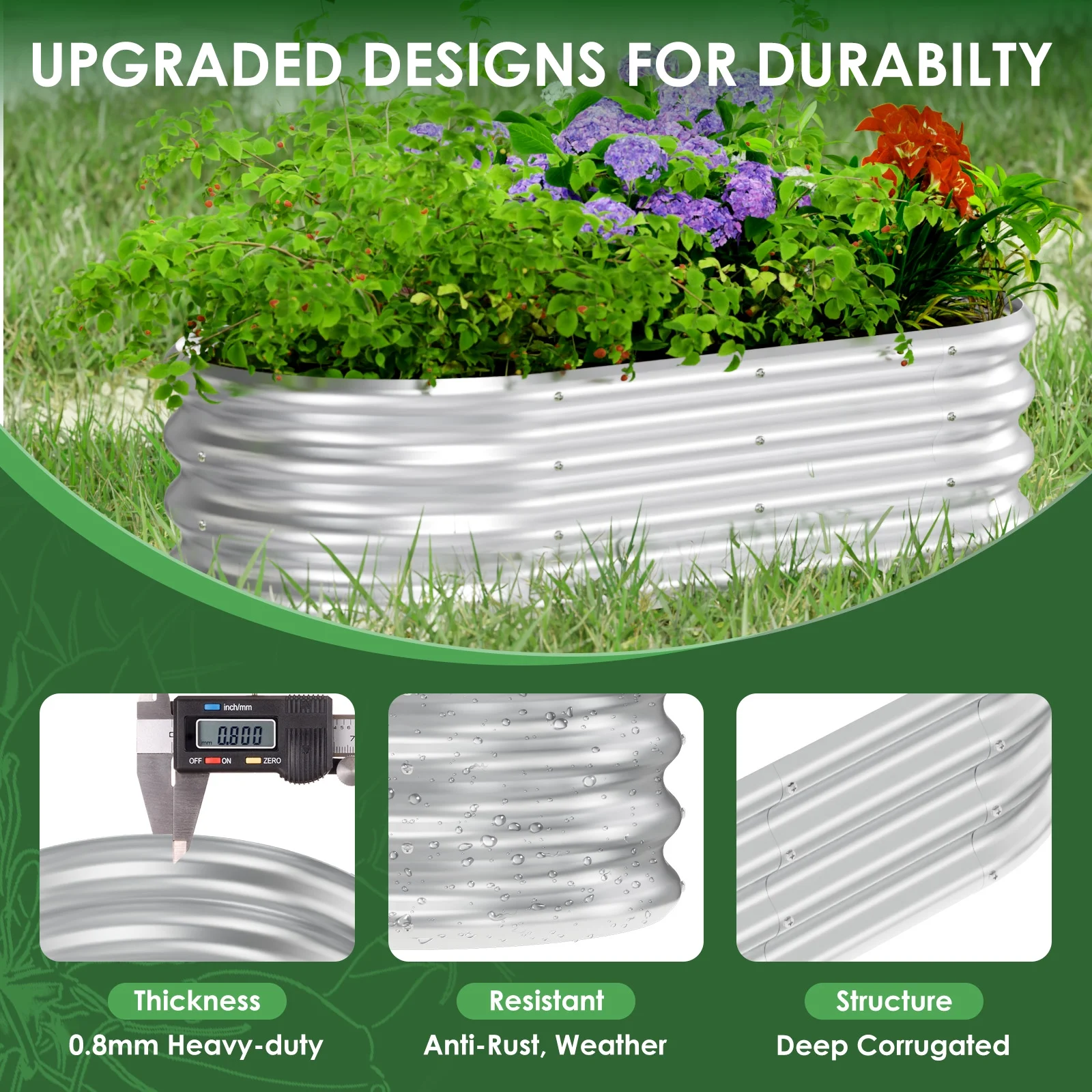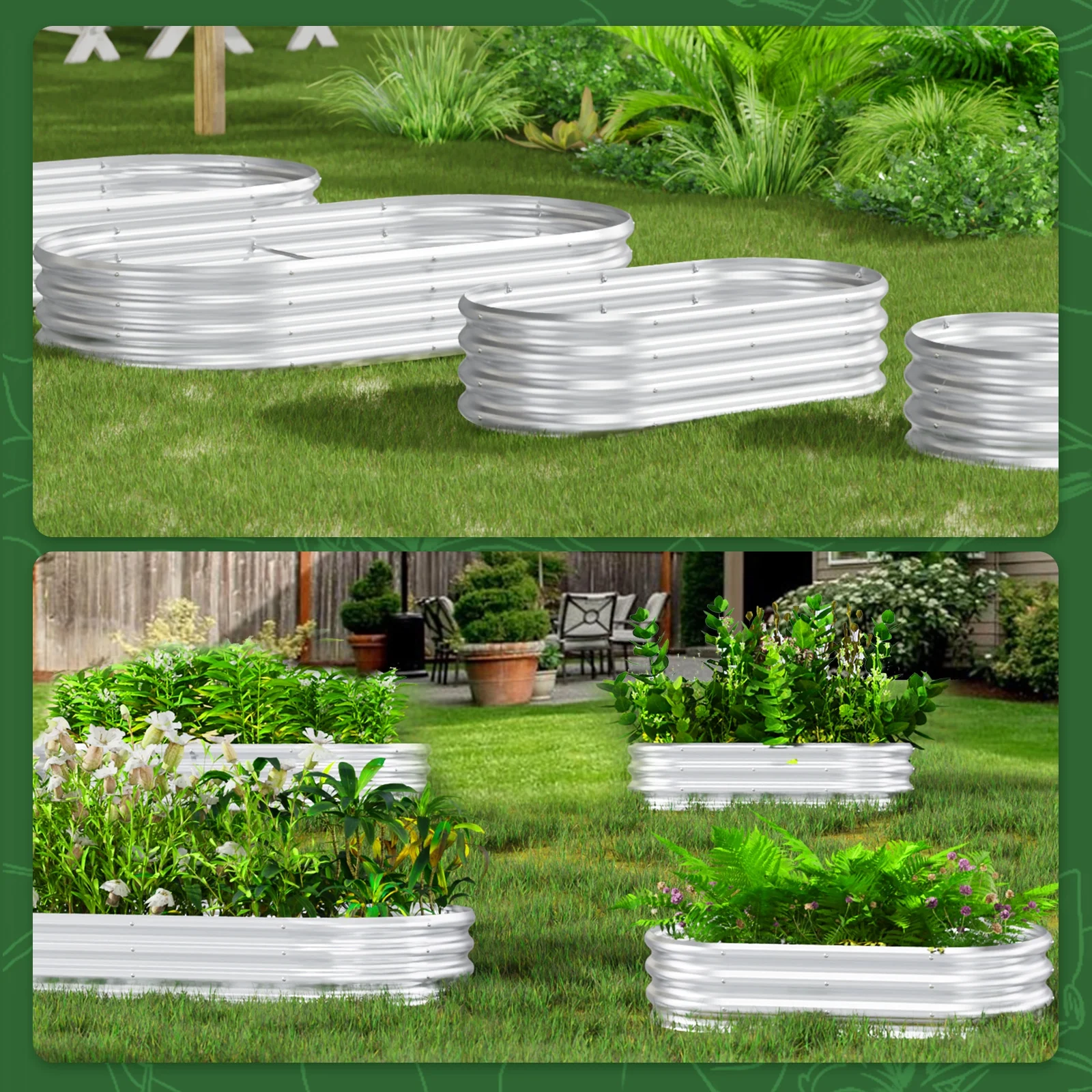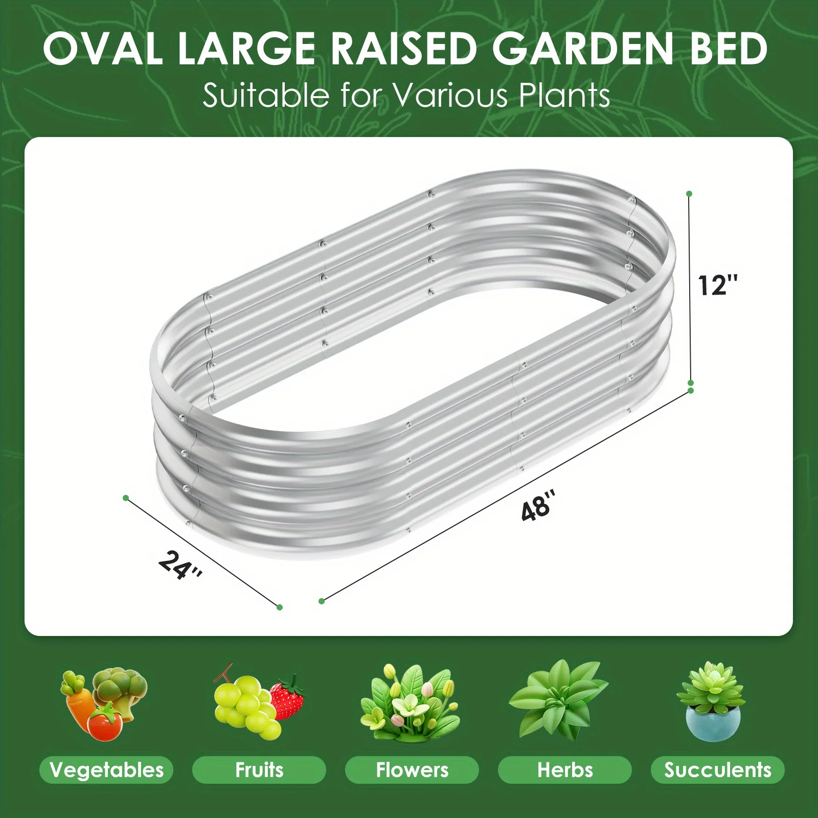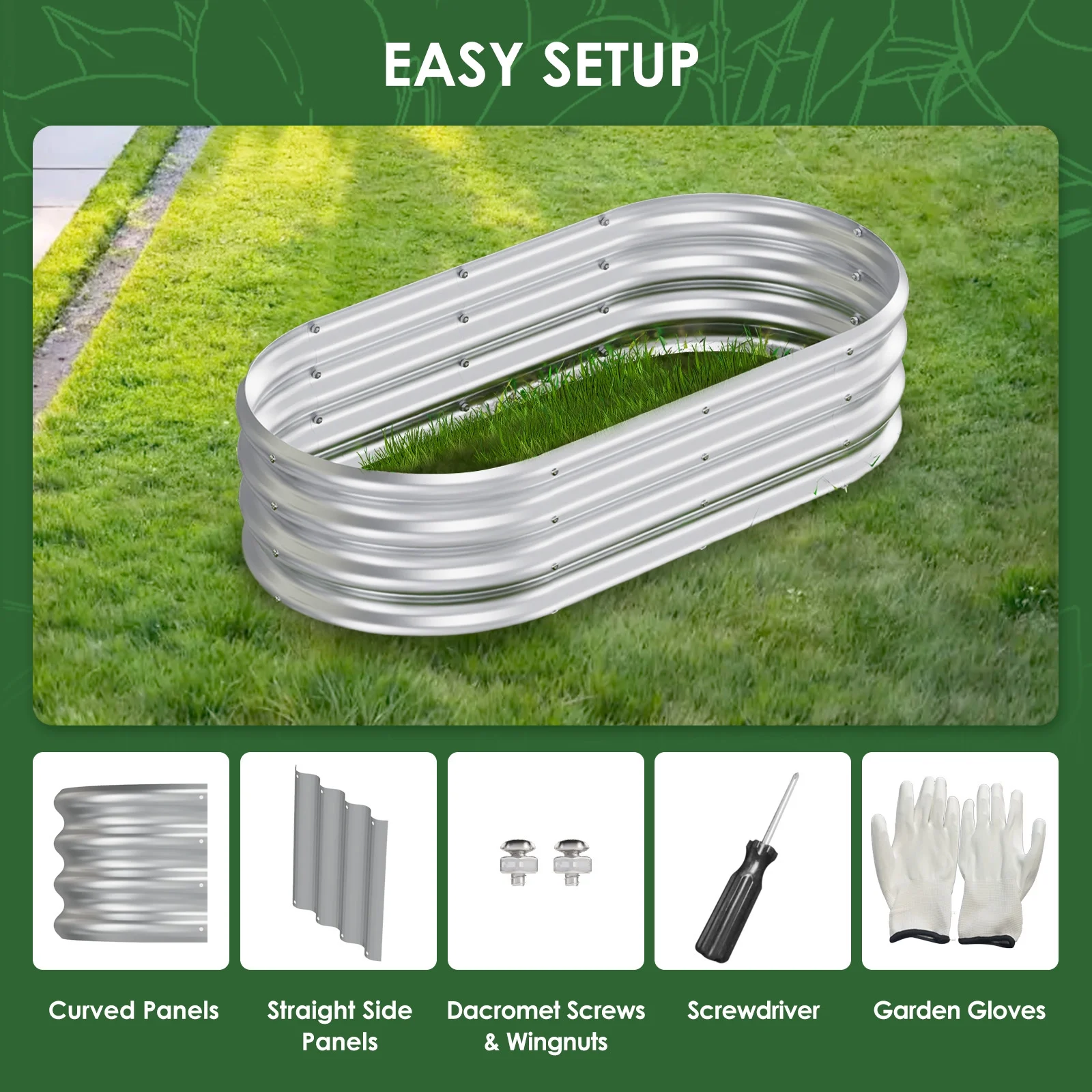 - Oval Design: The unique oval shape is not only visually appealing but also maximizes planting space, making it suitable for growing a variety of vegetables, fruits, and flowers. 2.Easy Assembly: The kit is designed for simplicity and easy installation, requiring no complex tools. Users can quickly assemble it, saving time and effort.