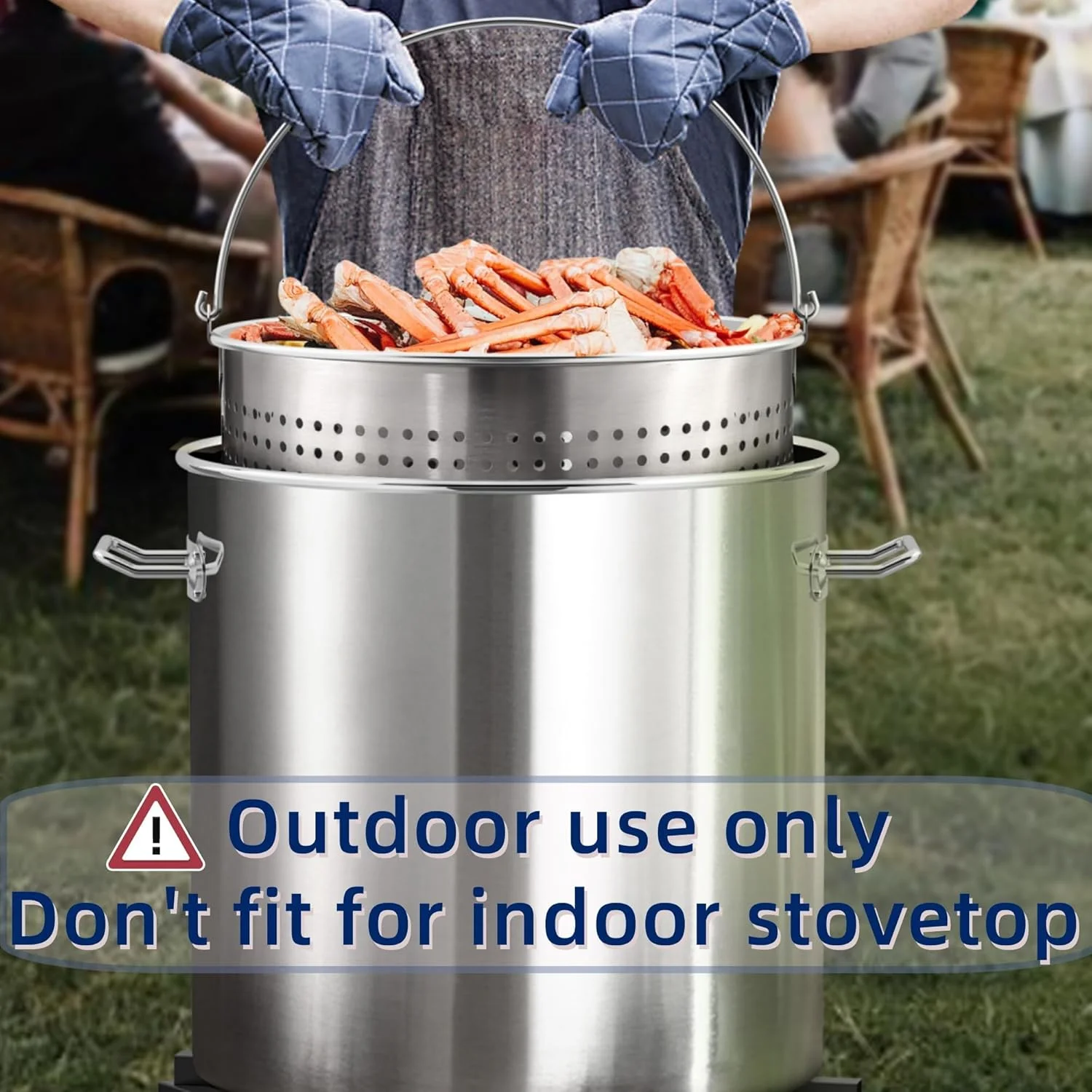 - Premium Stainless Steel: Crab Boil Pot, Strainer Basket, Lift Hook, Steamer Insert Rack, and a Divider is made of rust-proof and sturdy stainless steel. Strong and stable, great for outdoor use