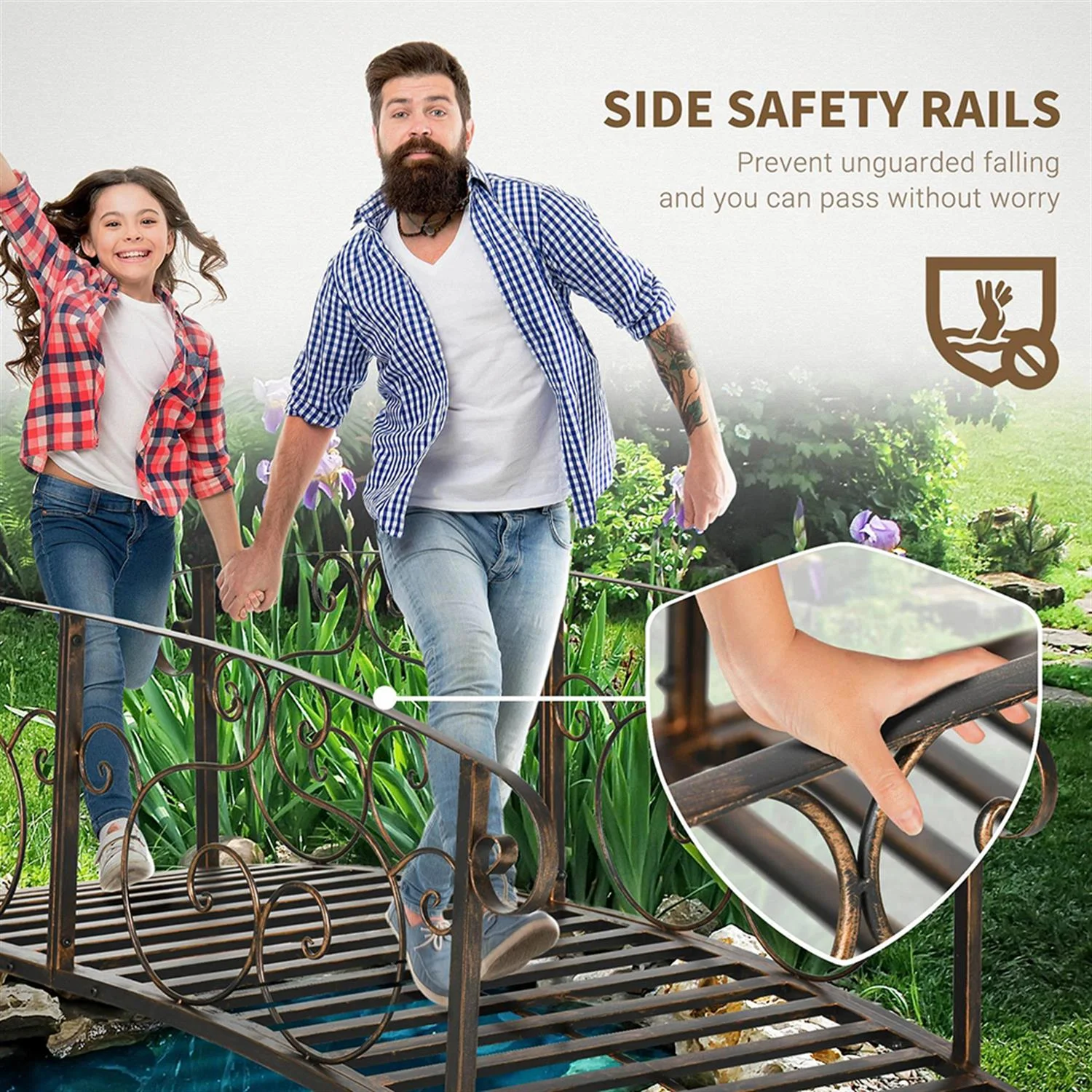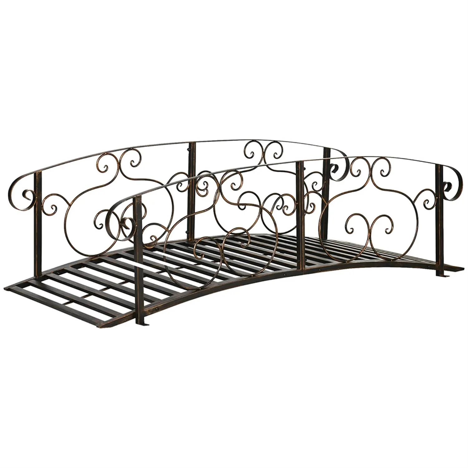 Perfectly designed to span small creeks, streams, or ponds, this metal garden bridge offers a reliable path for your backyard landscaping needs.Featuring exquisite vine patterns, the safety siderails not only enhance the beauty of your outdoor space but also provide essential support as you cross, ensuring a safe journey.