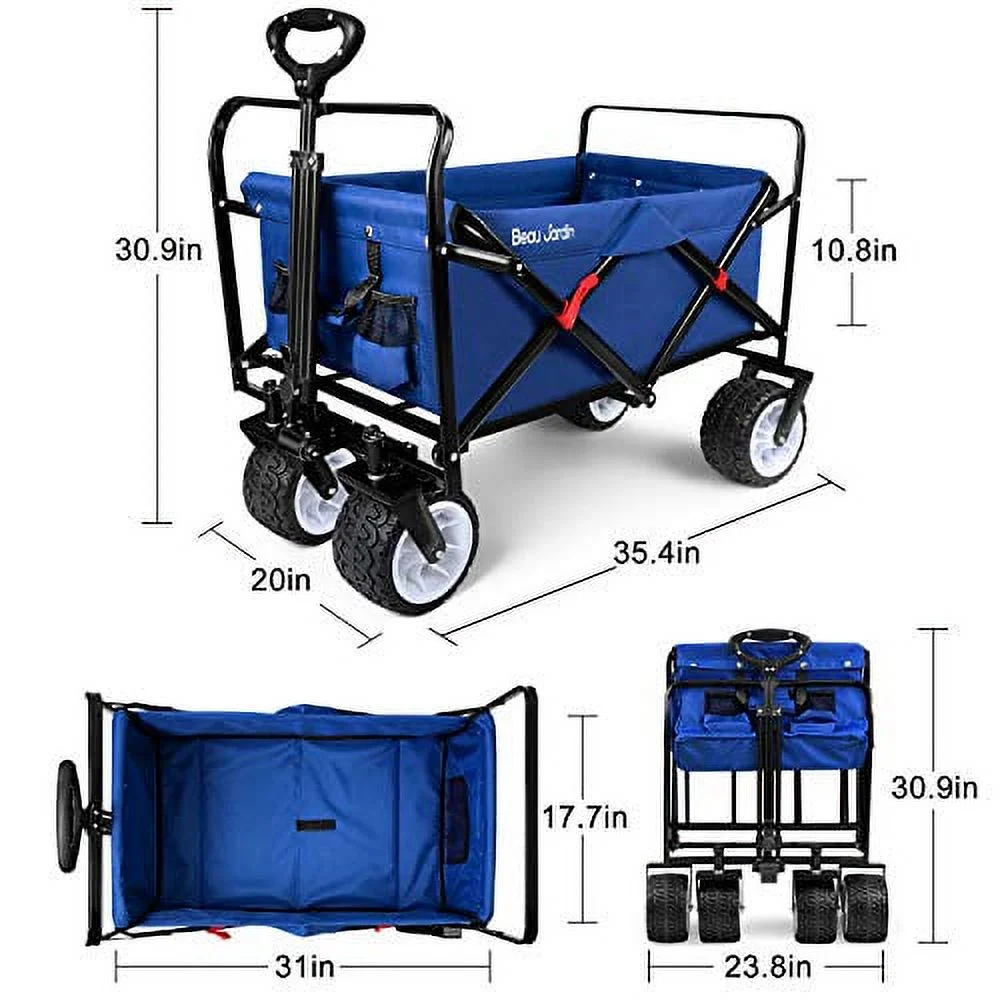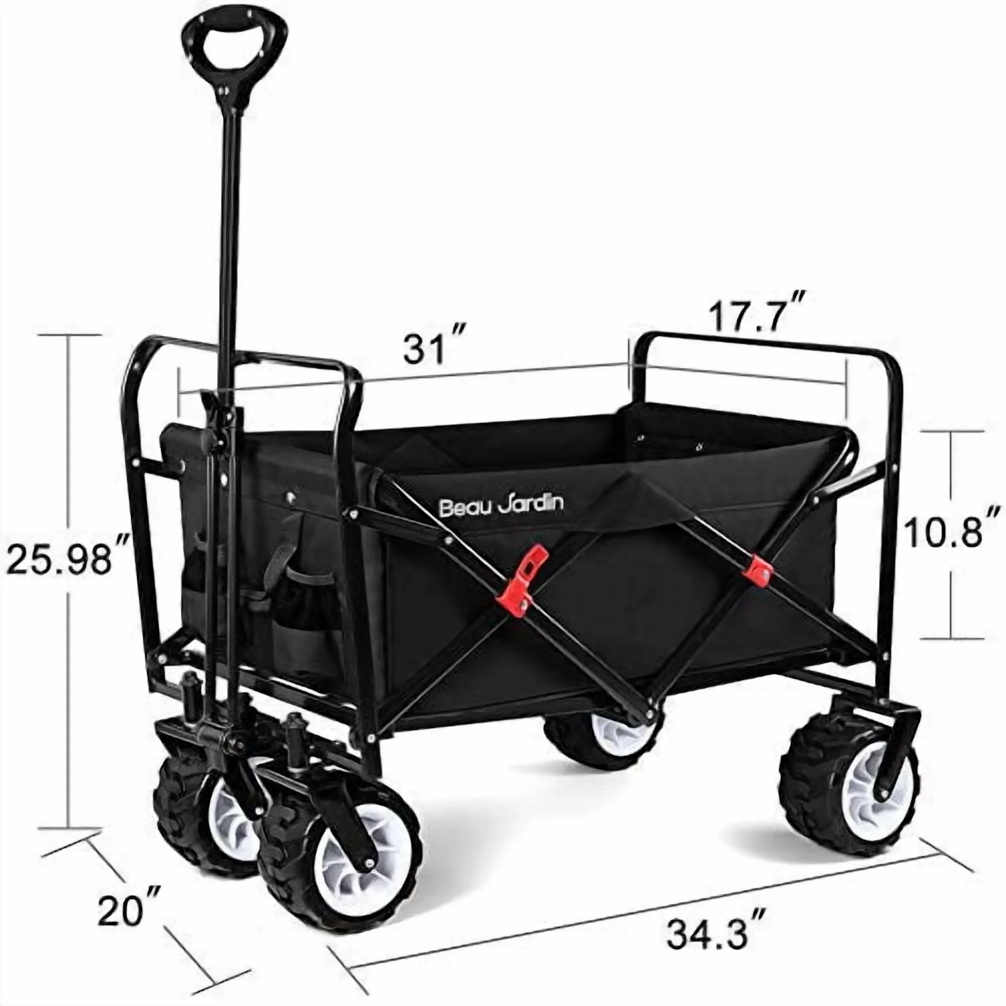 - Large capacity : large load folding beach wagon cart outside dimensions approx 34.3"lx20"wx26.4"h. The collapsible utility wagon cart inside size is 31"lx17.7"wx10.6"h. Ground to the top of the handle is 38.6". Two cups in the fabric cup holders are not included.