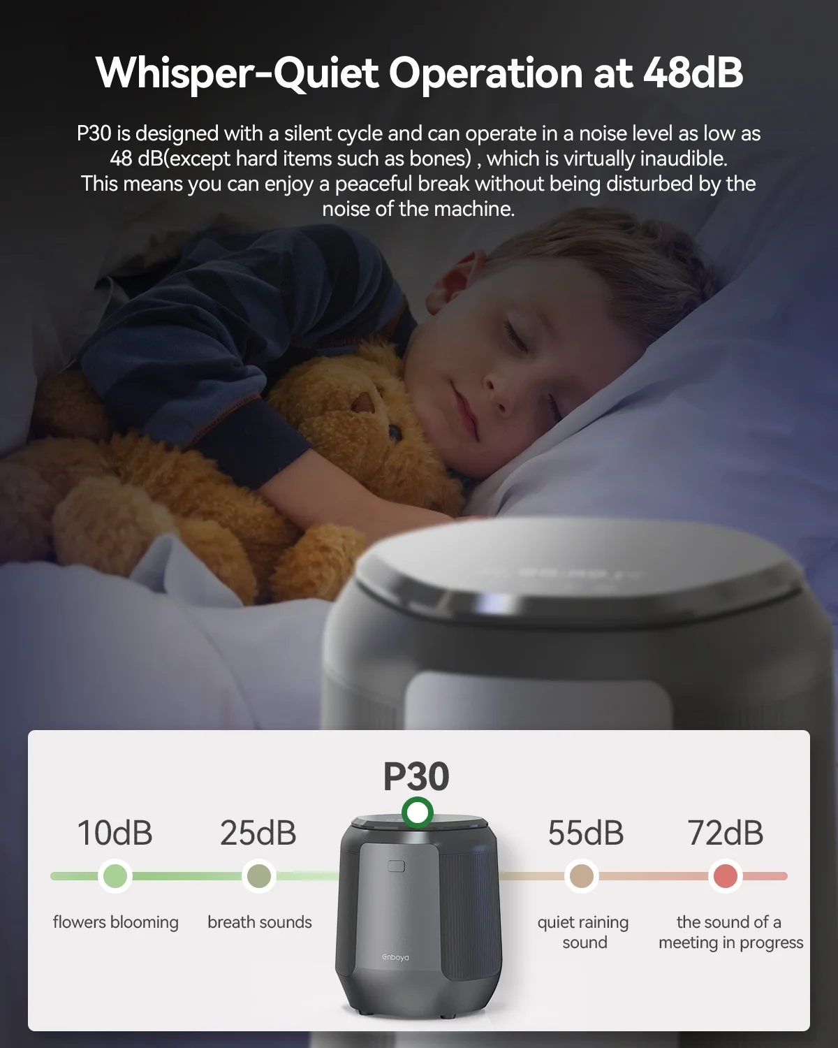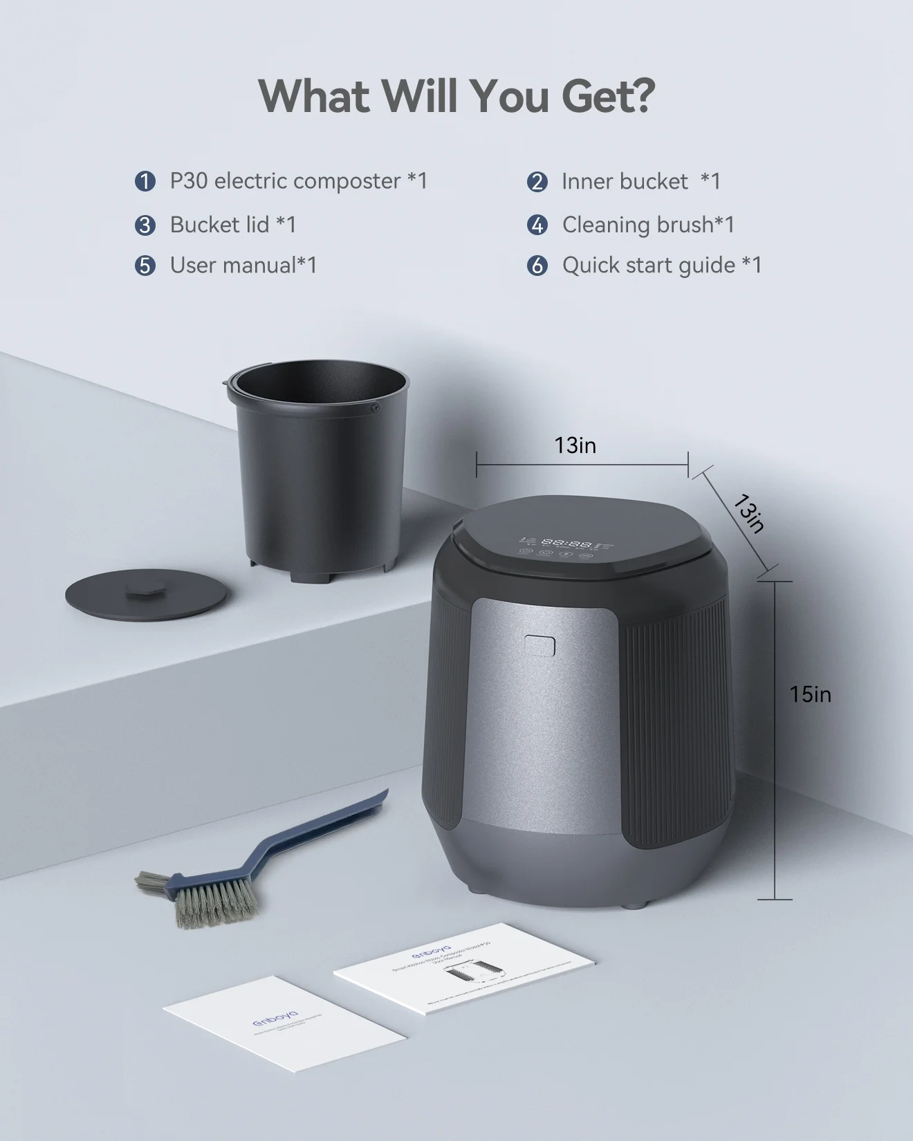 - WHISPER-QUIET OPERATION-COMPOST WITHOUT DISRUPTION: With silent cycle technology, the P30 operates at just 48dB-quieter than a normal conversation (except for hard items like bones). Enjoy a peaceful home without noisy interruptions.