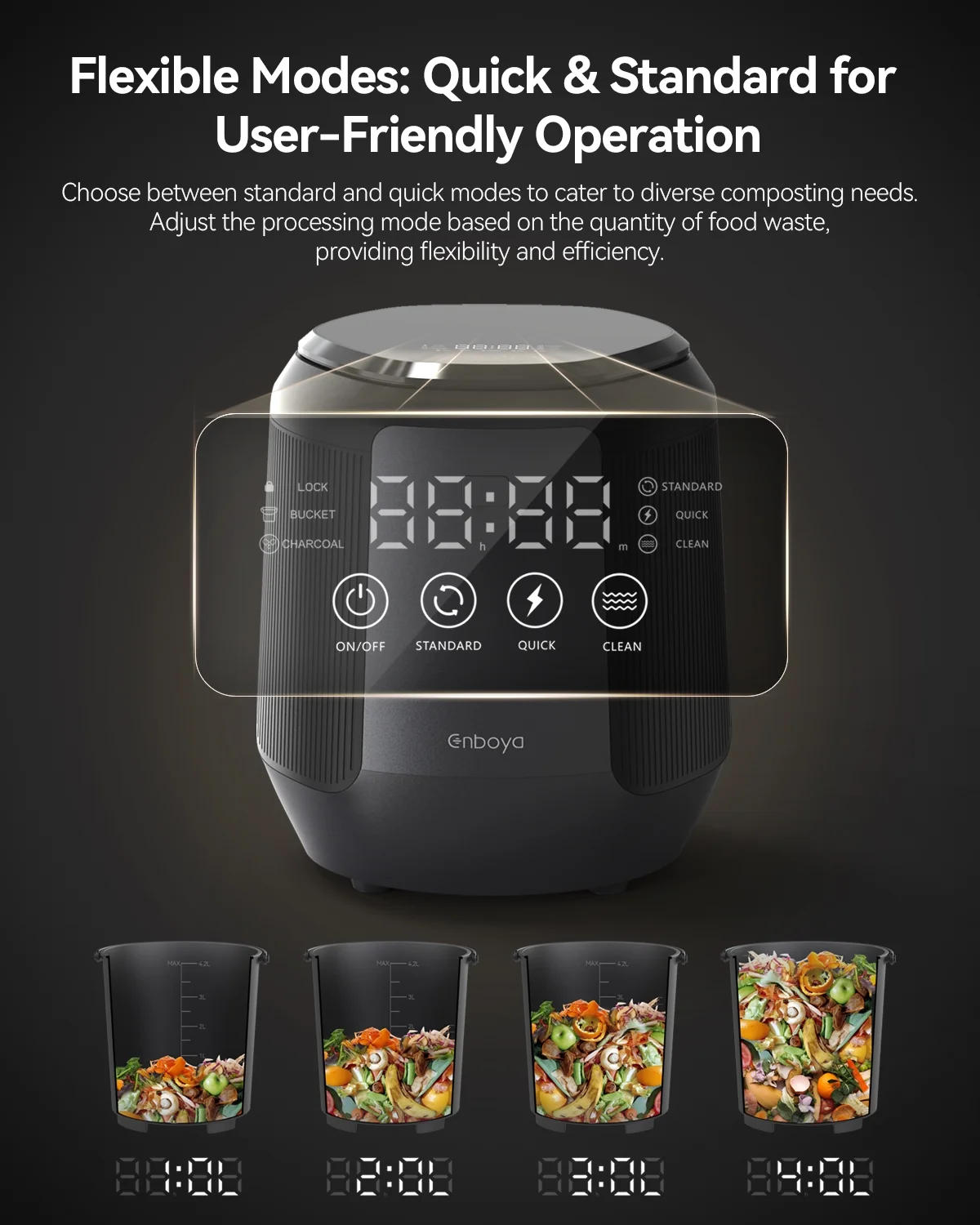 - SMART & SIMPLE-TWO MODES FOR FLEXIBLE COMPOSTING: Choose between Quick Mode for fast results or Standard Mode for thorough processing. The intuitive controls make composting effortless-perfect for beginners and eco-conscious users alike.