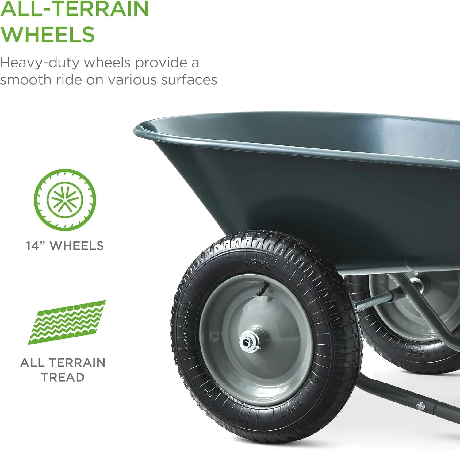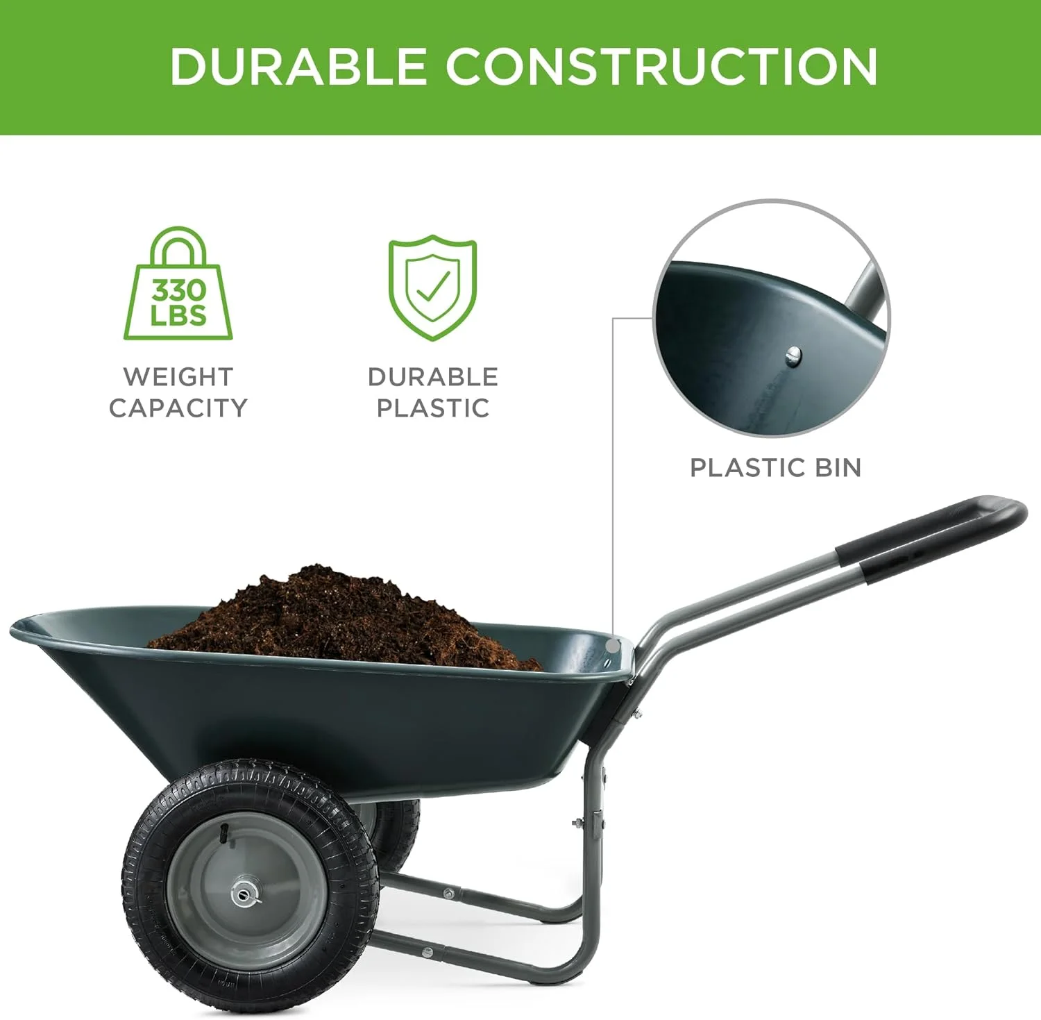 - MULTIPURPOSE GARDEN CART: Deep wheelbarrow holds up to 5 cubic feet of soil, bricks, mulch, gravel, and more, so you can conveniently carry out landscaping and other home improvement projects