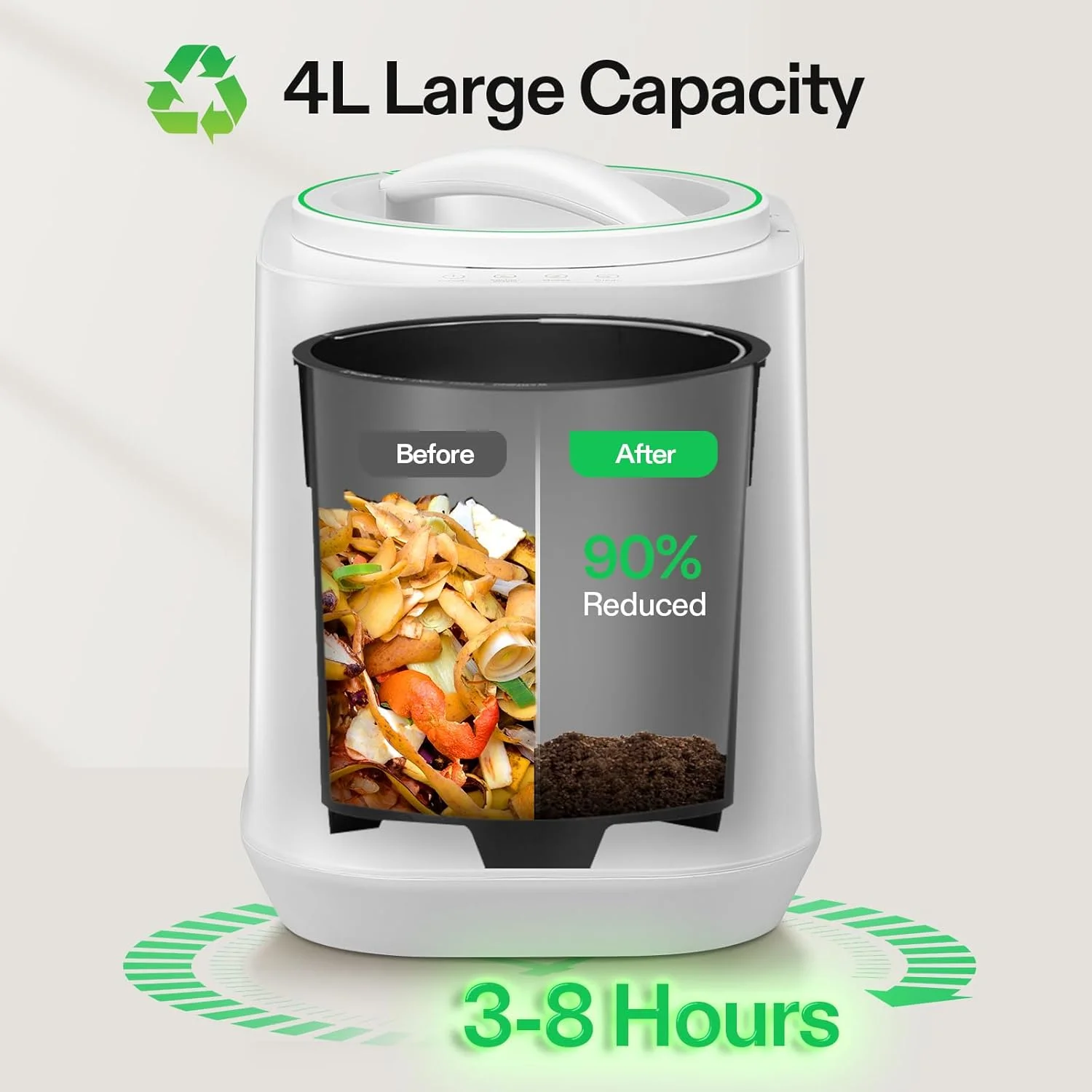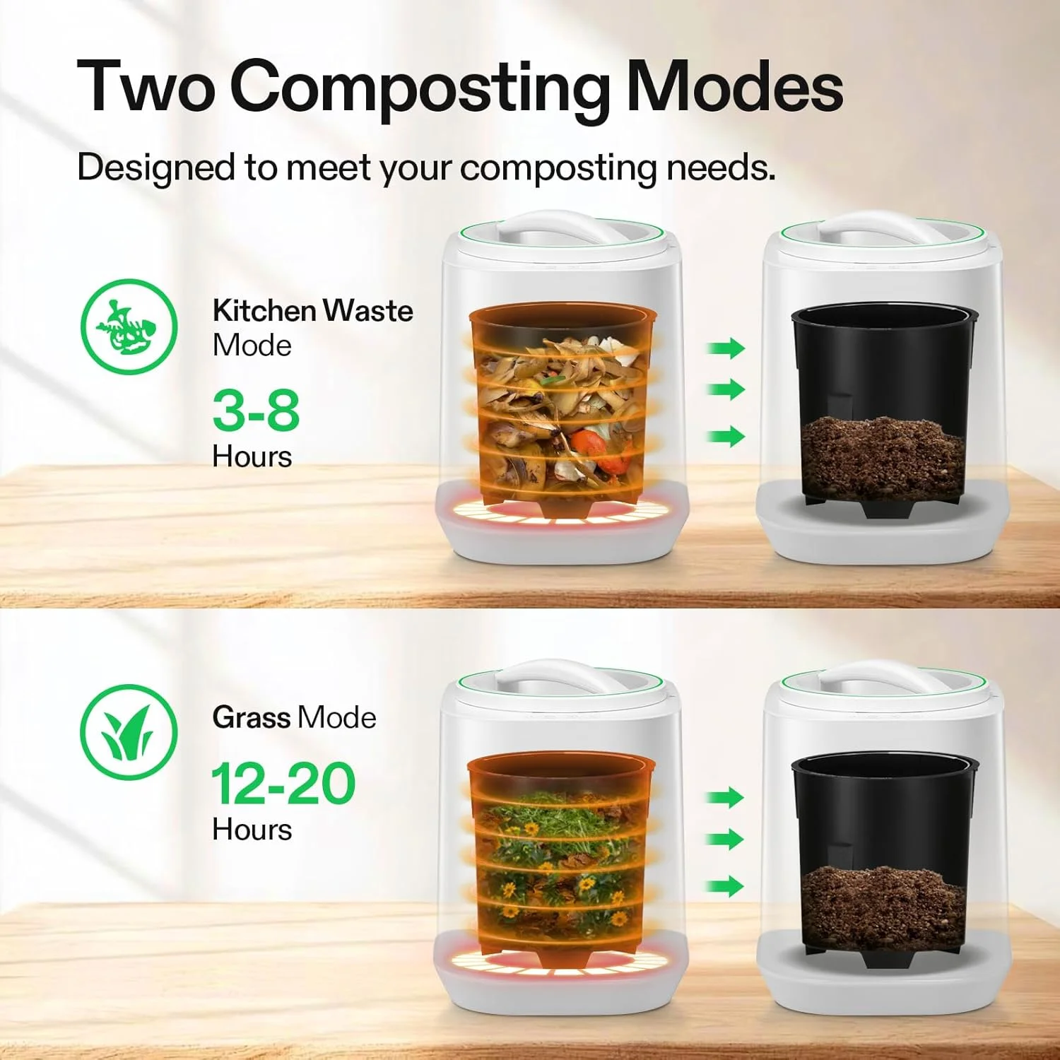 - Efficient Composting: This smart compost bin utilizes high-temperature drying, grinding, and cooling to quickly transform food waste into nutrient-rich compost; The kitchen waste mode creates pre-compost (mix with soil at a 1:10 ratio before use) in 3-8 hours, while the grass mode produces compost in 12-20 hours