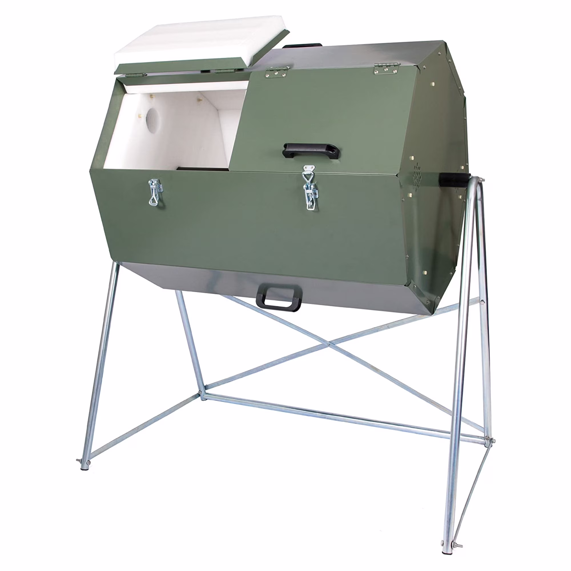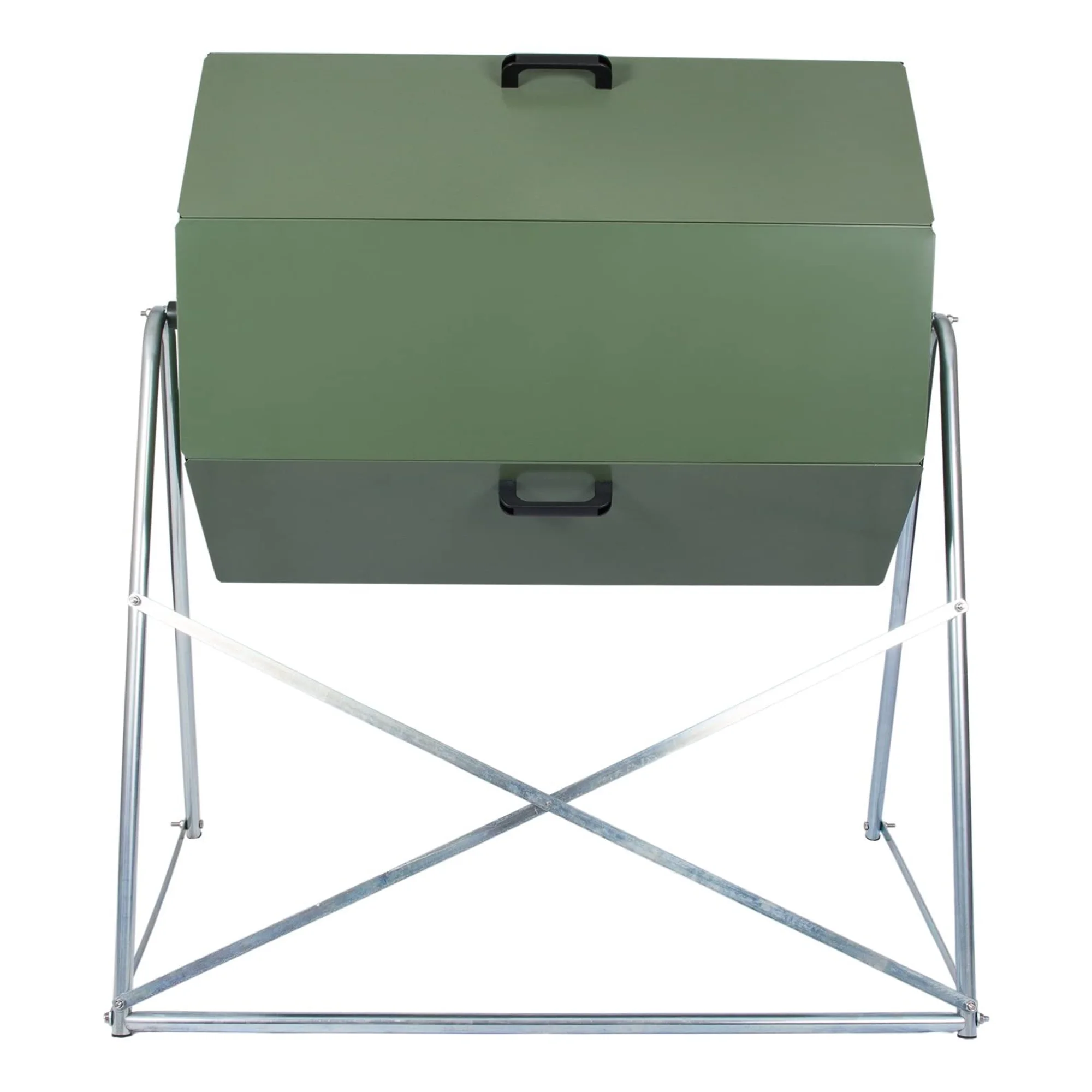 - Composter is divided into 2 chambers; While 1 compost container is being filled, the compost in the other chamber matures