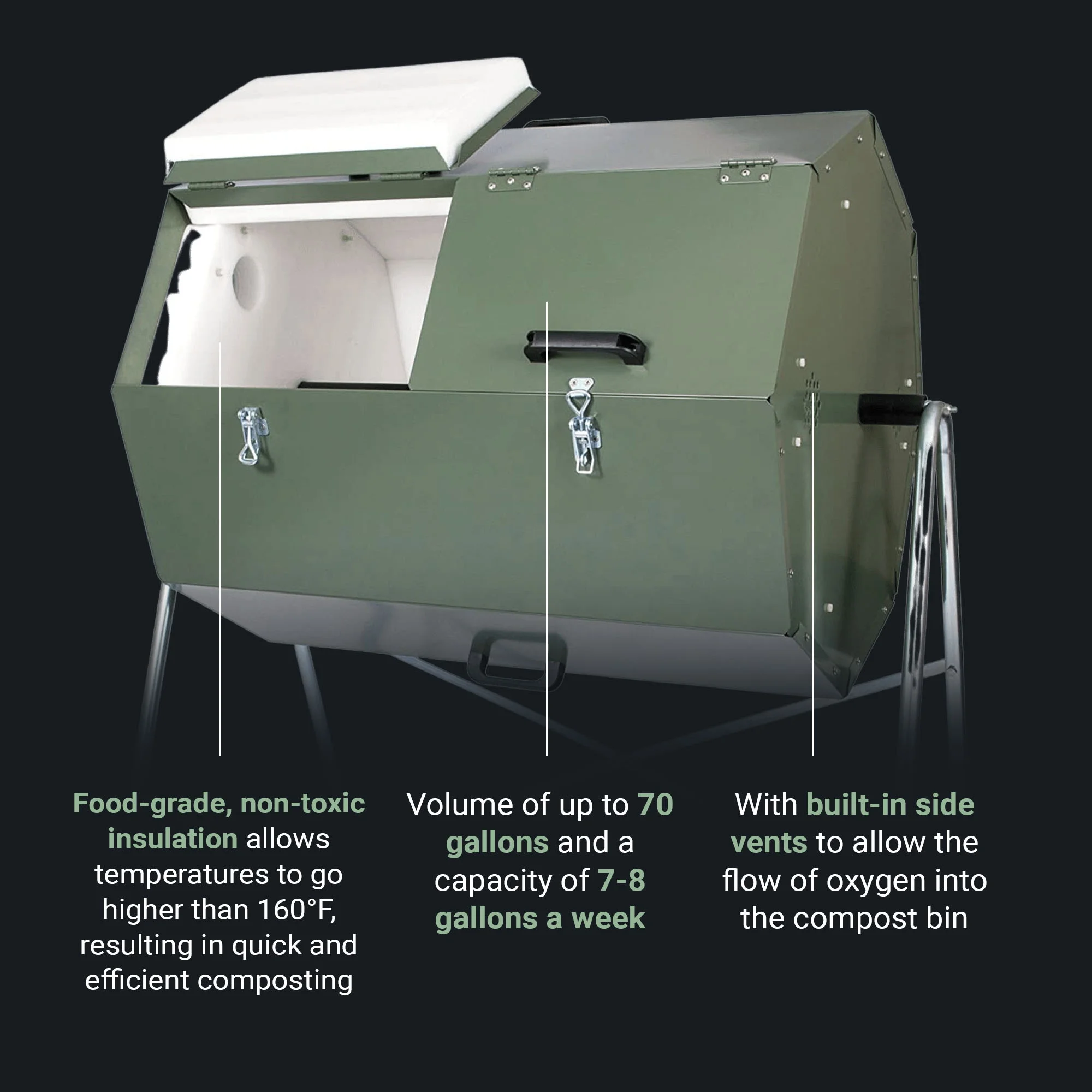 - The JK270A is a large compost bin with a volume of up to 70 gallons and a capacity of 7-8 gallons a week