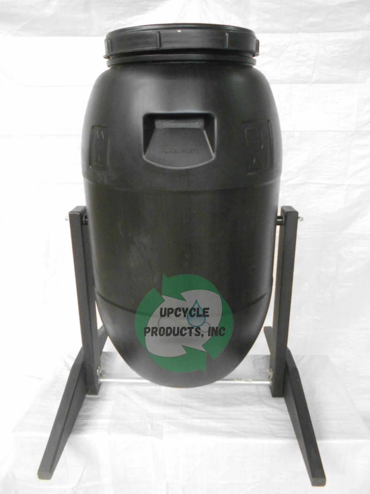 The Upcycle Tumbling Composter is an upcycled food grade barrel set on a rotating axis for easy compost aeration. It is about 4 foot tall and only requires a 3 foot by 4 foot area. You can put it in a smaller area for storage, but you'll need that much space free from obstacles to spin the barrel properly Eliminate back strain with this hip level composter. The best garden tools are those that fit your style. If you prefer to work at waist level, this elevated compost maker is perfect. Using a rocking motion to build momentum, a compost tumbler is relatively easy to turn. Due to the aeration, the initial volume of added content will be reduced in half creating a powerful fertilizer/mulch for your lawn or garden needs. The composter body is made from repurposed High Density Polyethylene Plastic imported food barrels. You can be a part of keeping hard-to-break-down plastics from being added to landfills while also adding back valuable nutrients into the ground with compost.