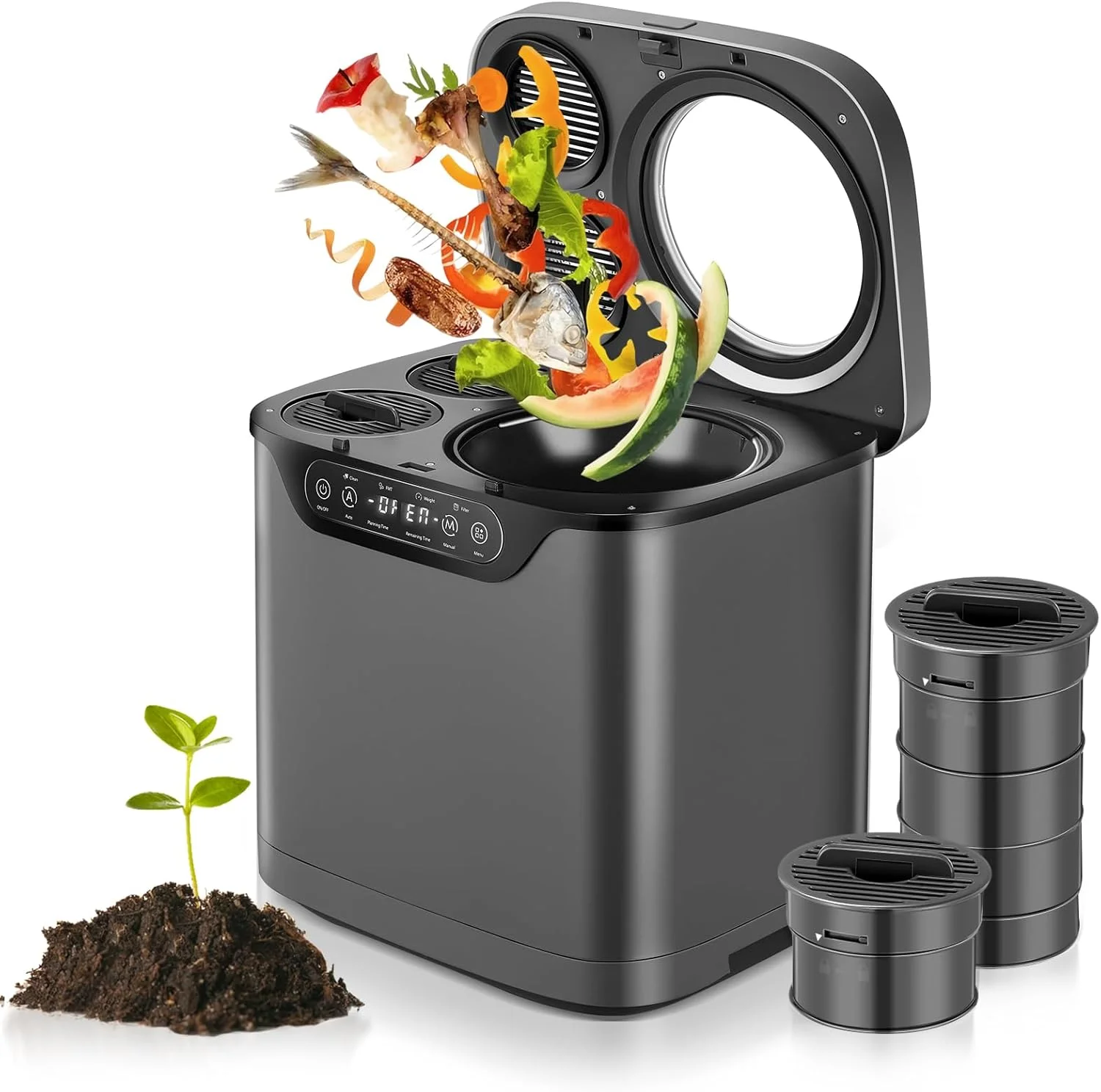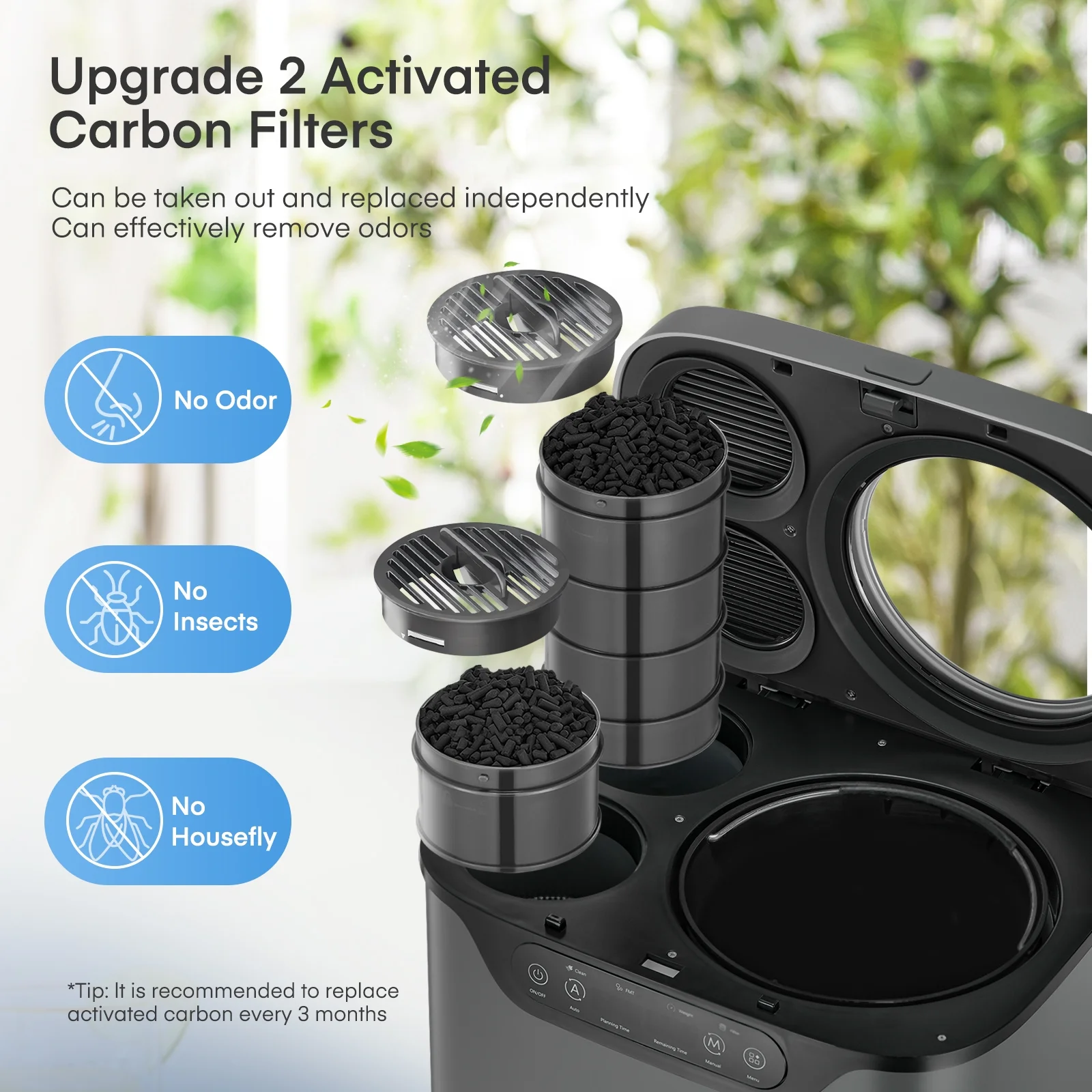 - [Experience Odor-Free Indoor Composting]The built-in activated carbon filter in the food waste composter ensures 100% odor adsorption, and the sealed design further blocks the odor from escaping, keeping your kitchen fresh and clean - ideal for apartments and open kitchens. It is recommended to replace the activated carbon every 3 months to ensure continuous odor-free performance.