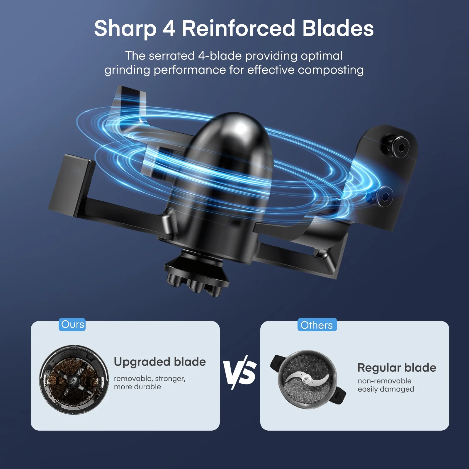 - [Whisper-Quiet]Equipped with low-speed, high-torque blades, this compost machine effortlessly processes food materials like chicken bones, while generating little to no noise, allowing you to run cycles at night. Whether you want to reduce your carbon footprint or are looking for gifts for family and friends, FOHERE's electric compost bin is an ideal choice!
