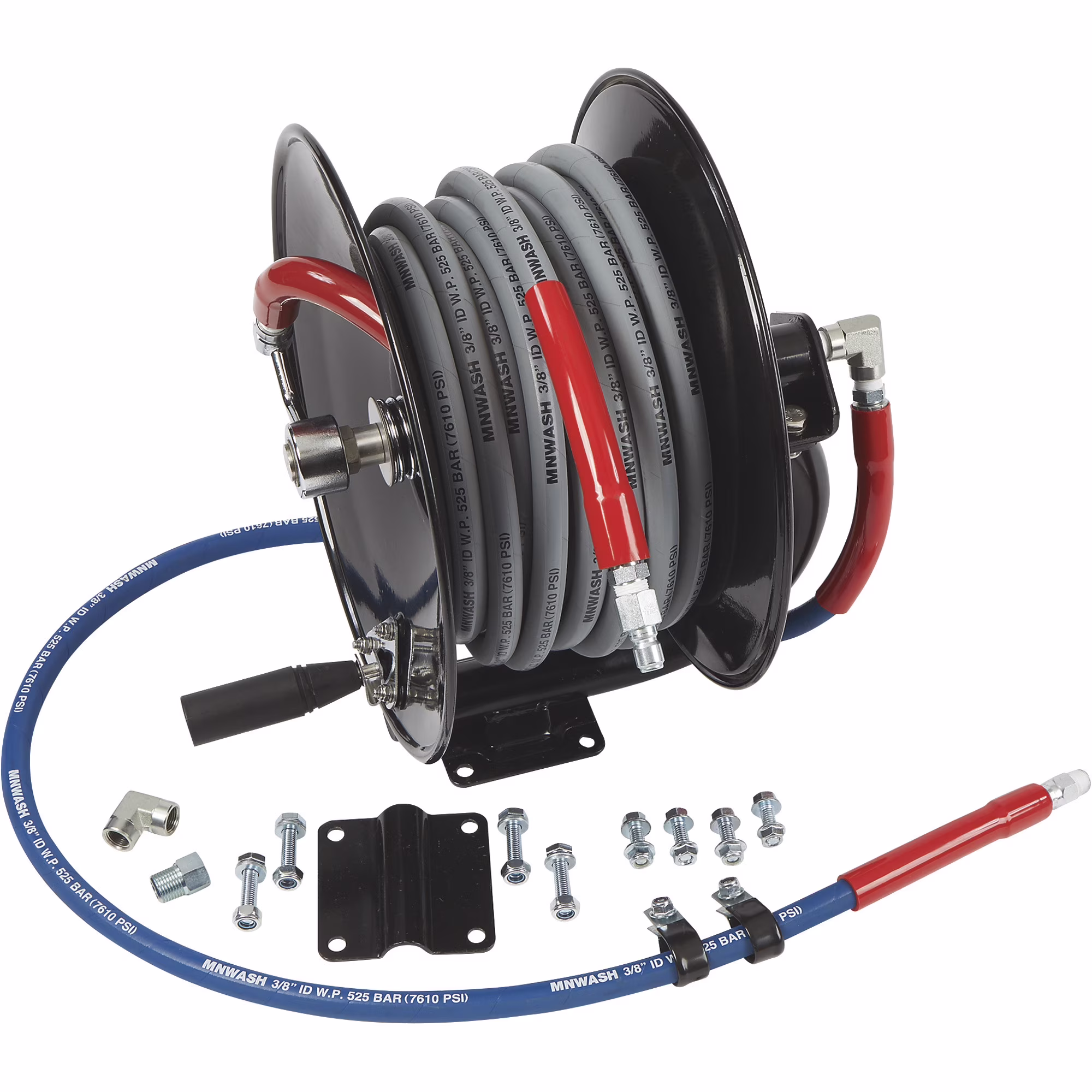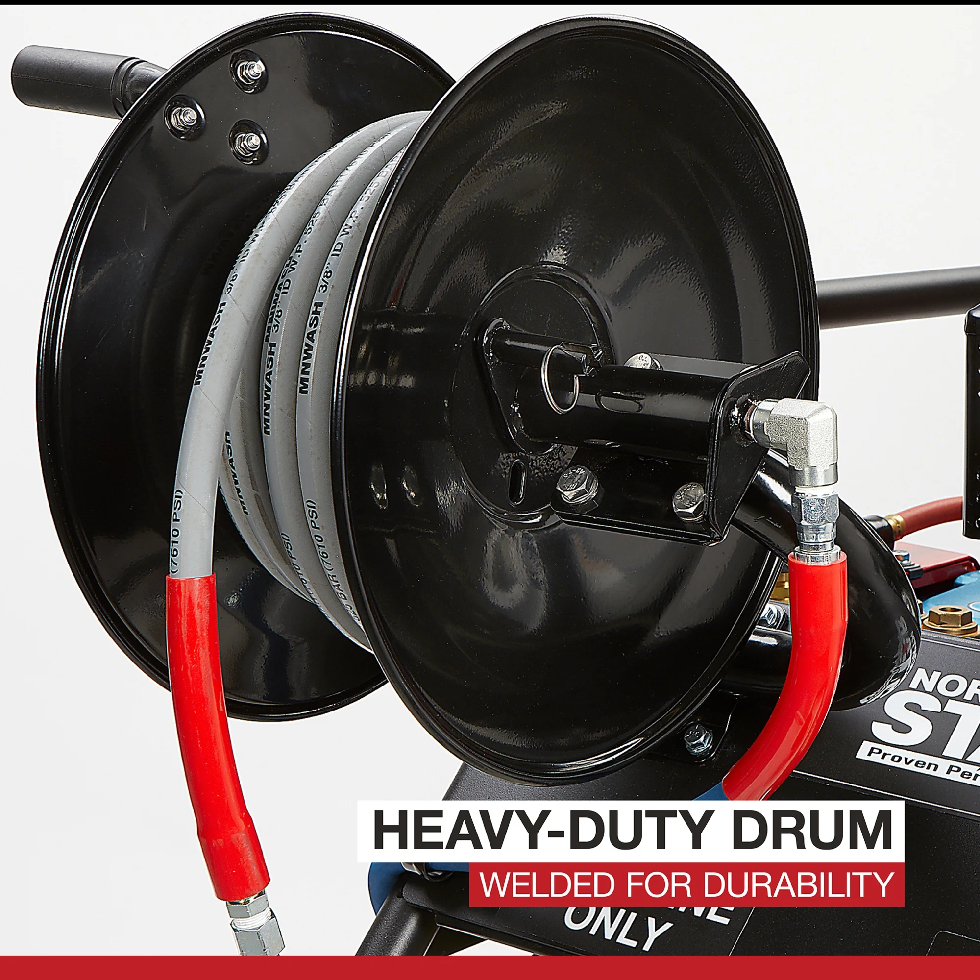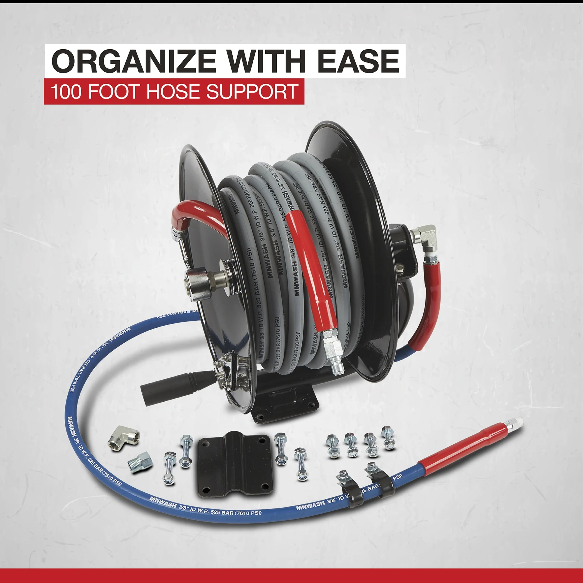 - Holds up to 100ft. hose �� includes 50ft. non-marking steel-braided reinforced high-pressure hose with quick connects