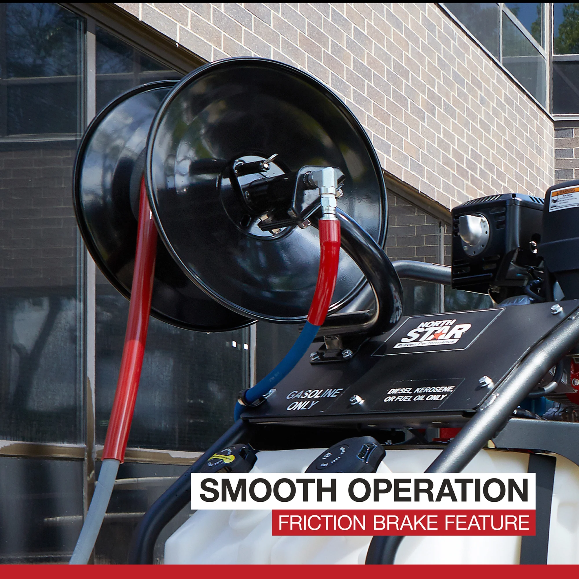 - Friction brake and drum pin lock helps prevent unintentional hose unreeling