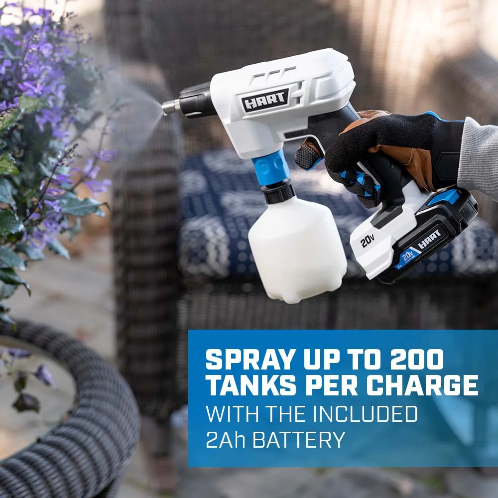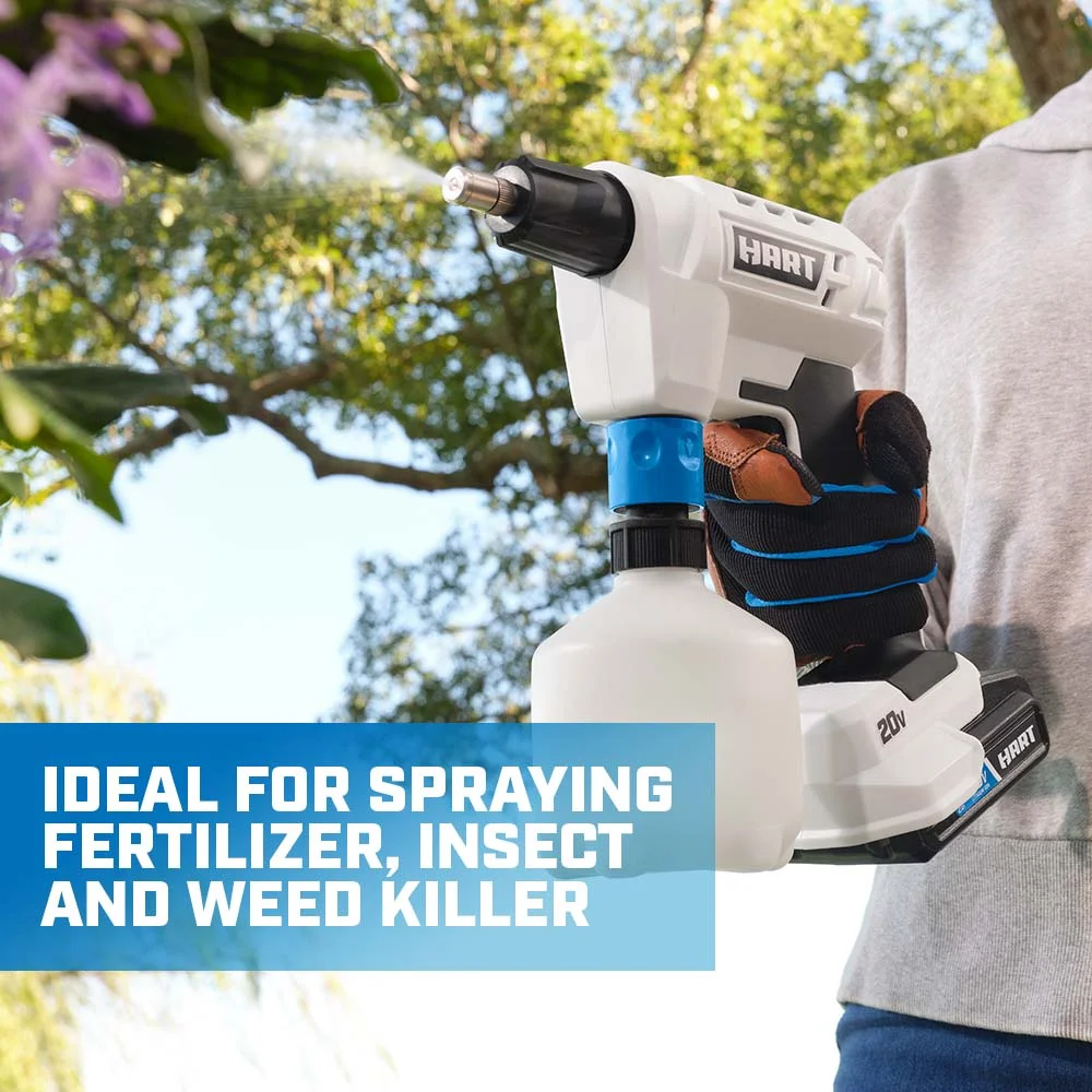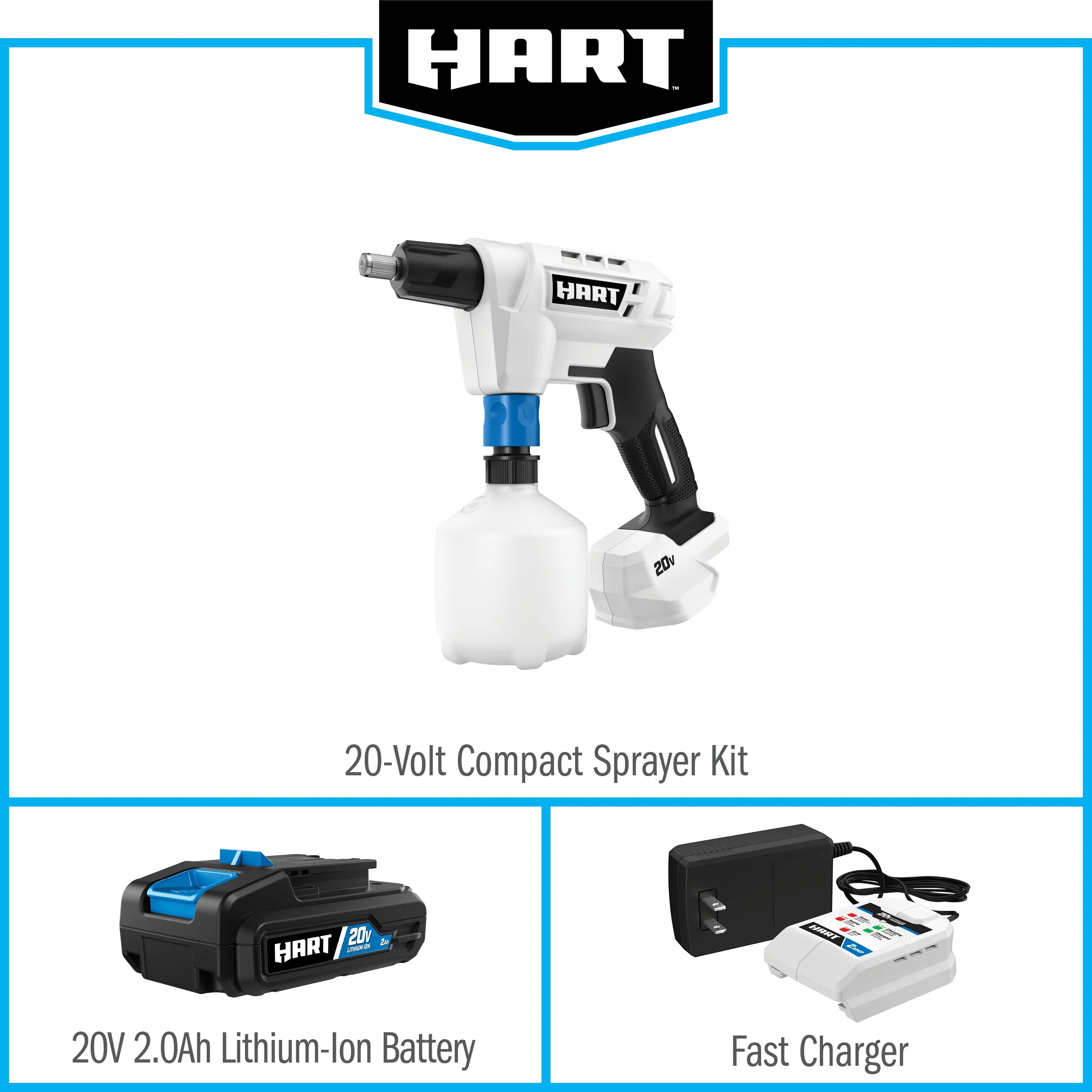 Get rid of unwanted weeds and pests, or simply water your plants quickly and efficiently with HART��s cordless Compact Sprayer Kit. This battery-powered sprayer works best with insecticides, fungicides and herbicides. Featuring an adjustable nozzle that allows you to switch from a stream pattern to a fine mist spray for spot treatment on your lawn to prevent brown spots, weed killing around driveways and sidewalks, killing most types of insects, and watering your plants around the house. It also sprays particles up to 20 ft. away for hard-to-reach areas. The first time you pick it up, you'll quickly notice how lightweight (just 2.47 lbs. with a full half-liter tank) and compact it is to use. Plus, it��s cordless, so you can move about without tripping over cords. The included 20V 2.0Ah Lithium-ion Battery covers up to 200 tanks per charge! It also runs on the same 20V platform, so the same battery works with ALL HART 20V tools. Includes: 20V Compact Sprayer, 2.0Ah Battery, Fast Charger & Operator��s Manuals. HGSP081VNM *Electric, Battery Powered, 20 Volt