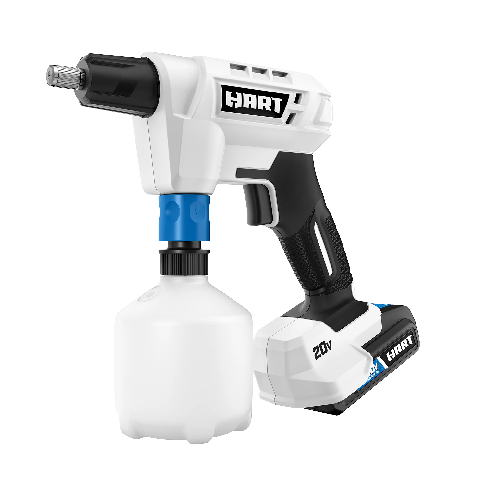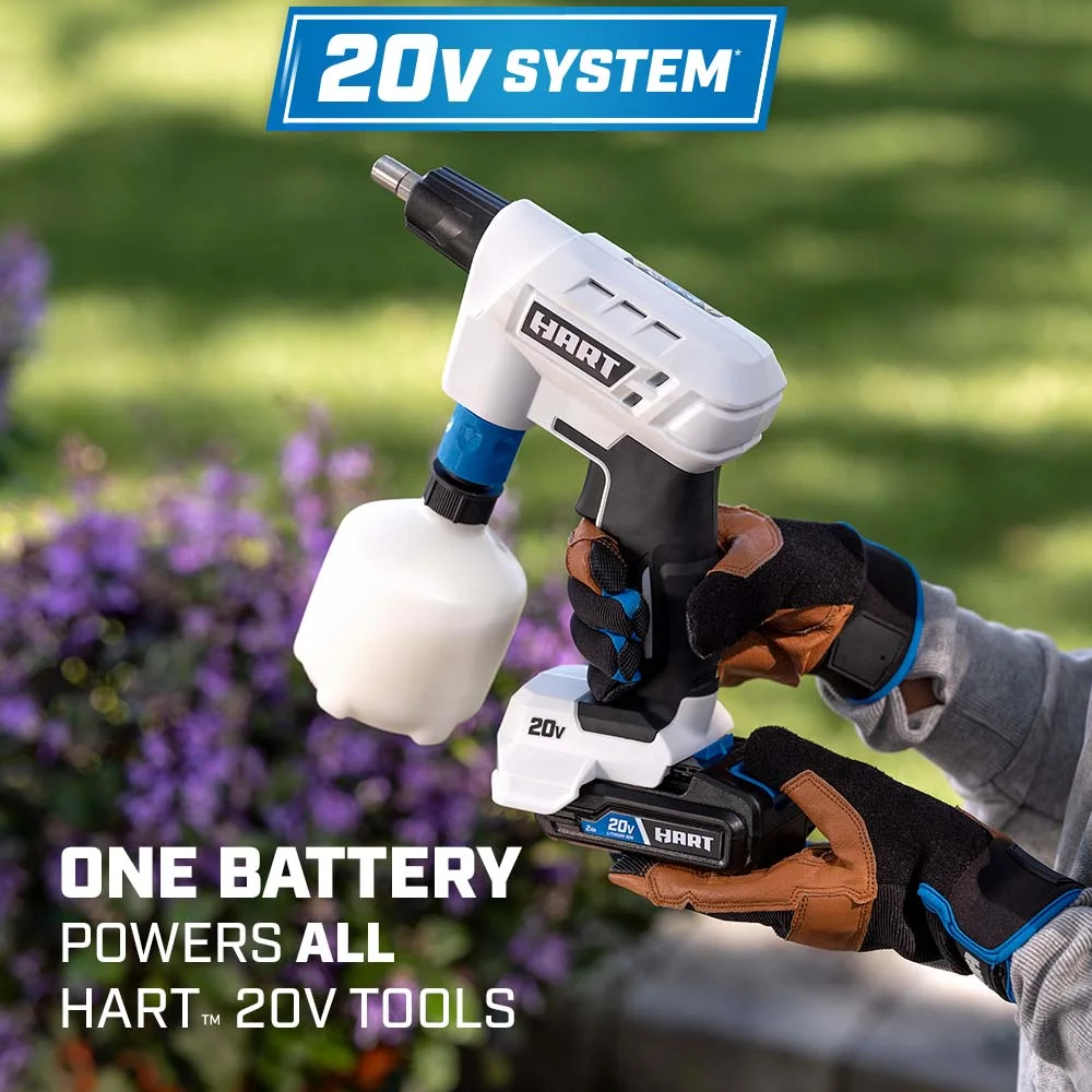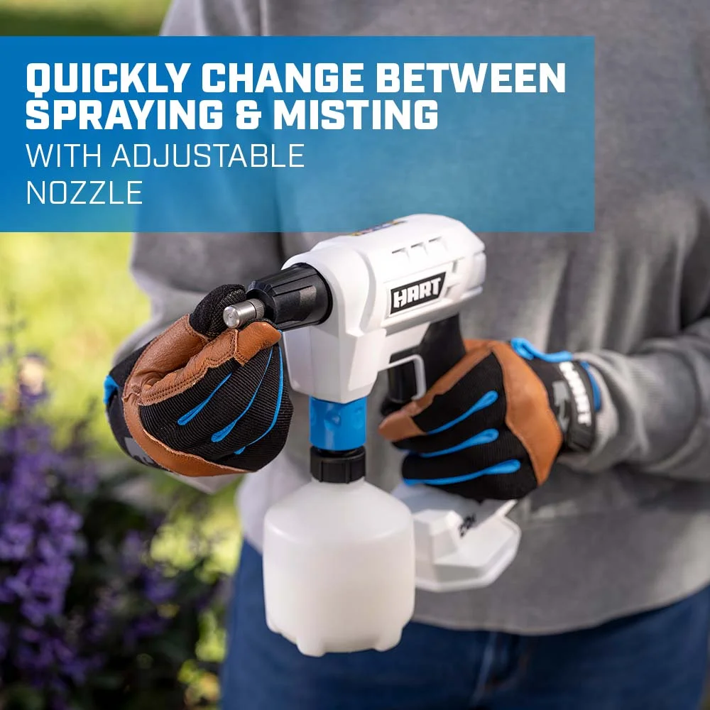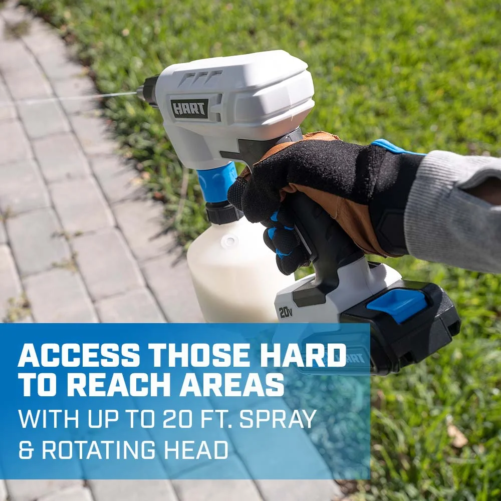 Get rid of unwanted weeds and pests, or simply water your plants quickly and efficiently with HART��s cordless Compact Sprayer Kit. This battery-powered sprayer works best with insecticides, fungicides and herbicides. Featuring an adjustable nozzle that allows you to switch from a stream pattern to a fine mist spray for spot treatment on your lawn to prevent brown spots, weed killing around driveways and sidewalks, killing most types of insects, and watering your plants around the house. It also sprays particles up to 20 ft. away for hard-to-reach areas. The first time you pick it up, you'll quickly notice how lightweight (just 2.47 lbs. with a full half-liter tank) and compact it is to use. Plus, it��s cordless, so you can move about without tripping over cords. The included 20V 2.0Ah Lithium-ion Battery covers up to 200 tanks per charge! It also runs on the same 20V platform, so the same battery works with ALL HART 20V tools. Includes: 20V Compact Sprayer, 2.0Ah Battery, Fast Charger & Operator��s Manuals. HGSP081VNM *Electric, Battery Powered, 20 Volt